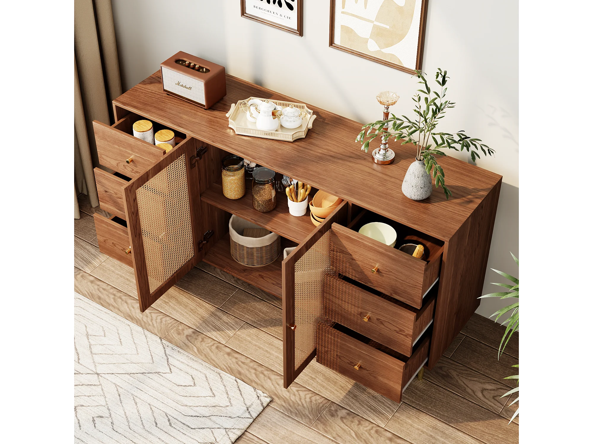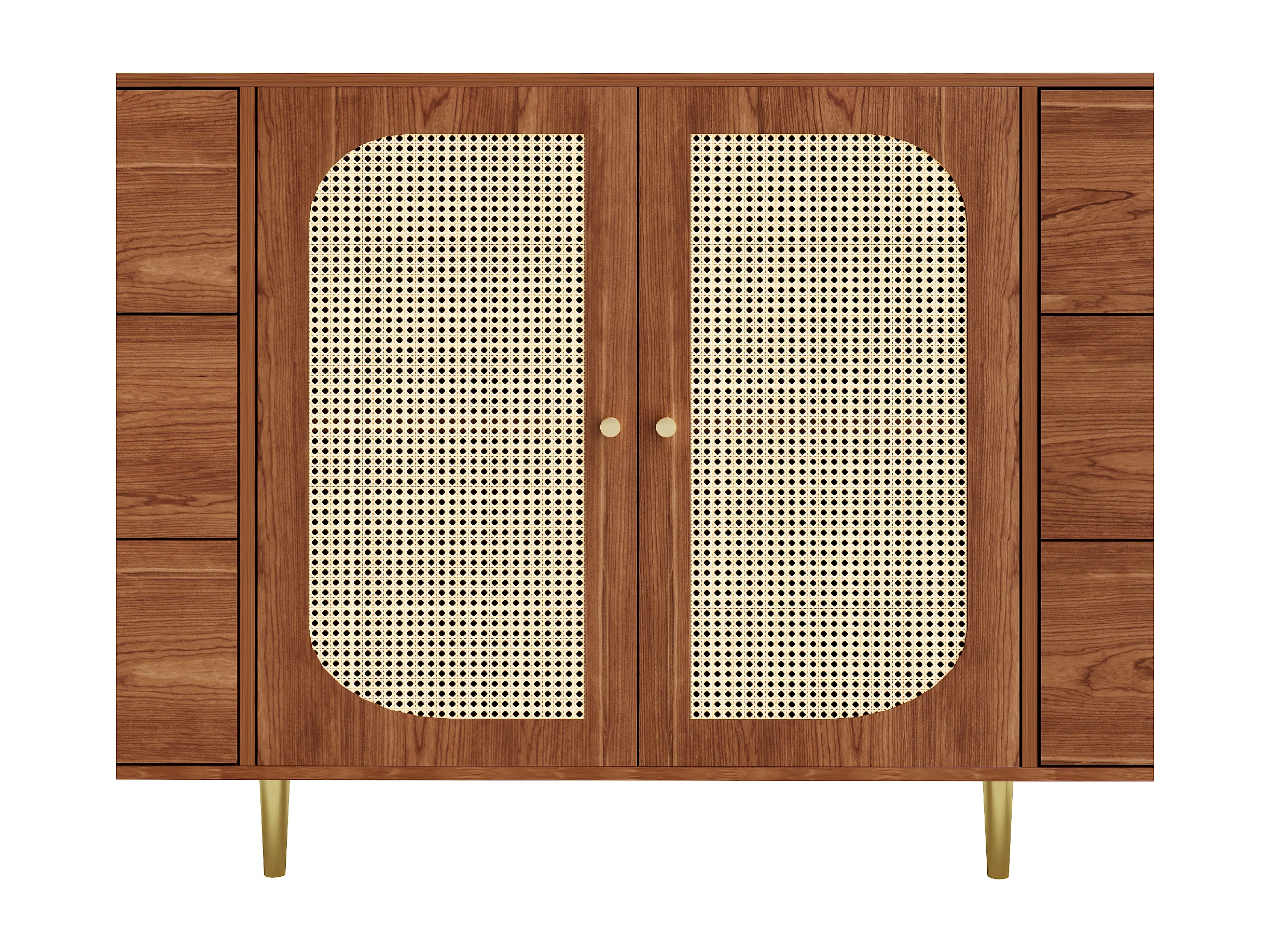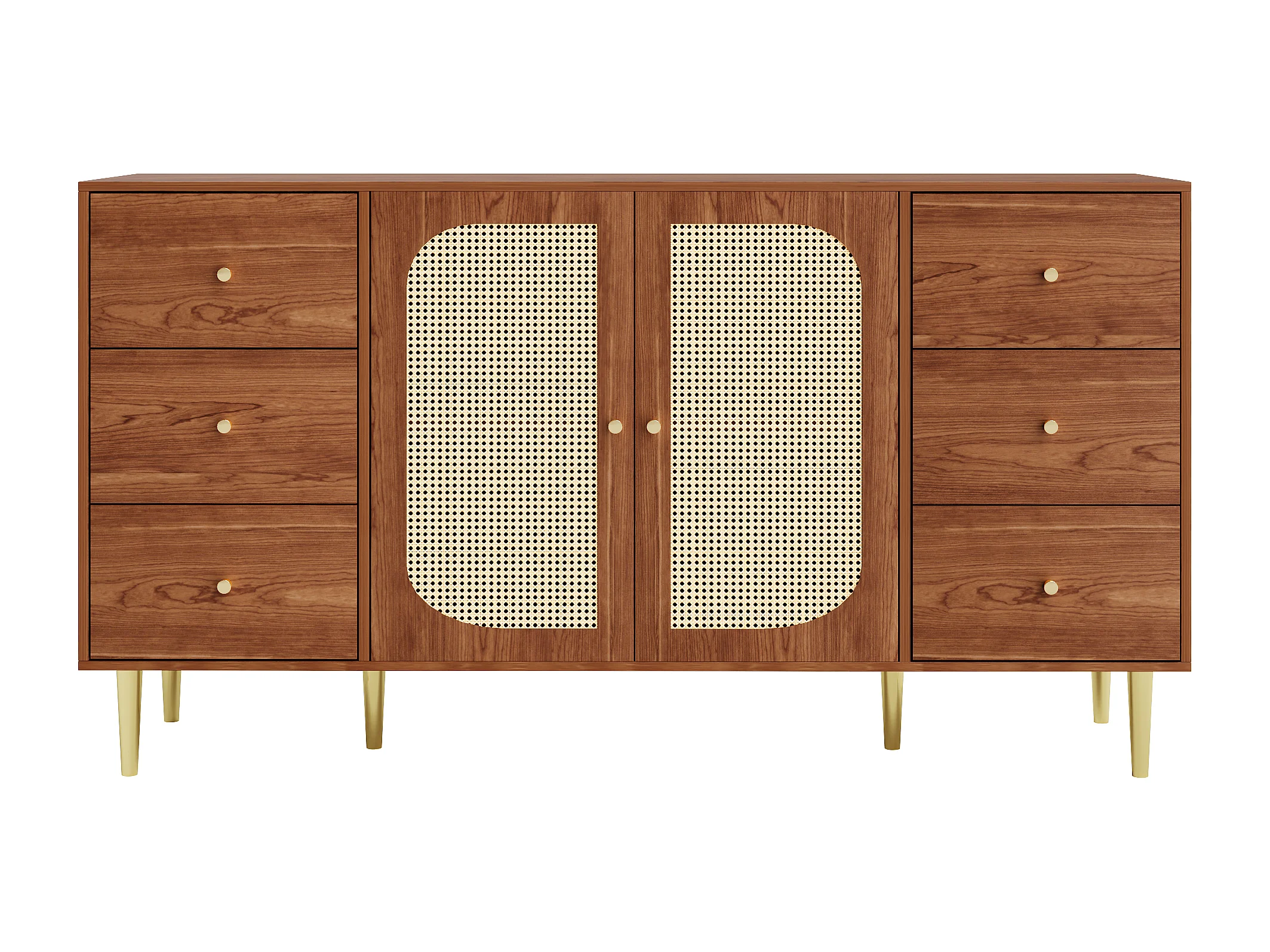 Buffet 160x40x75 cm 2 portes en rotin 6 tiroirs rangement - poignées et pieds en doré - marron