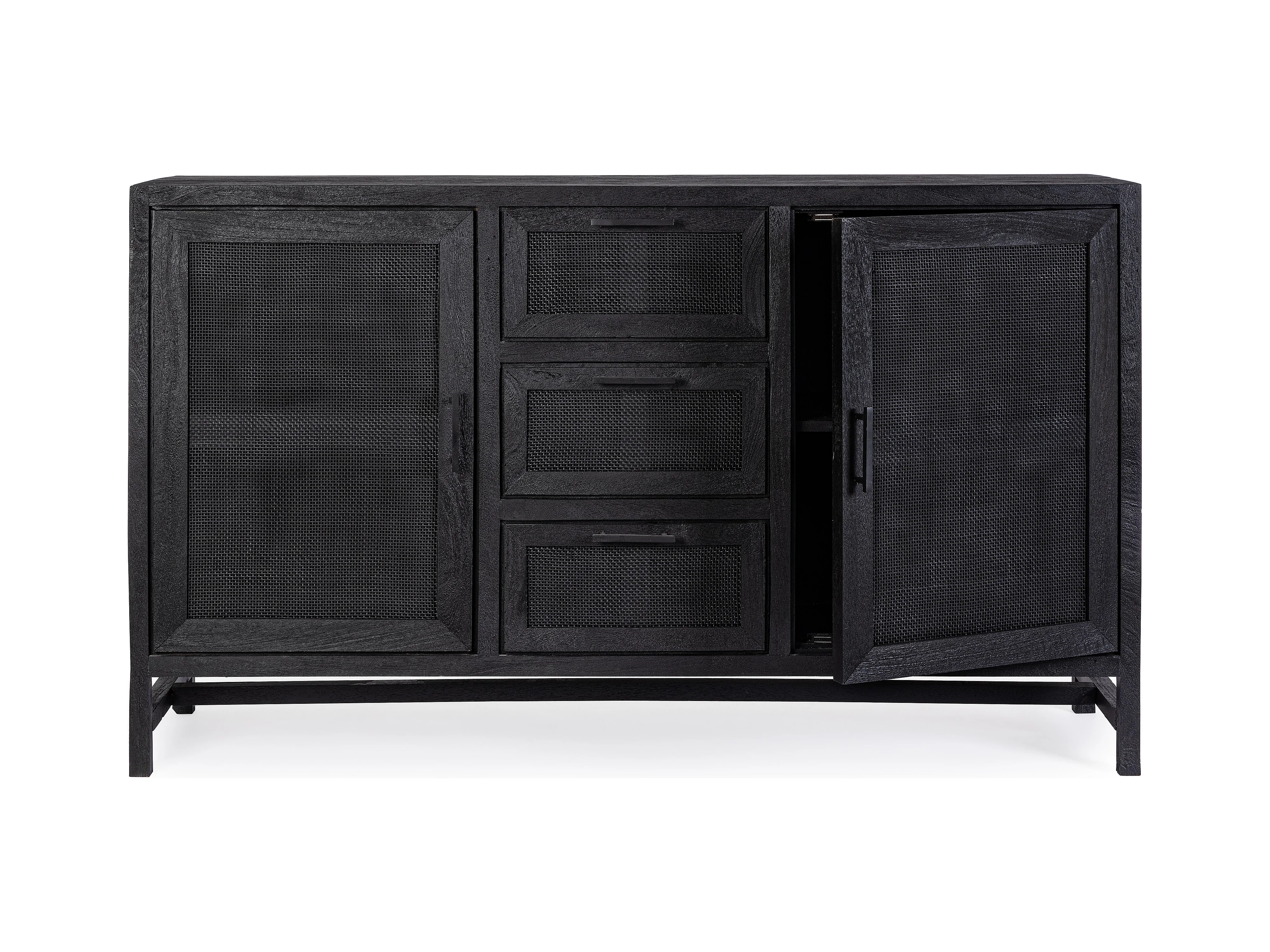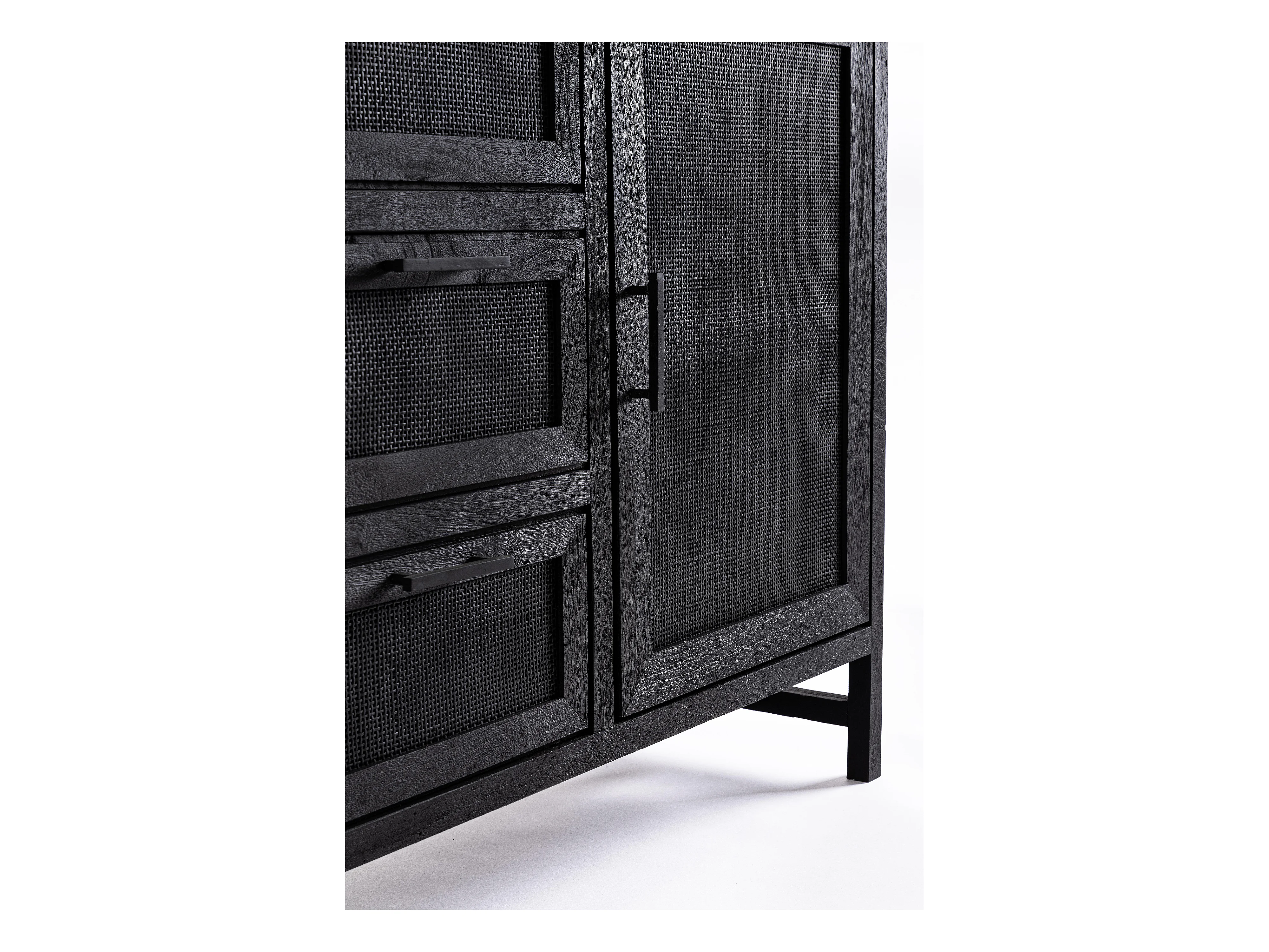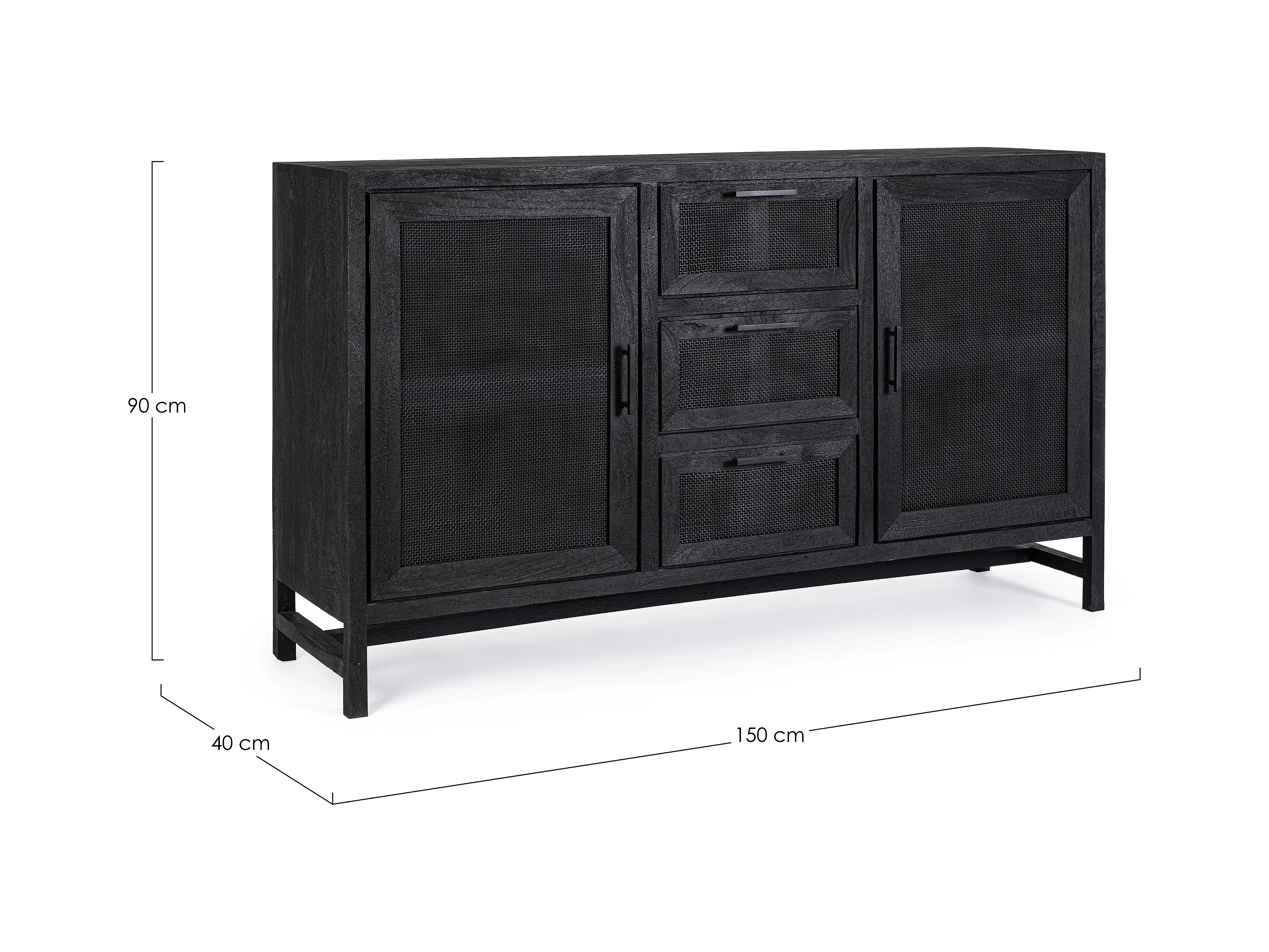 Buffet 2 portes 3 tiroirs en bois massif noir de manguier et rotin noir Waky 150cm