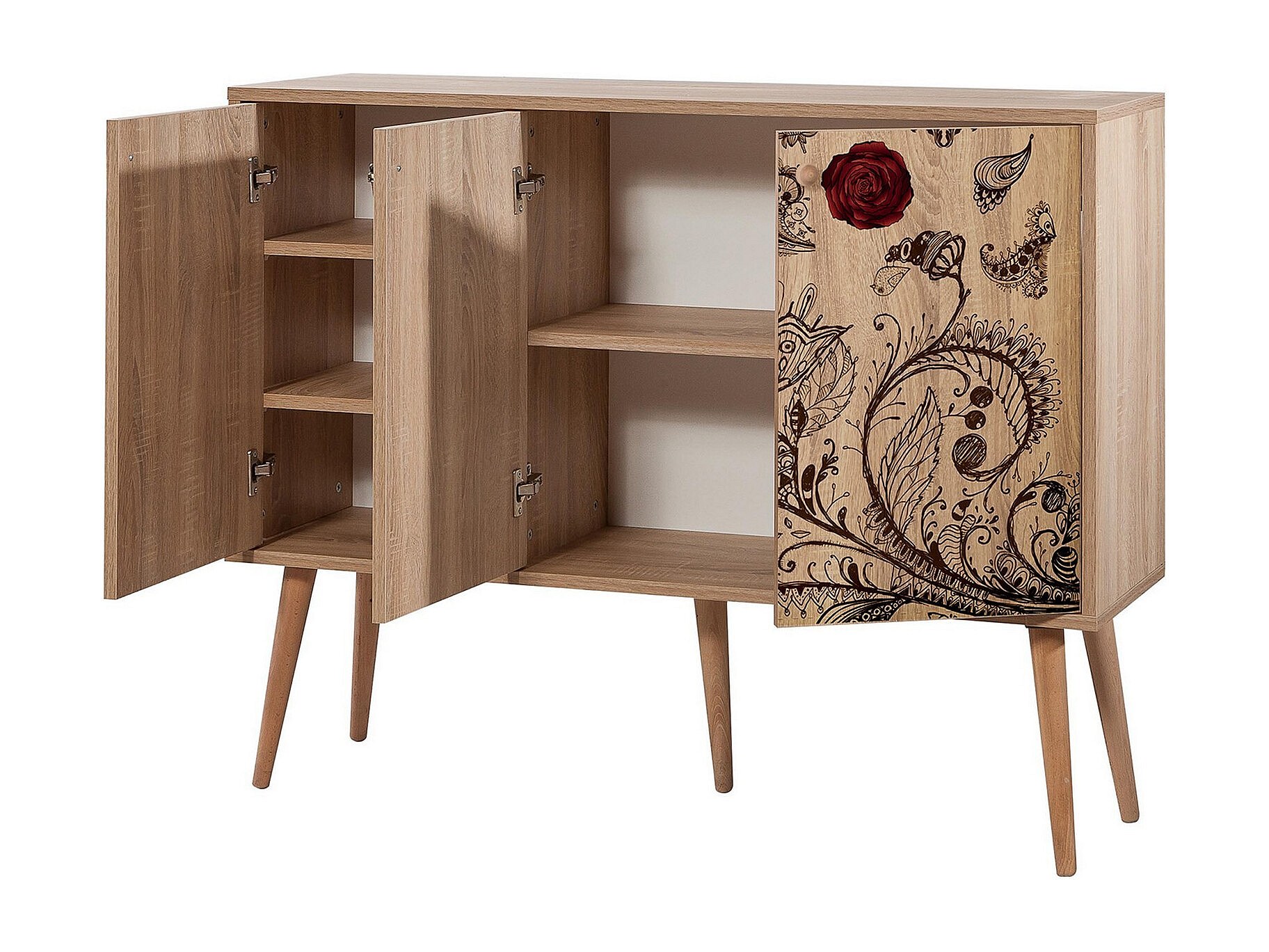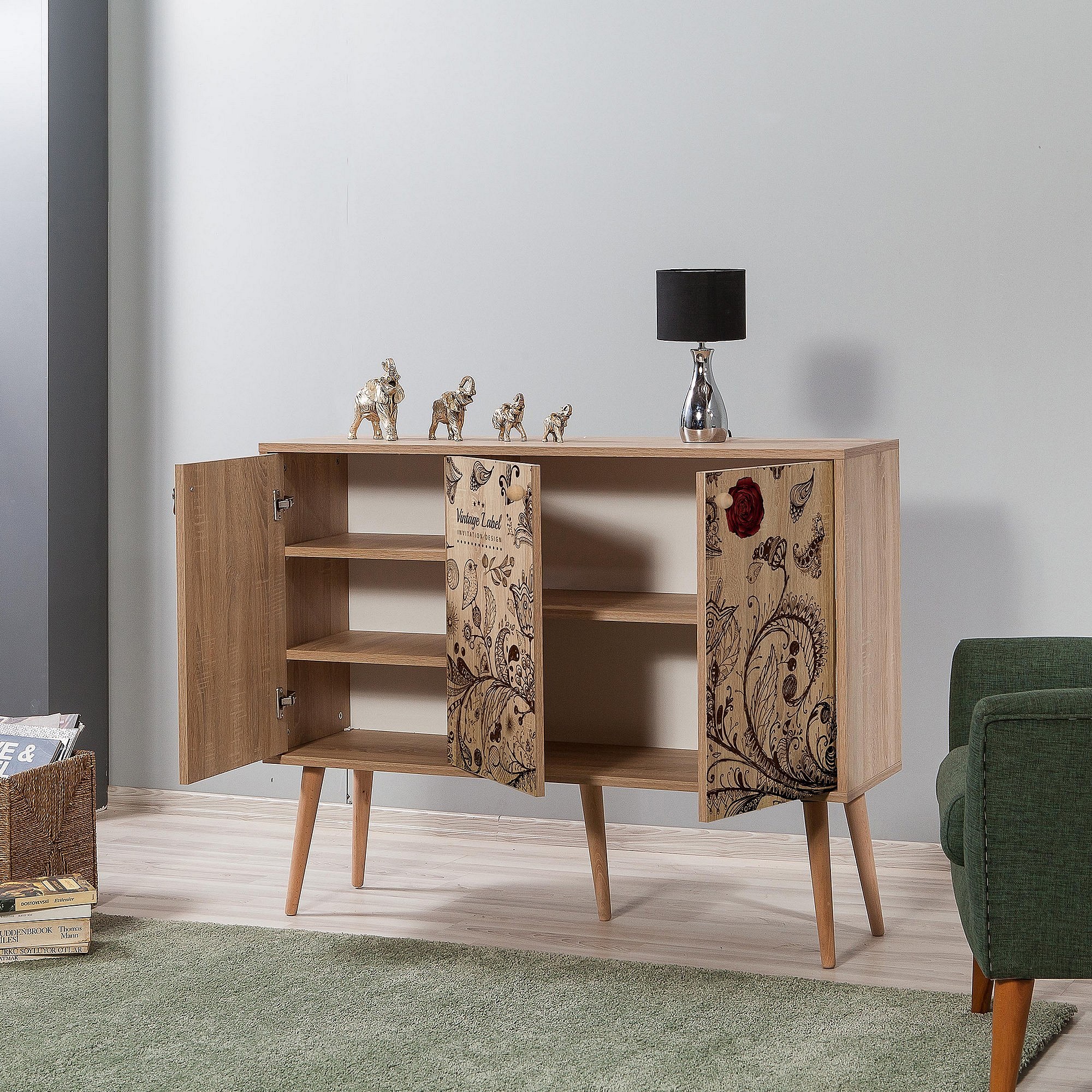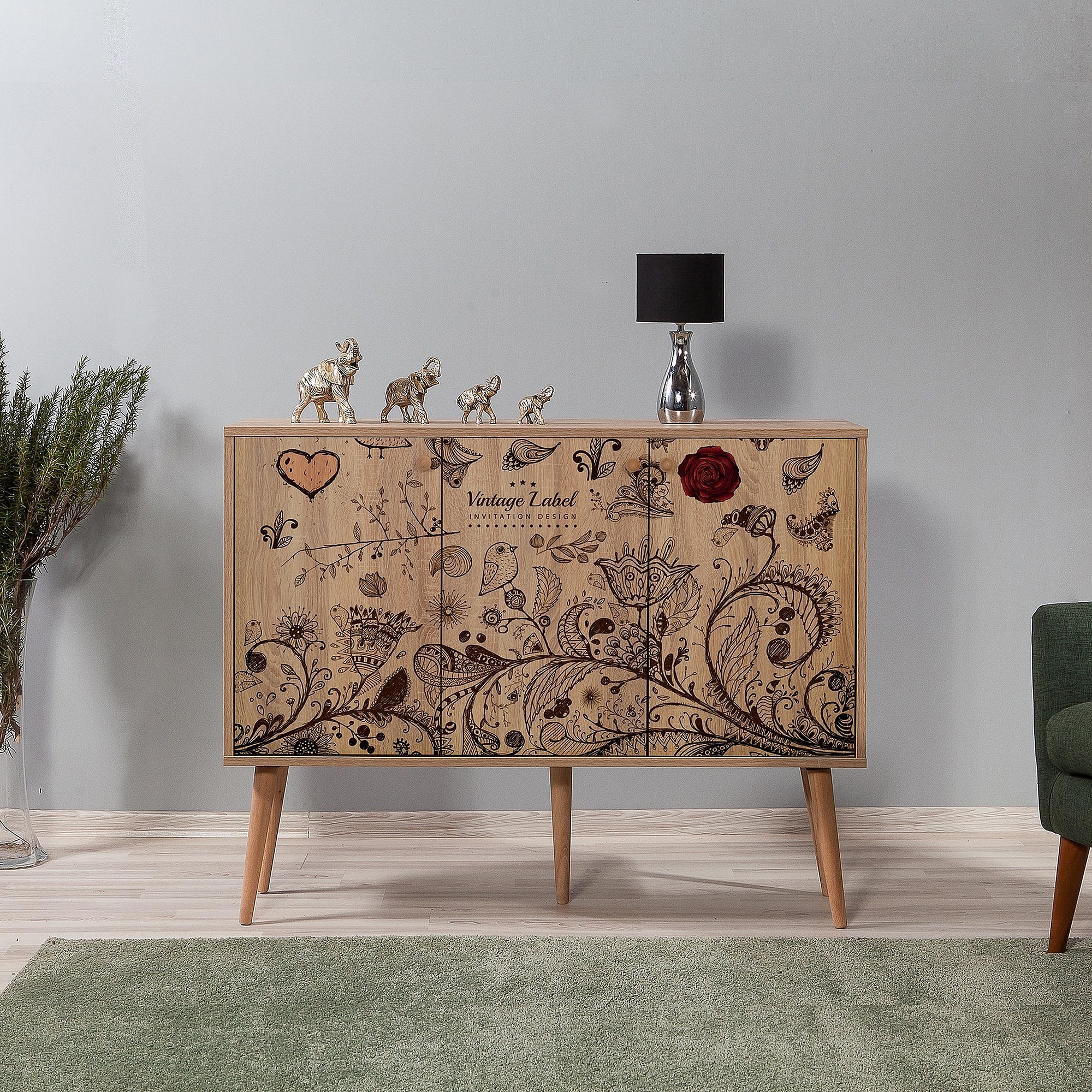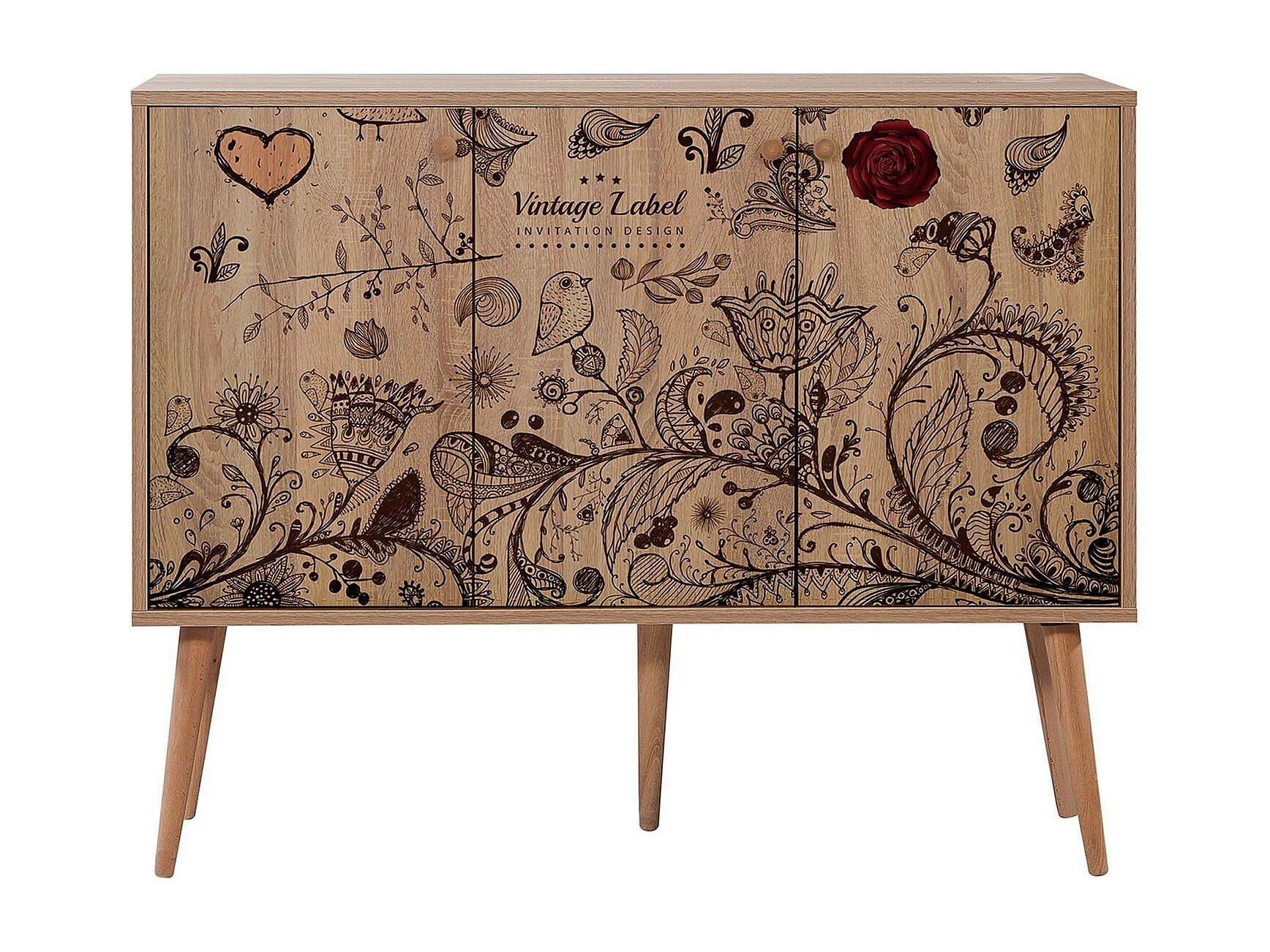 Buffet 3 portes Areva 120x90cm Motif 'Vintage label' Bois Naturel et Bleu