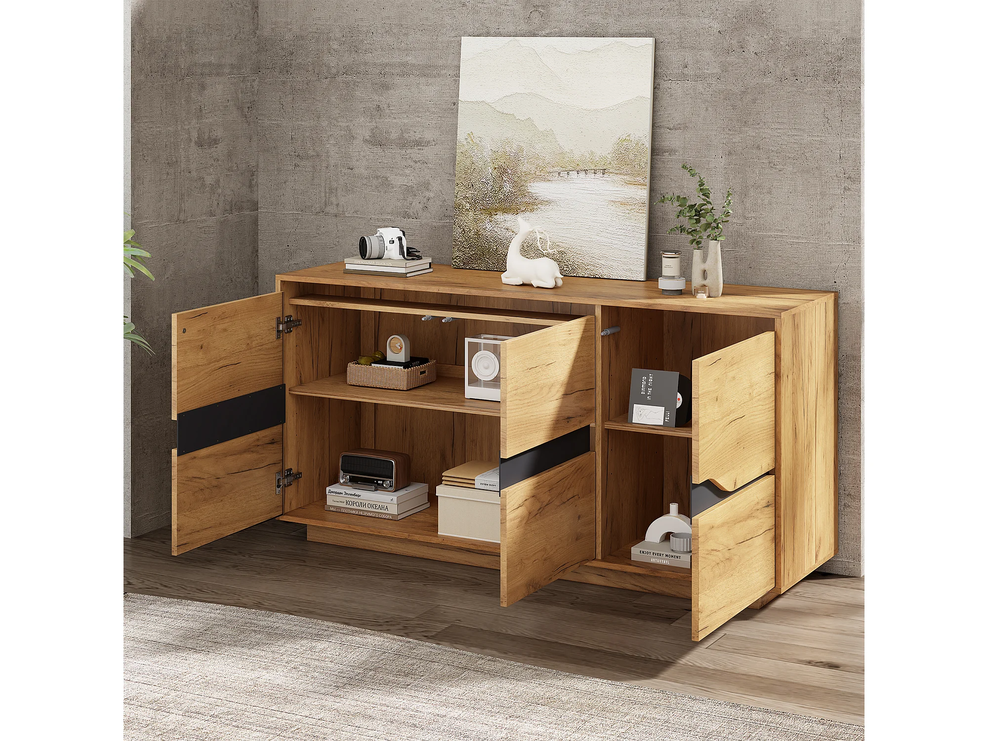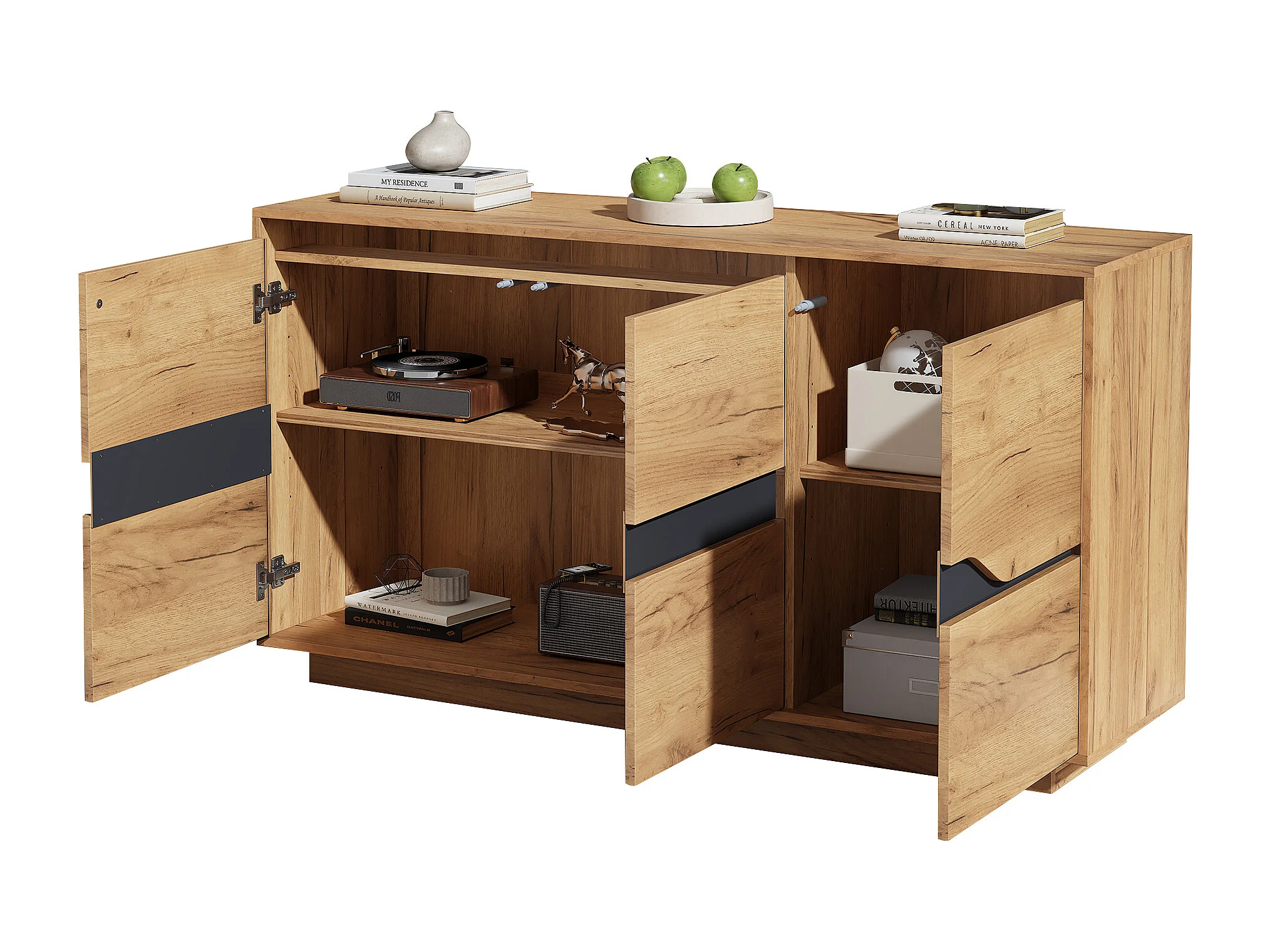 Buffet 3 portes - Meuble de salle à manger avec 5 séparateurs réglables - bois + noir