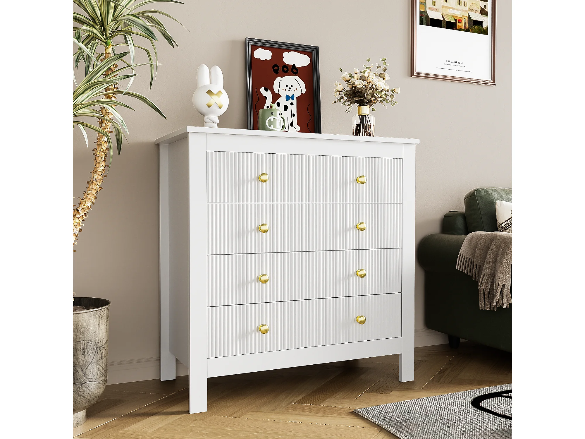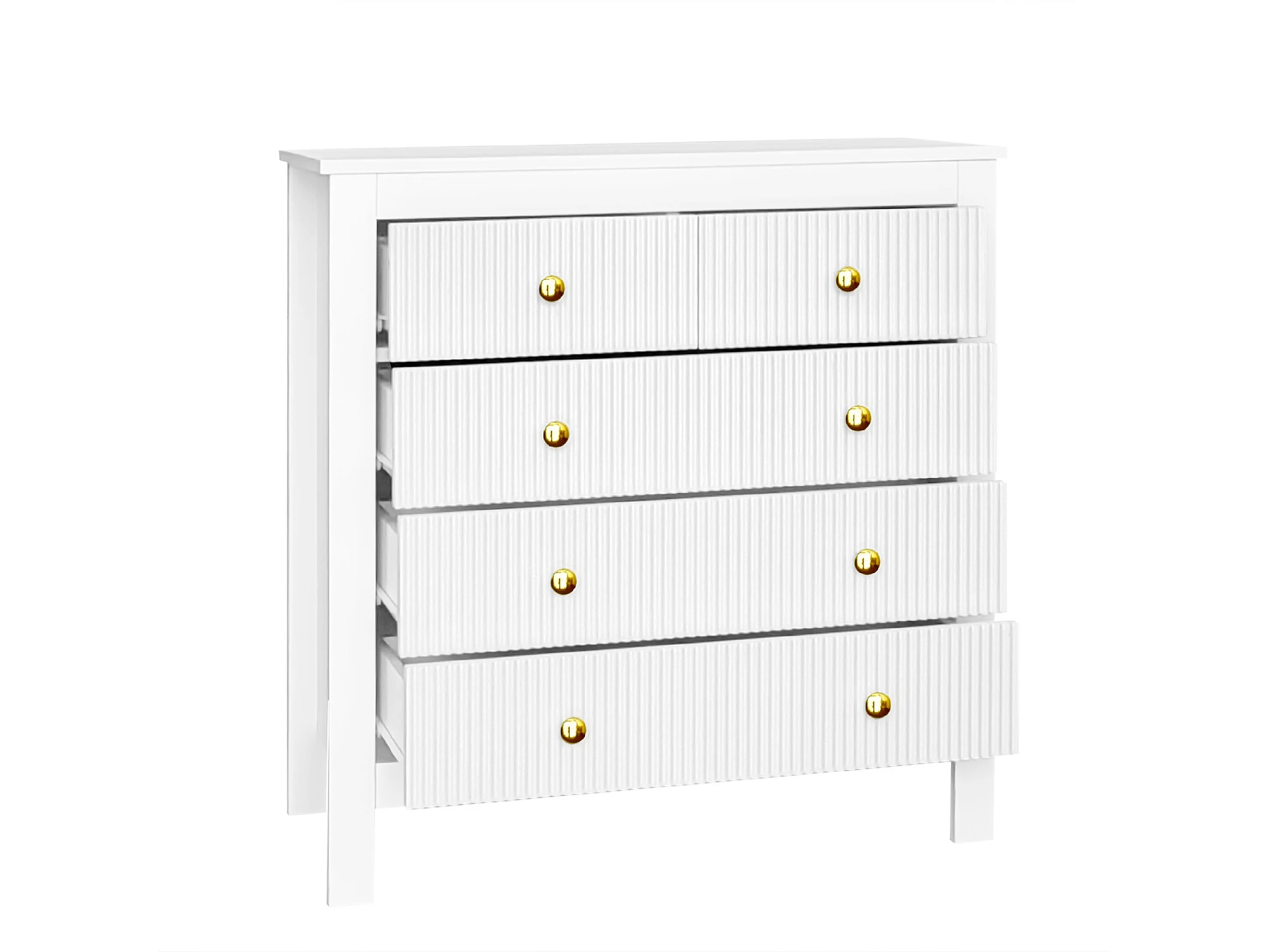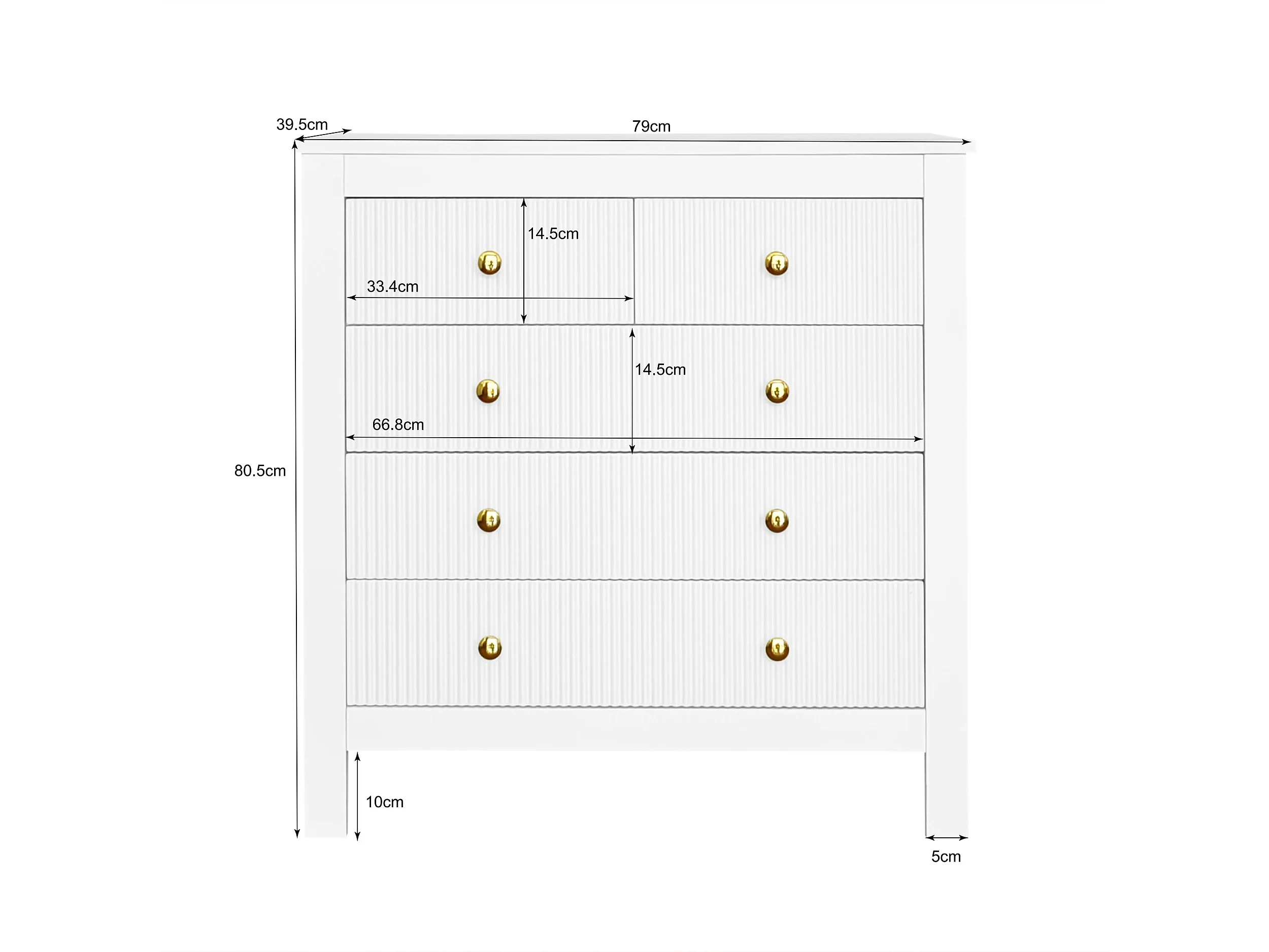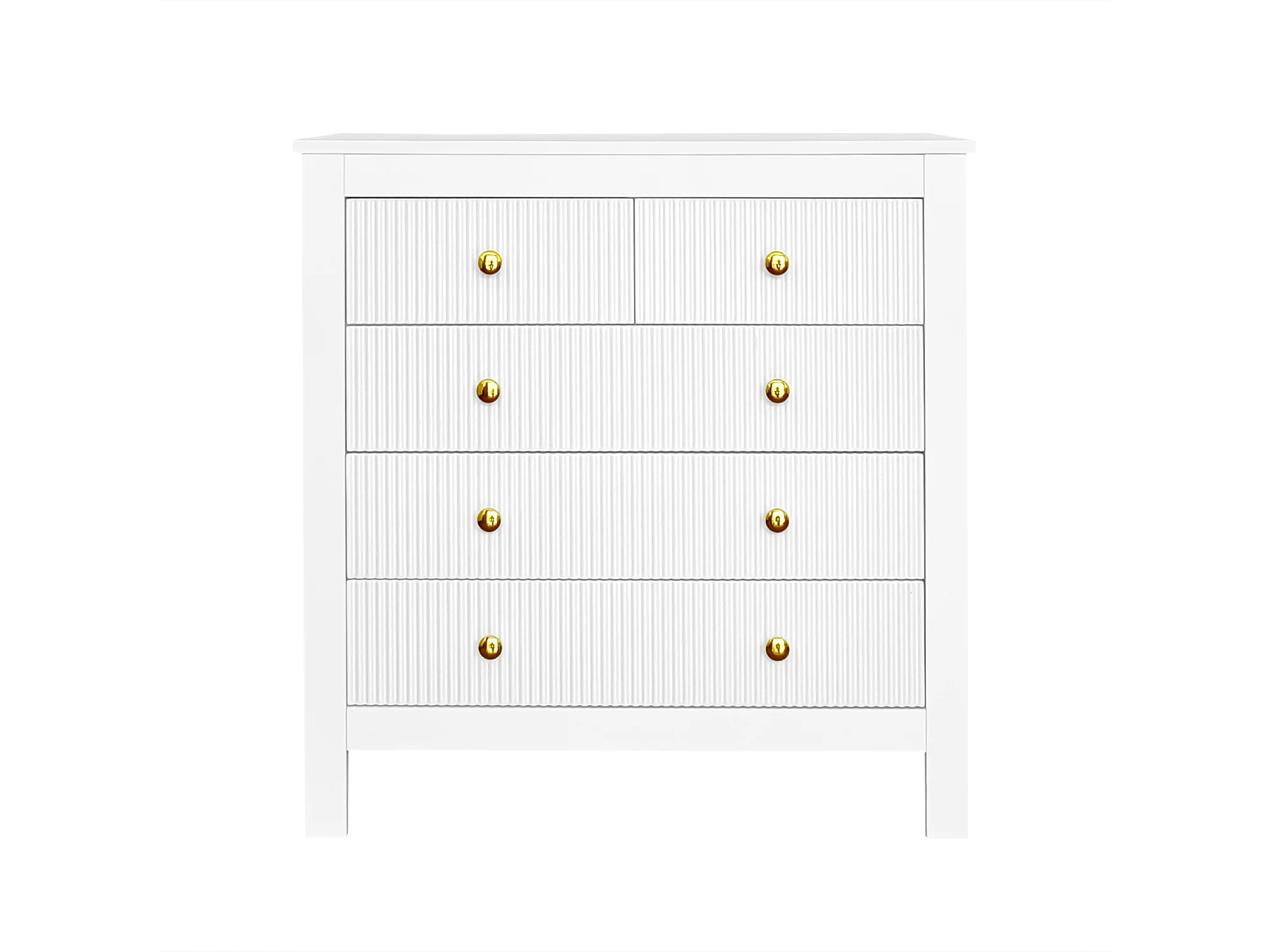 Commode 79x80.5x39.5 cm, 5 tiroirs texturés, poignées dorées, pieds épais, panneaux de particules blancs
