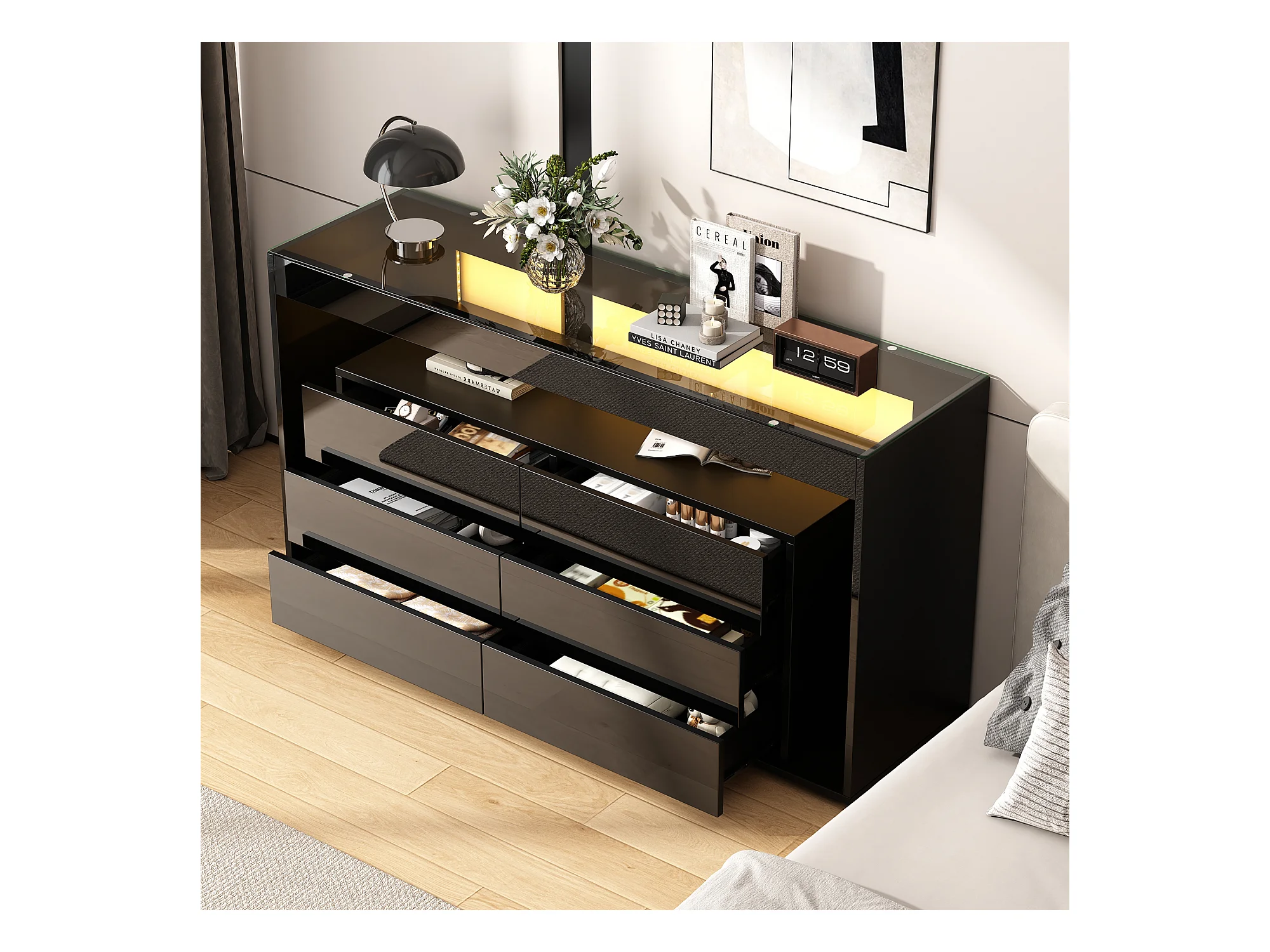 Buffet bas avec 6 tiroirs - 140 x 40 x 72 cm - avec plateau en verre trempé - rangement - aggloméré - noir