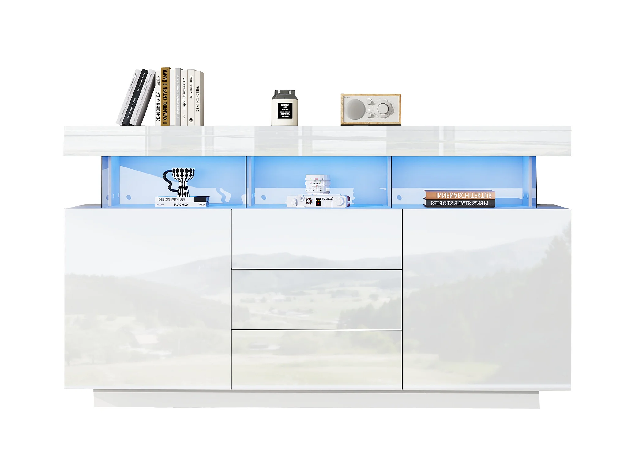 Buffet 140x40x65 cm - 3 tiroirs et 2 portes - avec éclairage LED - Finition brillante - Blanc