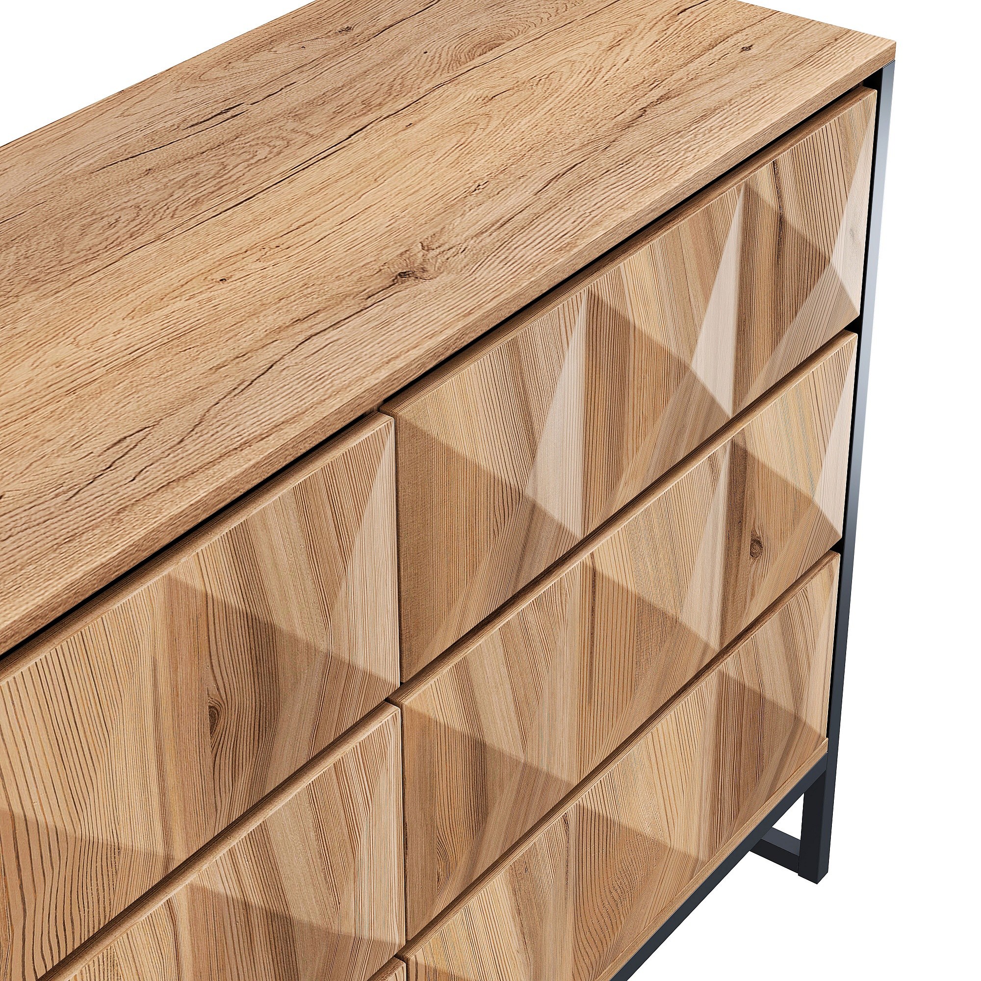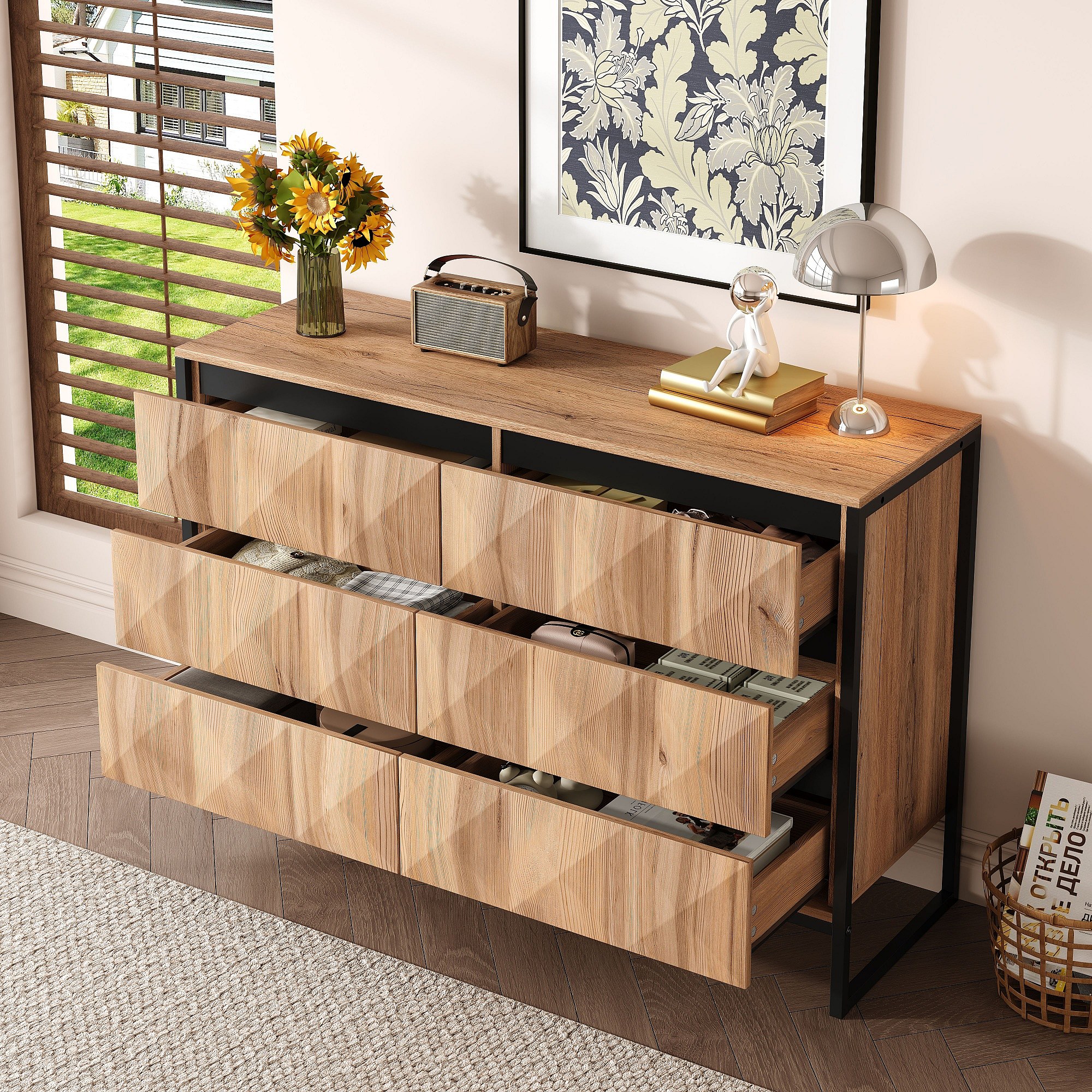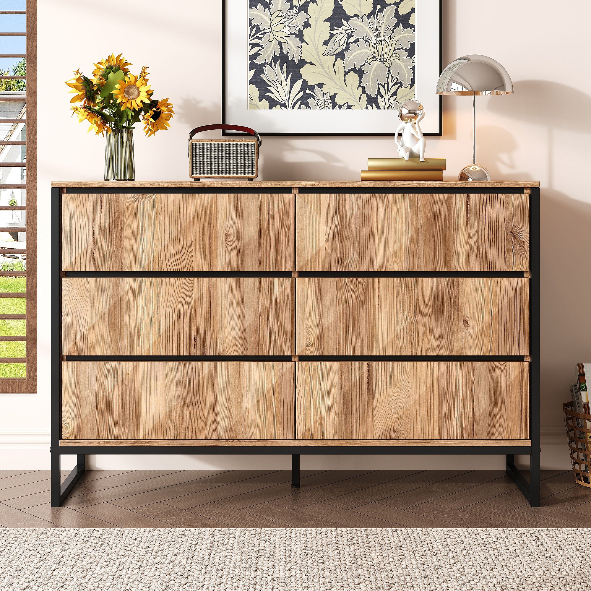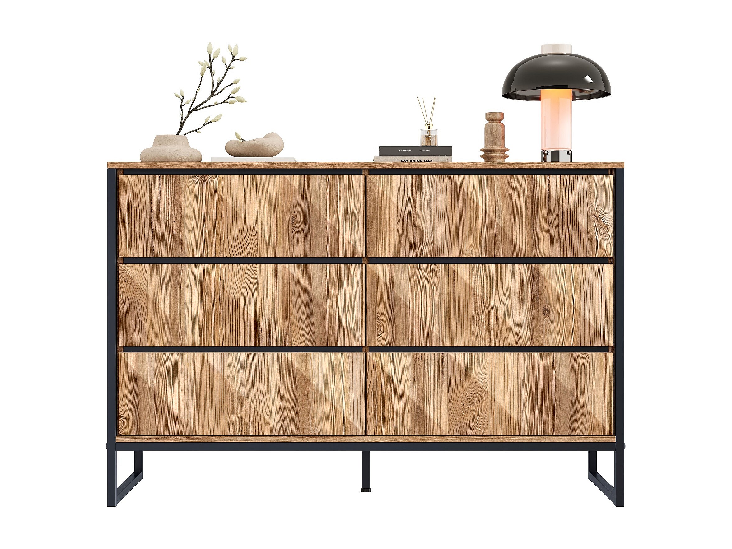 Buffet/commode à 6 tiroirs - 120 x 40 x 80 cm - pieds en métal et portes surélevées - aggloméré - naturel
