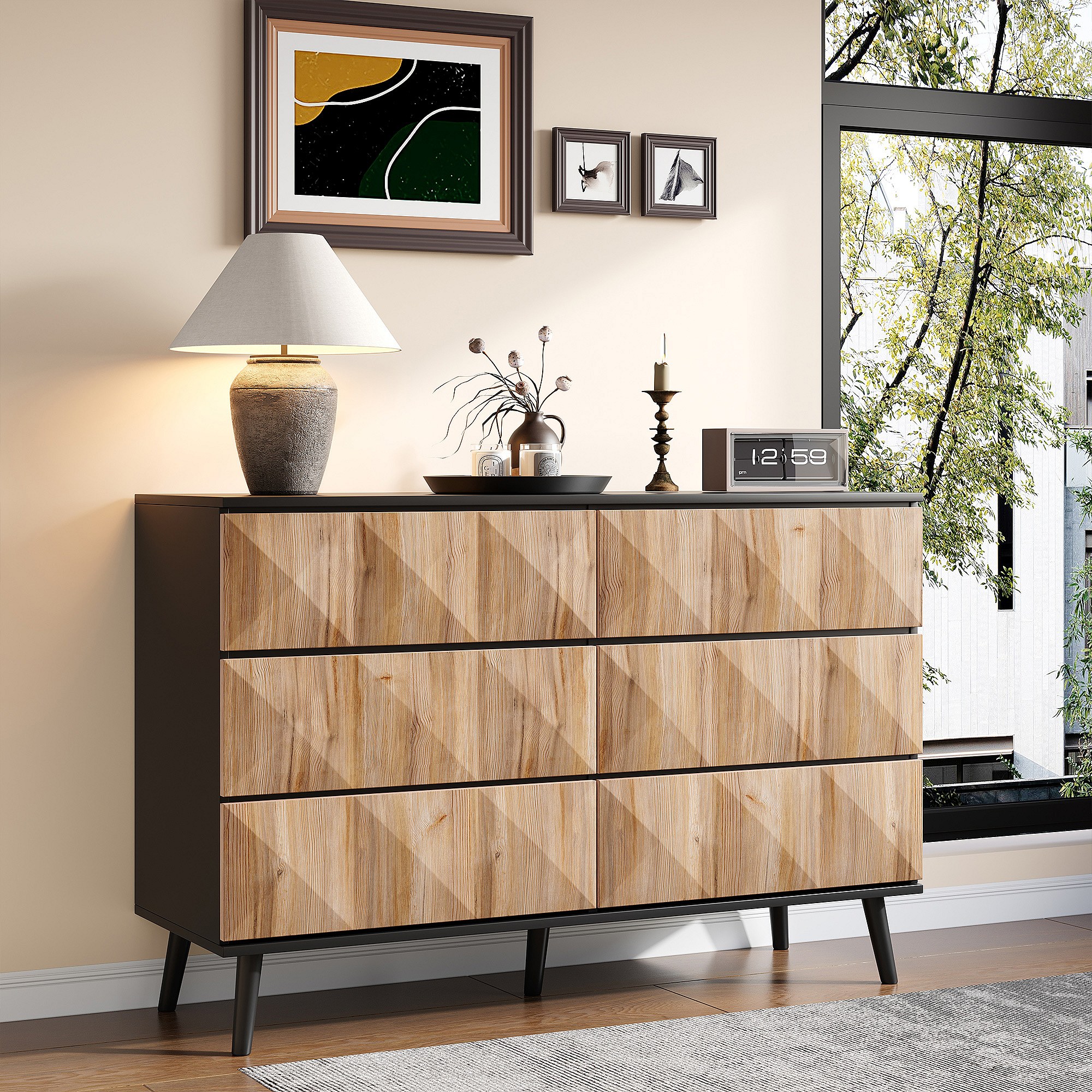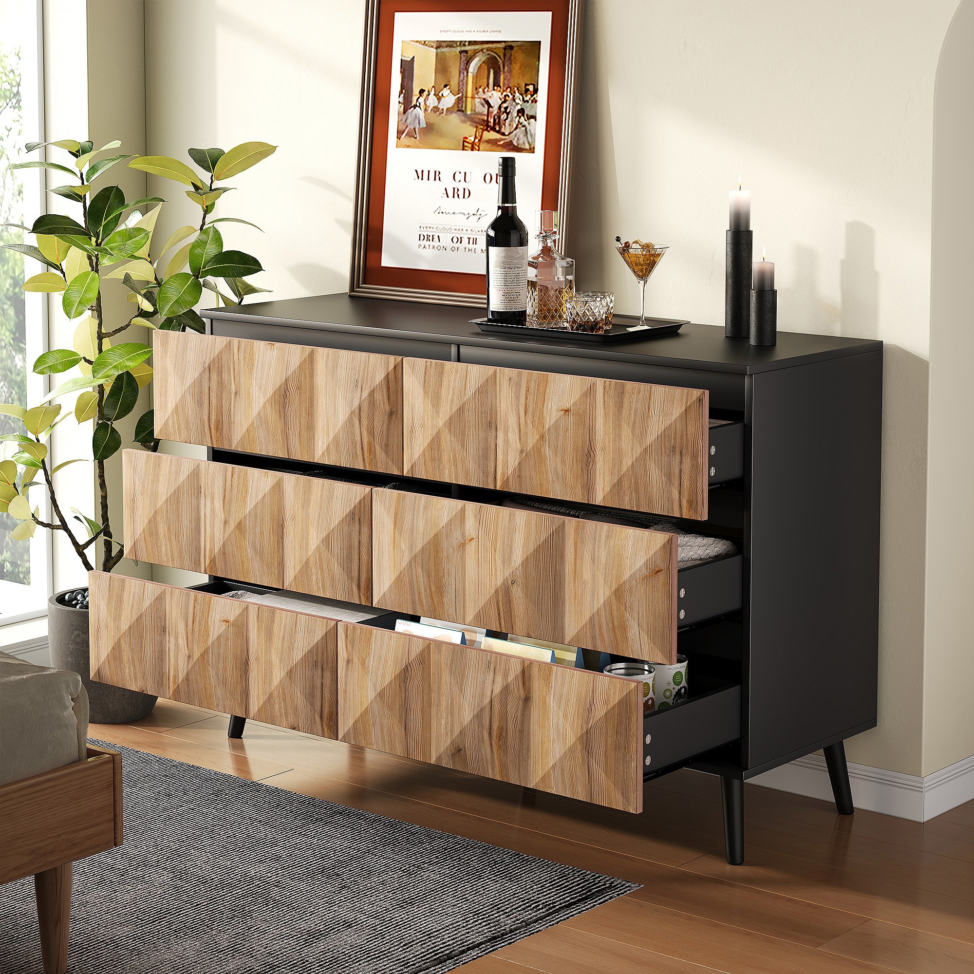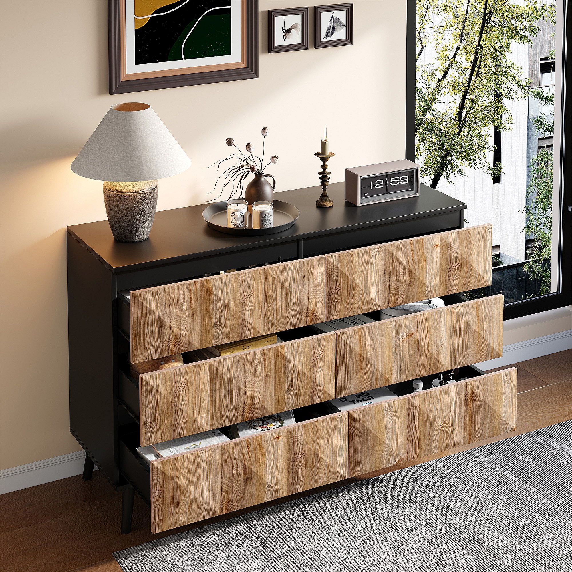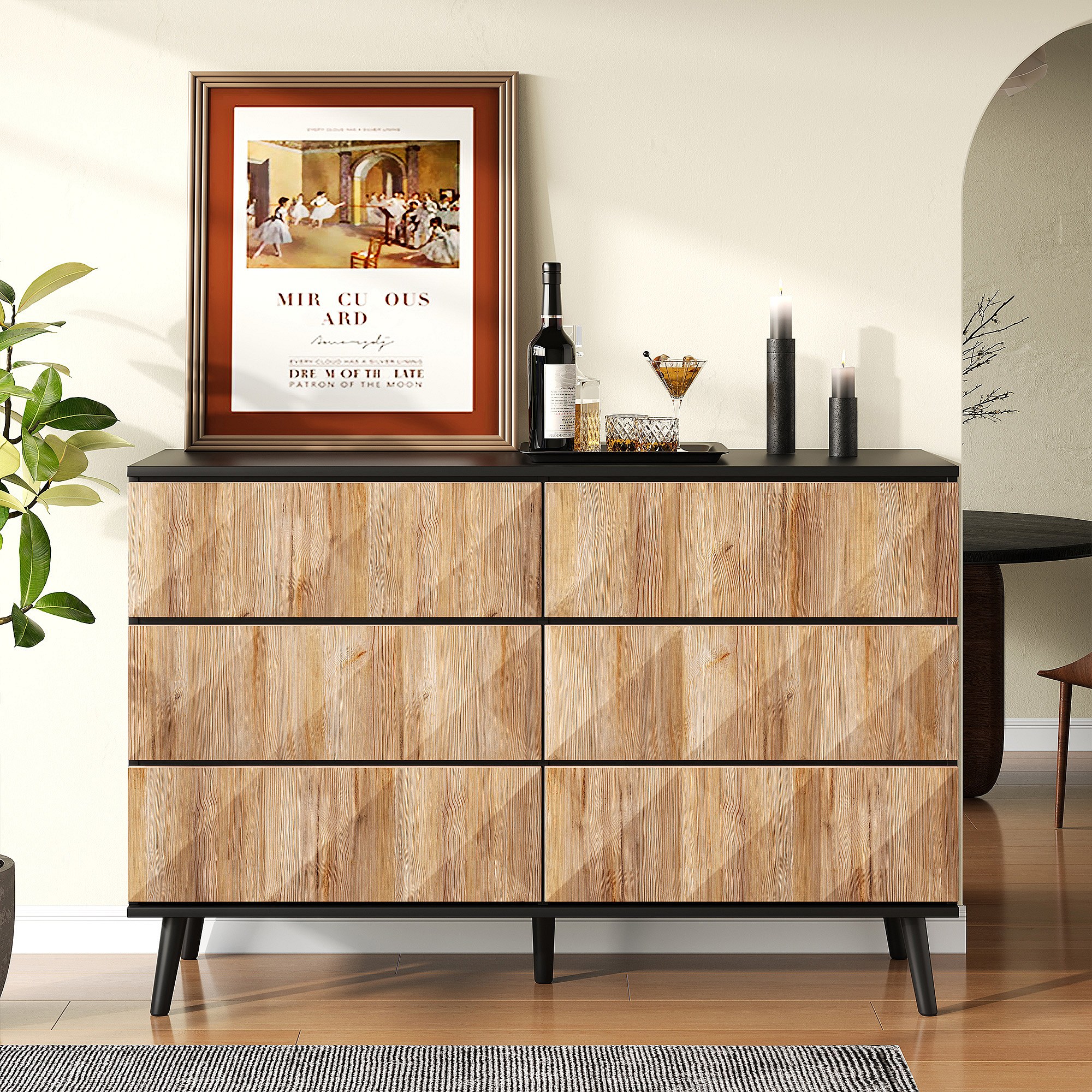 Buffet/commode à 6 tiroirs - 120 x 40 x 85 cm - portes surélevées - aggloméré - naturel + noir