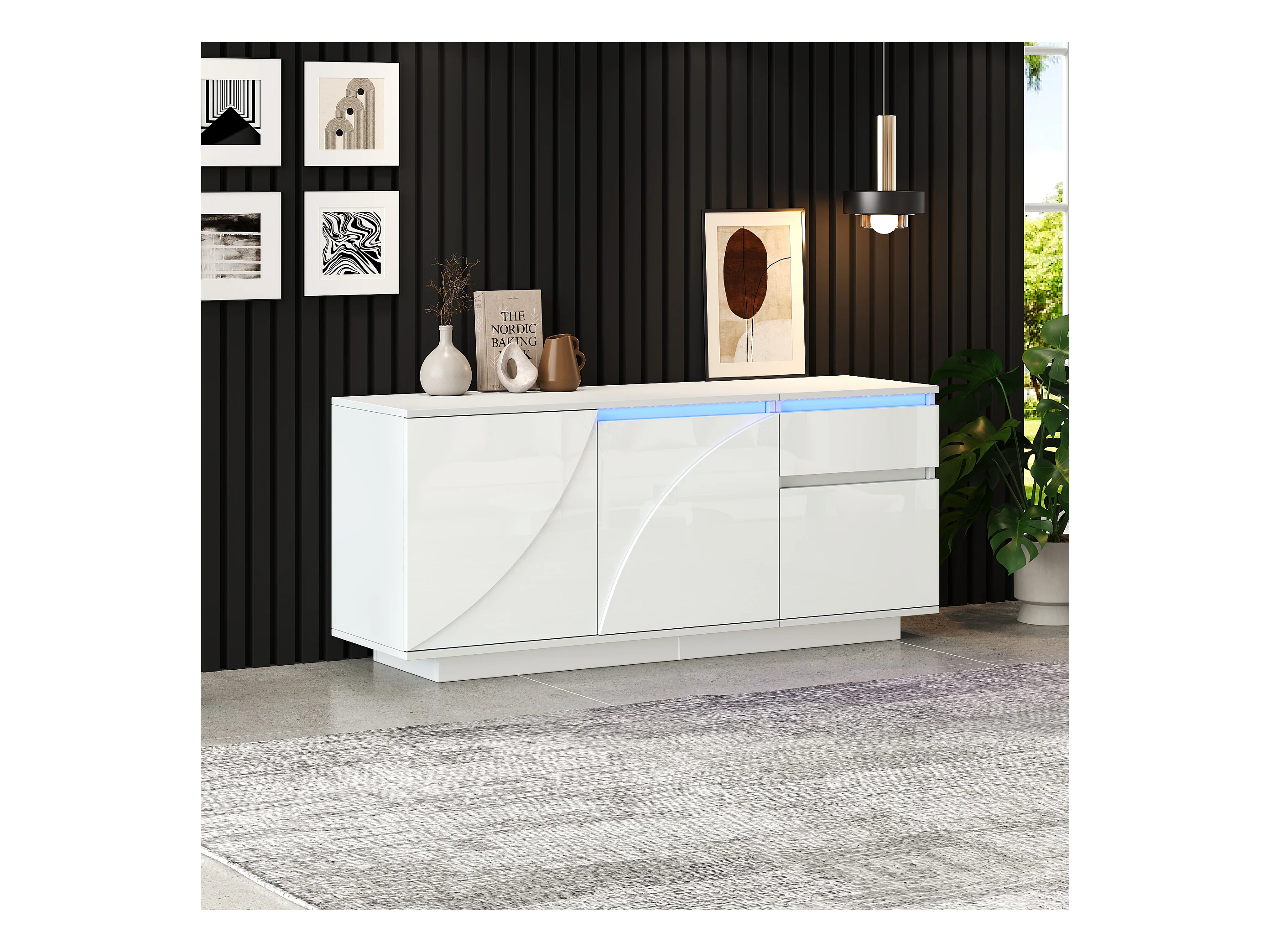 Buffet de salon brillant avec 3 tiroirs + 2 portes + Leds - 140 x 40 x 65 cm - MDF - blanc