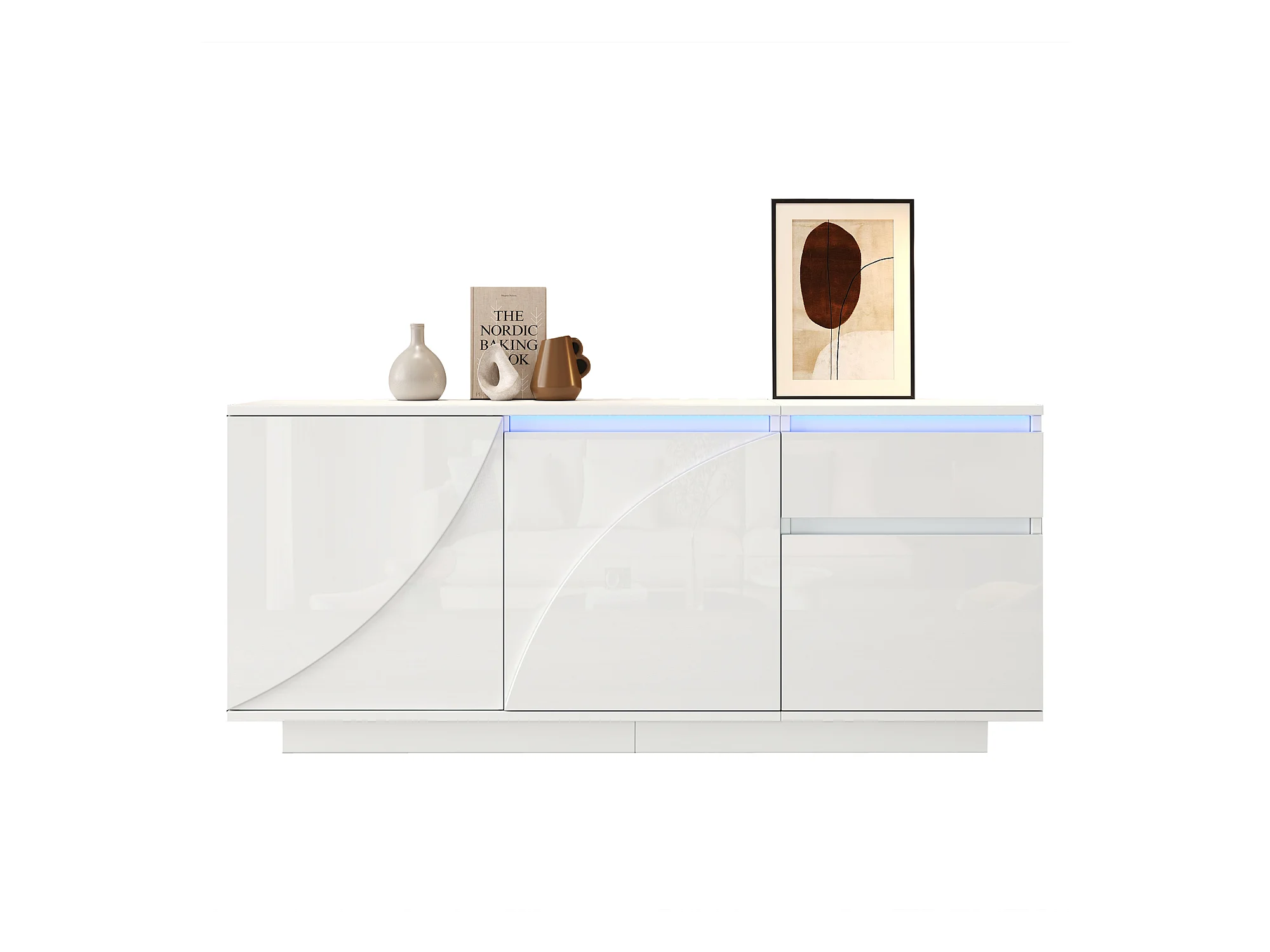Buffet brillant - 140 x 35 x 72 cm - avec 3 tiroirs + 2 portes + Leds + étagères réglables - aggloméré - blanc