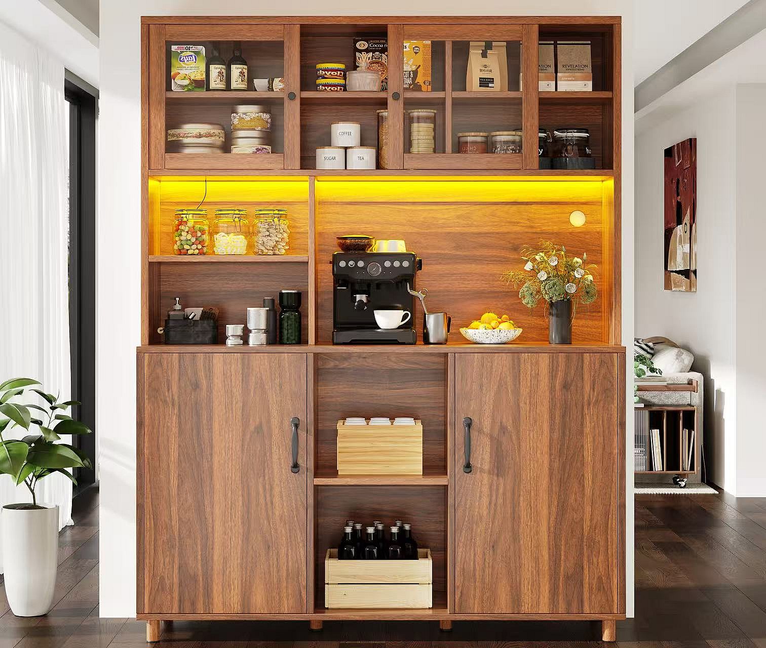 Buffet de cuisine 120x40x185cm - 2 portes - avec éclairage LED - meuble haut - buffet polyvalent - Marron