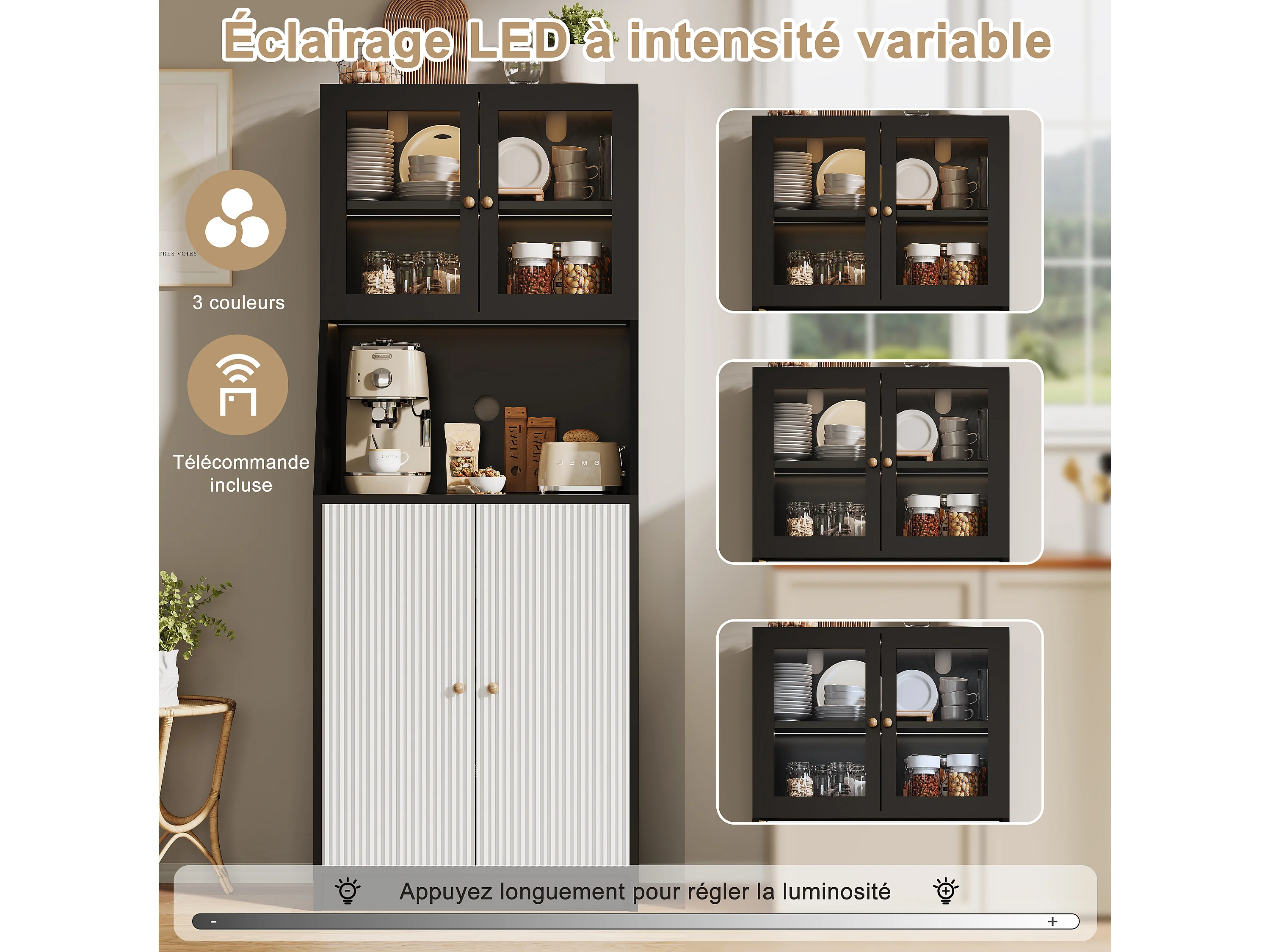 Buffet cuisine haut - 120 x 40 x 180 cm - avec étagères réglables + 2 tiroirs + 3 portes + Leds - MDF + PB - noir