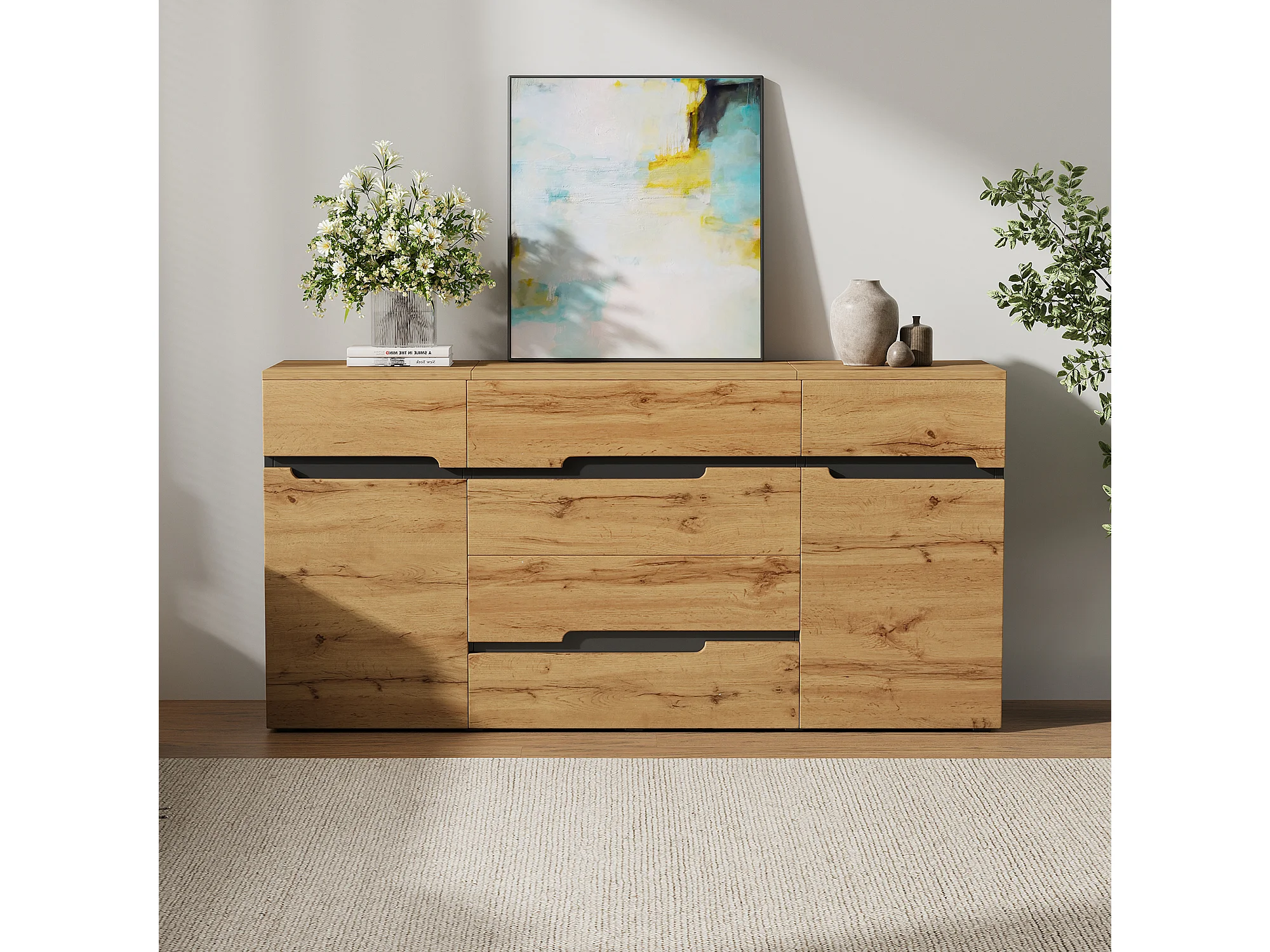 Buffet de salon - 160 x 40 x 80 cm - avec 2 portes + 4 tiroirs - aggloméré - noir + naturel