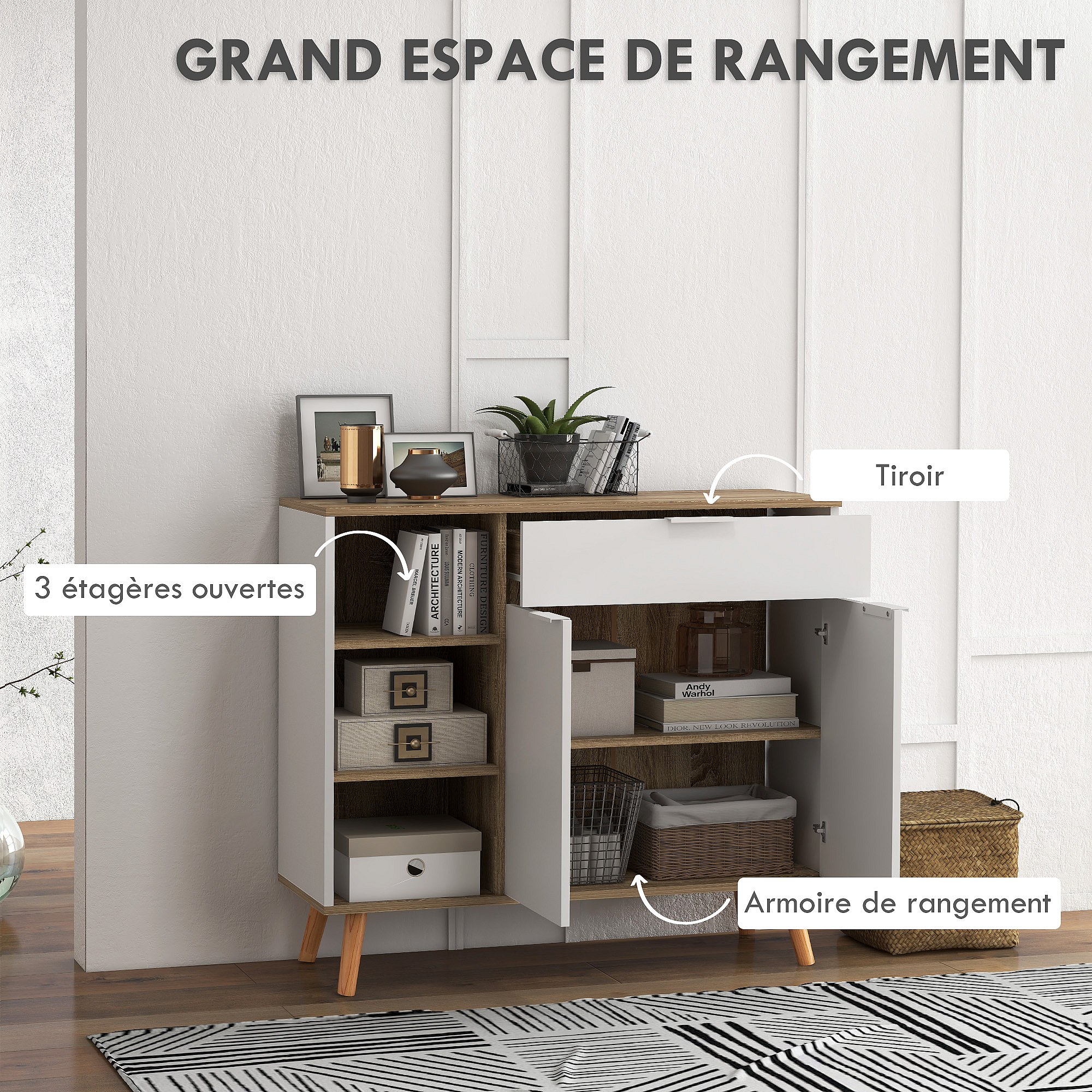 Buffet design scandinave - 2 portes, étagère, tiroir, 3 niches - piètement bois pin panneaux blanc aspect chêne clair