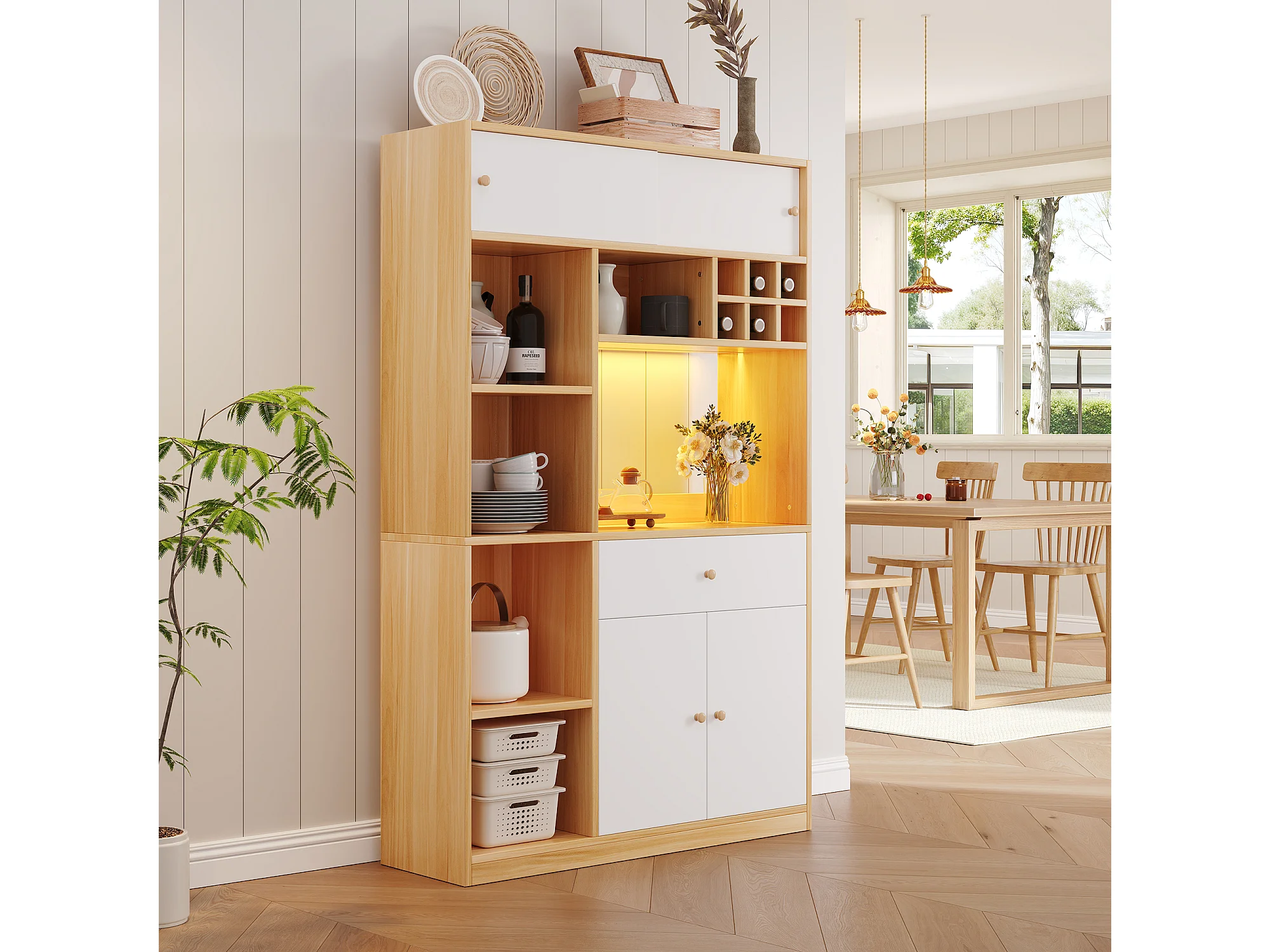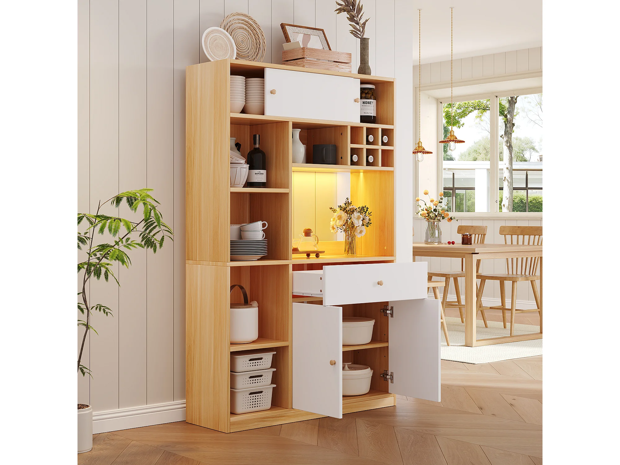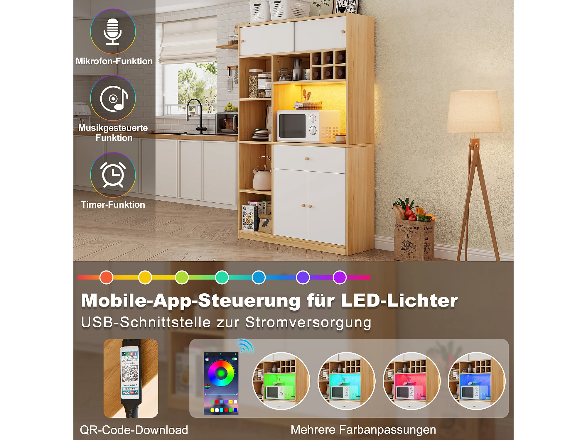 Buffet haut de cuisine avec Leds - 115 x 35 x 180 cm - avec 1 tiroir + 3 portes + étagères - aggloméré - blanc + naturel