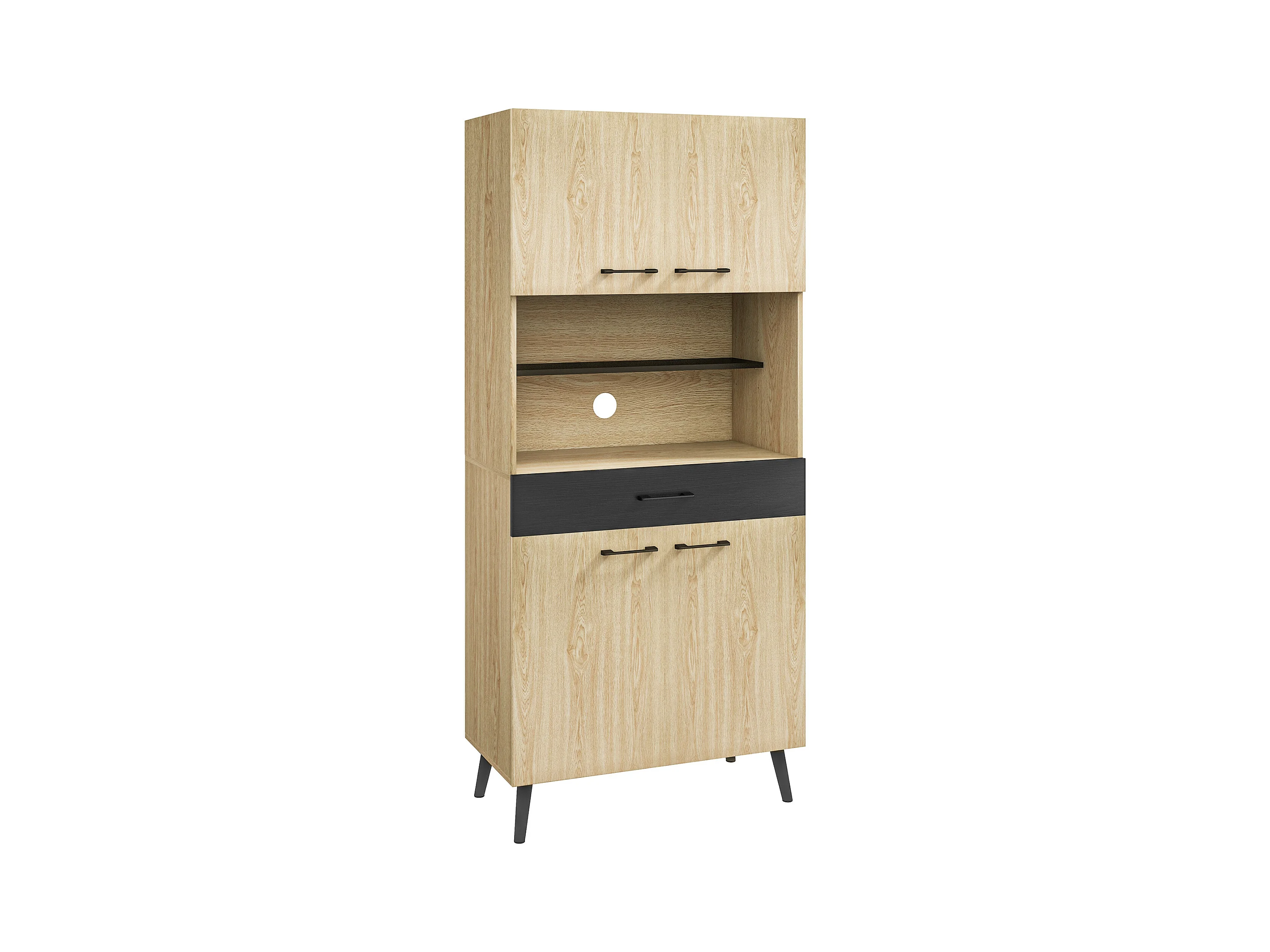 Buffet haut multi-rangement une porte 3 étagères 2 tiroirs 2 niches piètement acier noir aspect chêne clair