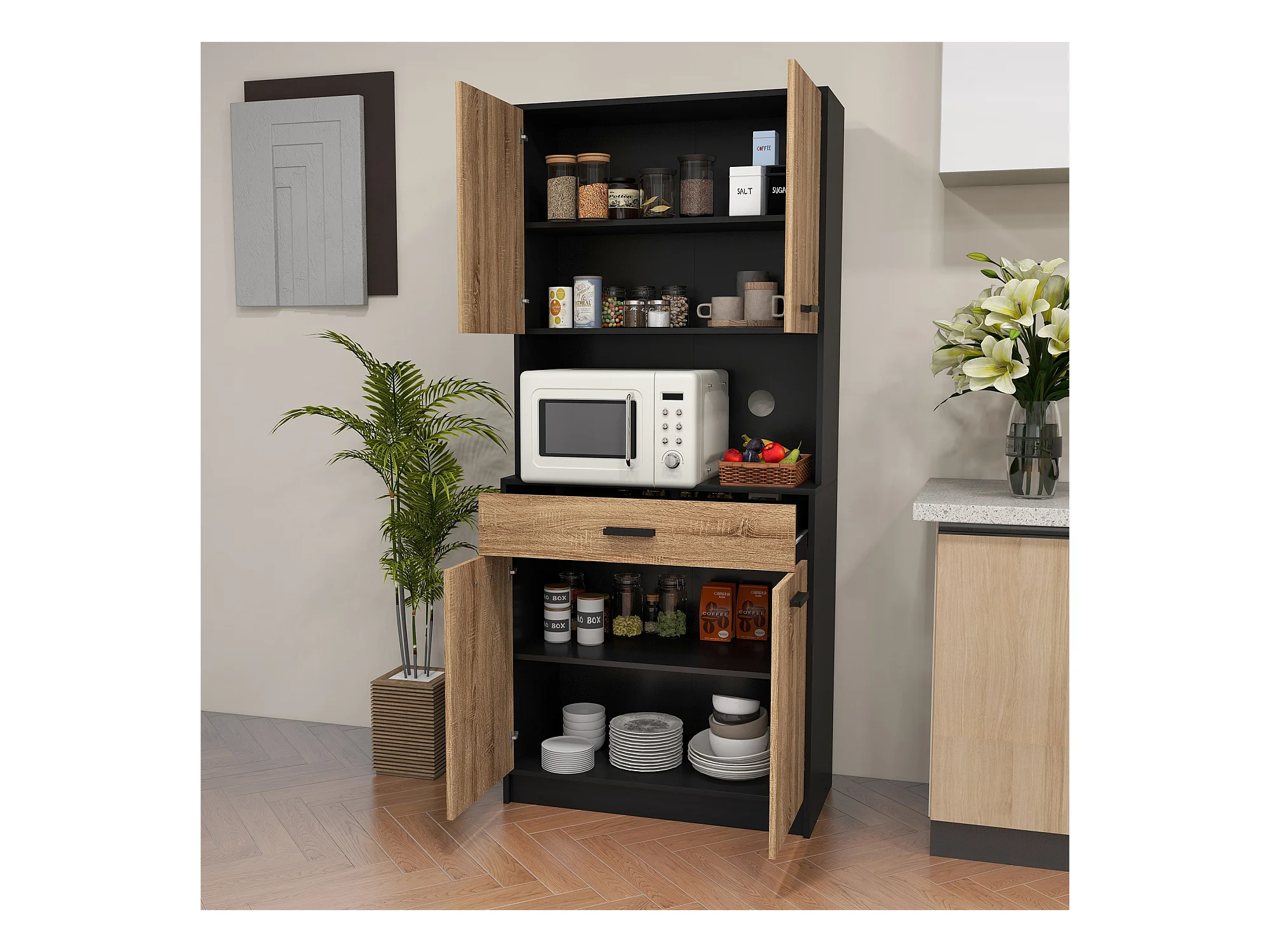 Buffet haut design industriel - 4 portes, 3 étagères, tiroir, niche - métal panneaux noir chêne clair