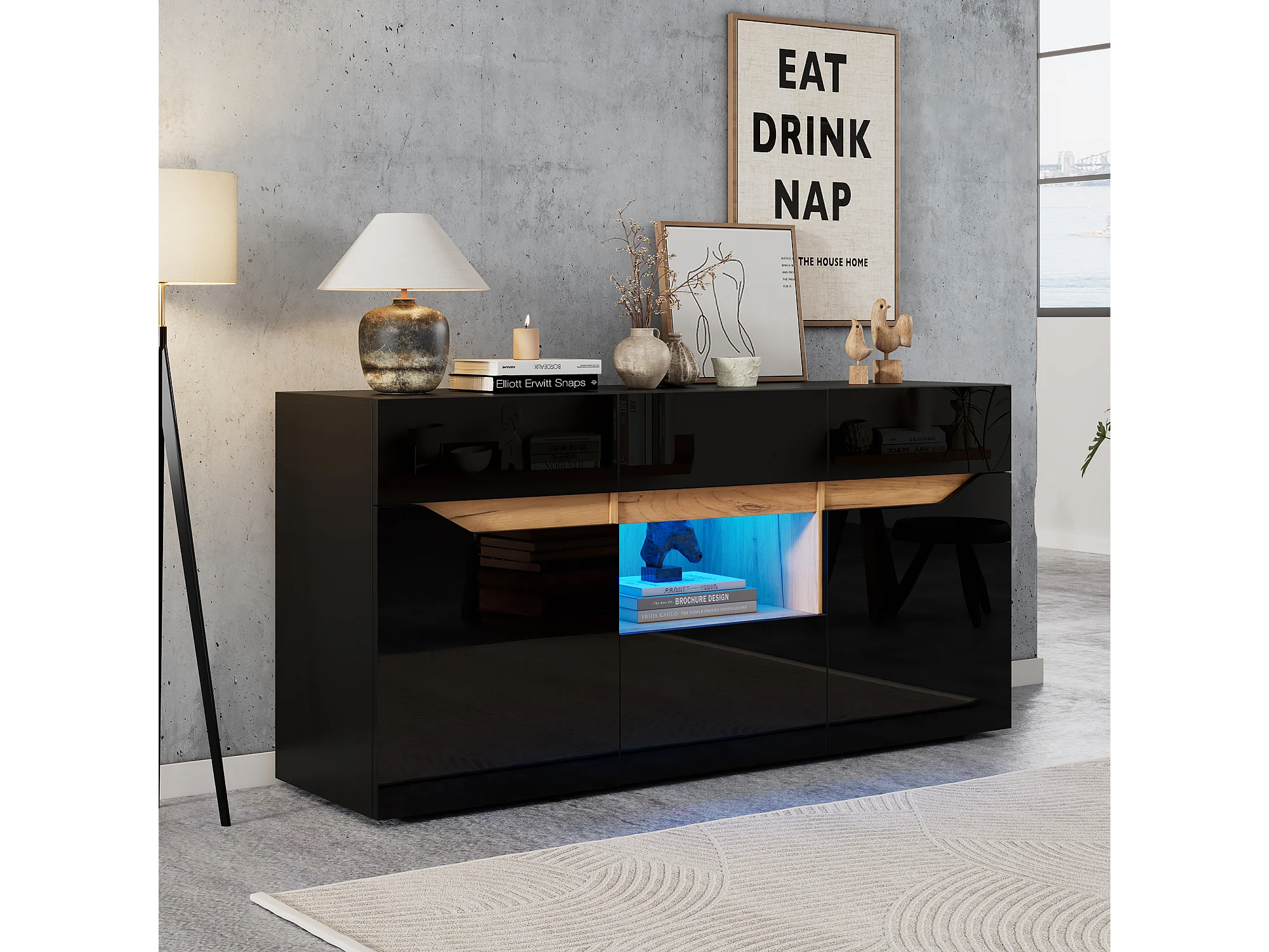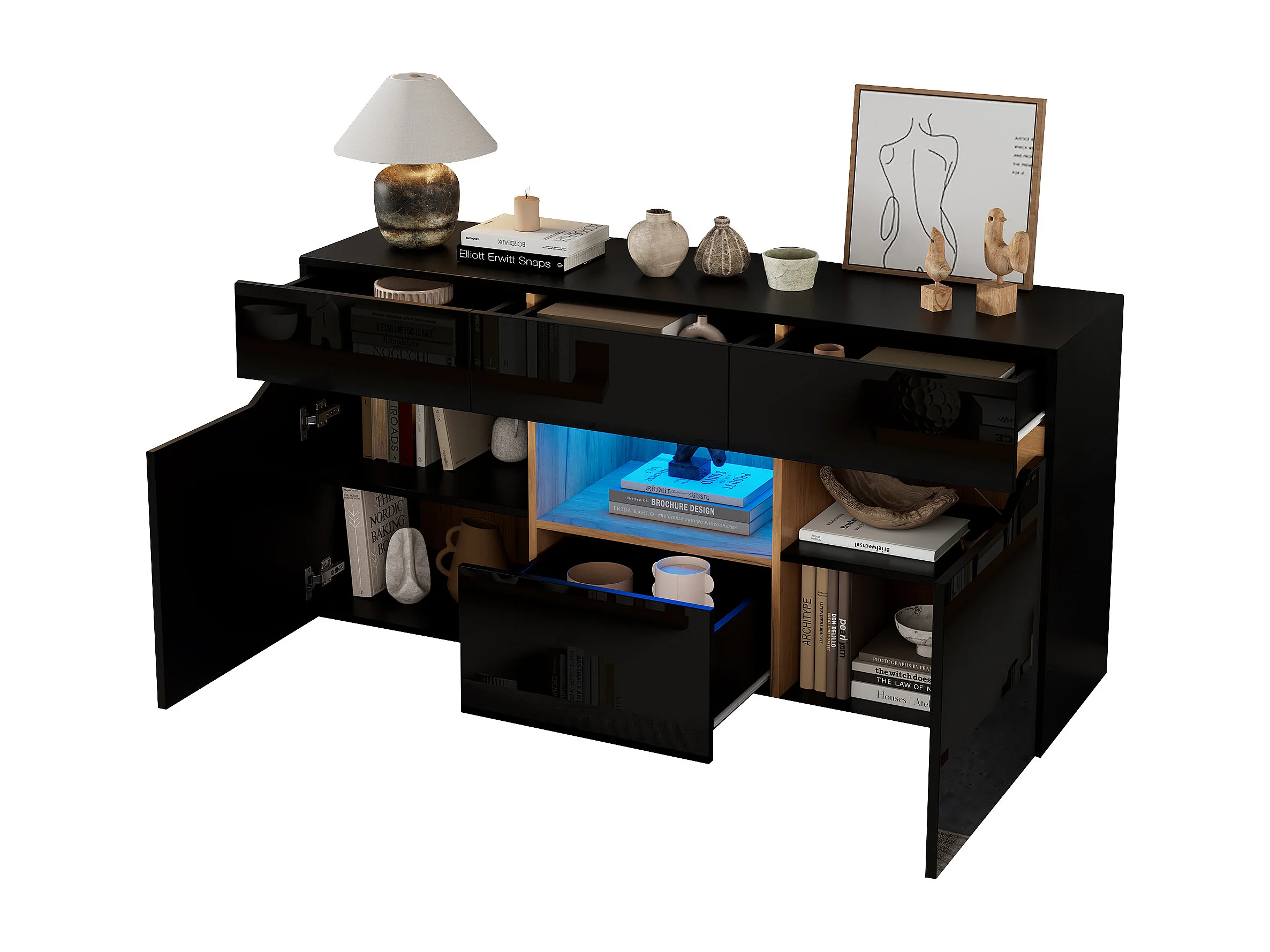 Buffet moderne 140x40x70 cm - 4 tiroirs et 2 portes - avec éclairage LED - Finition brillante - Noir et naturel
