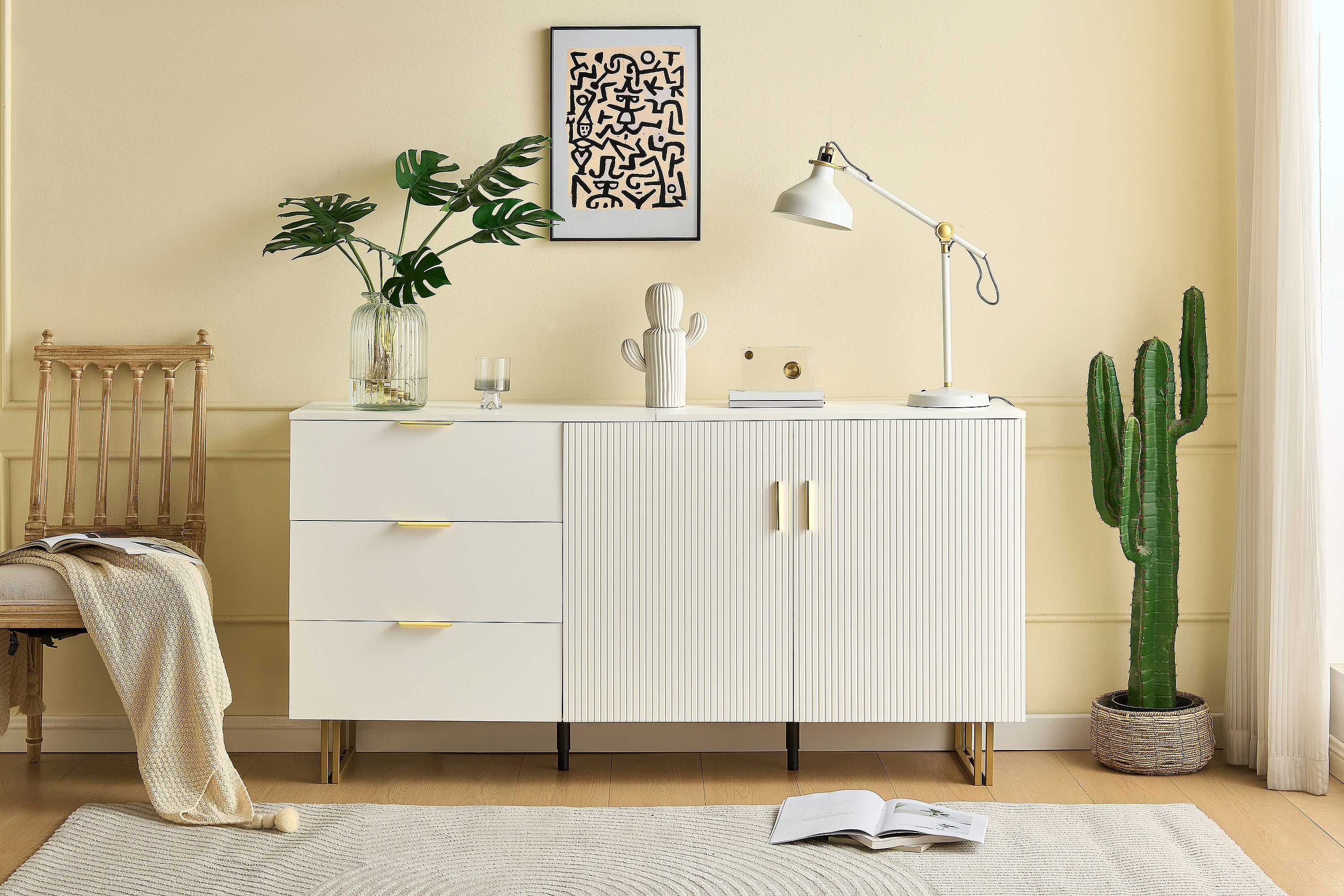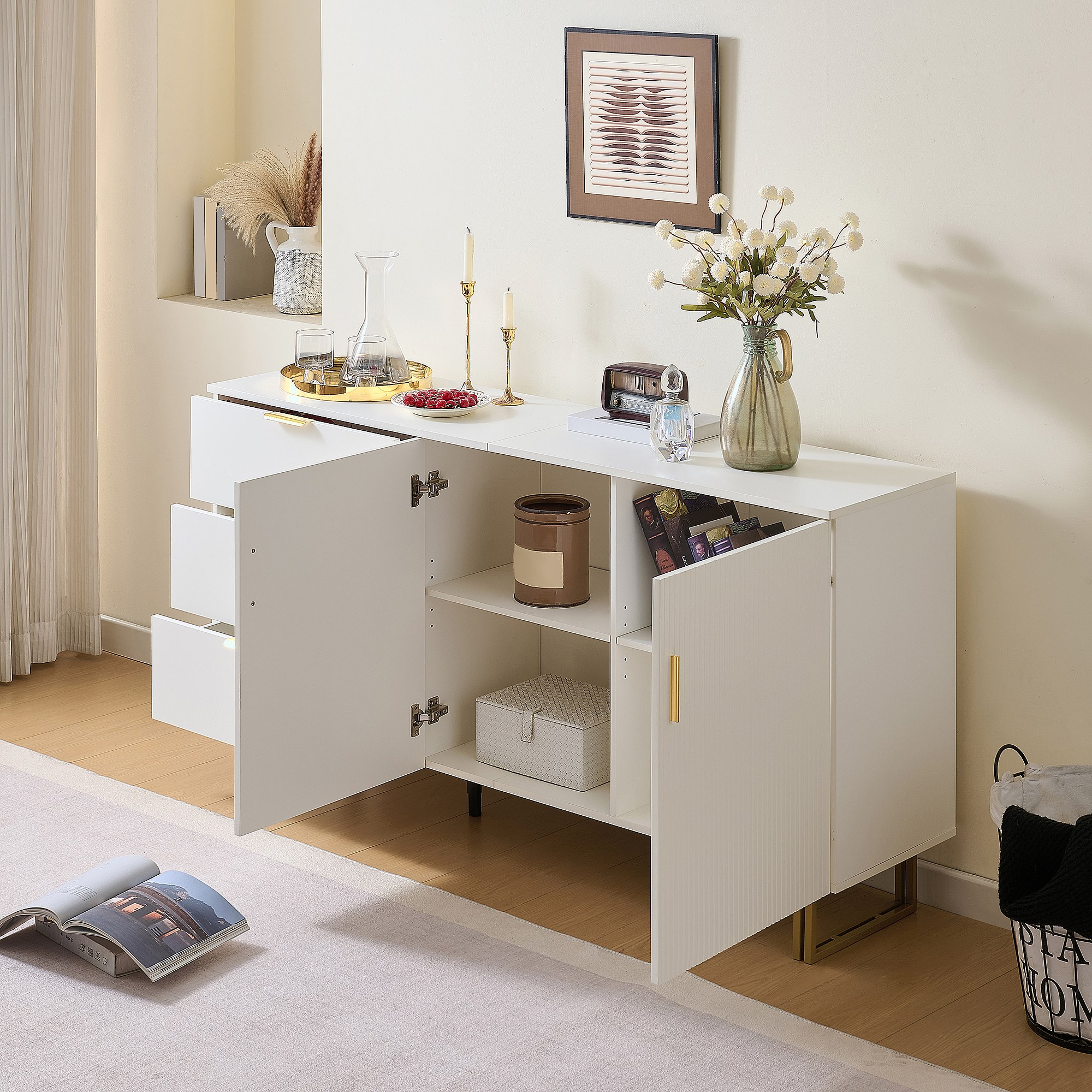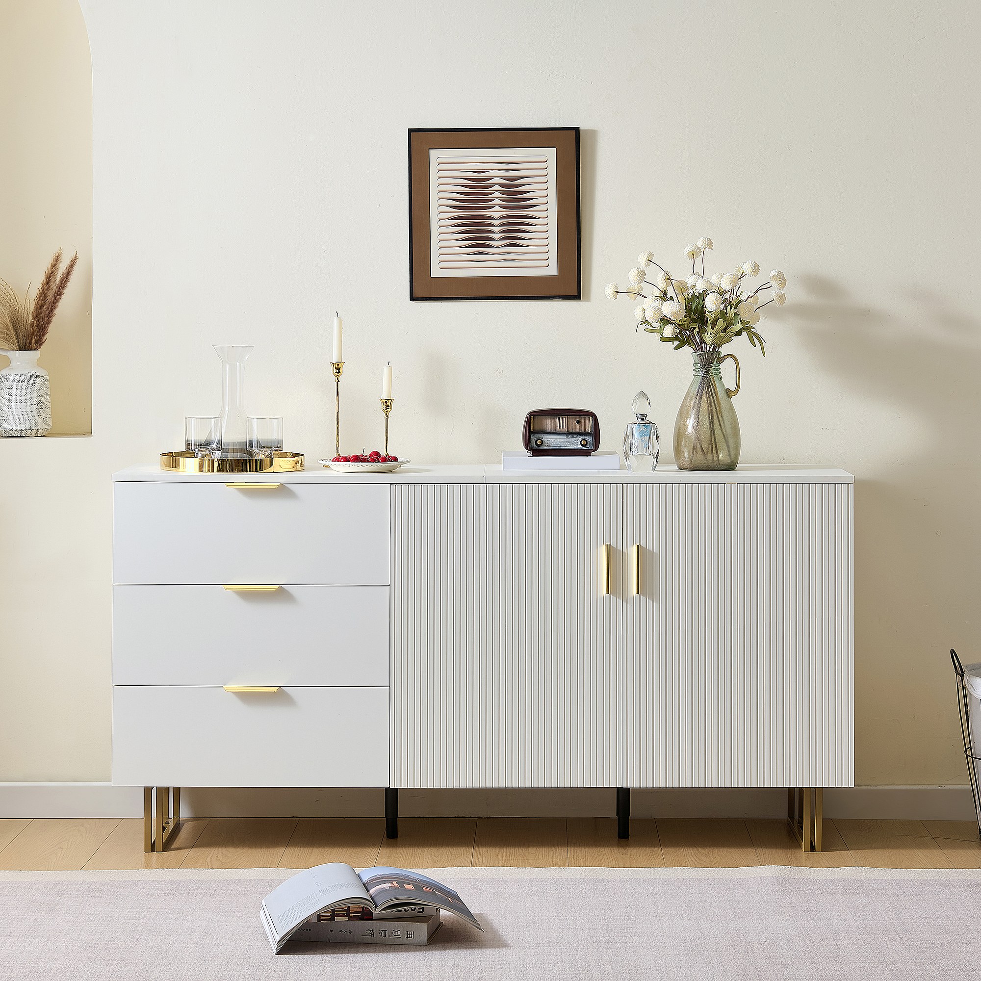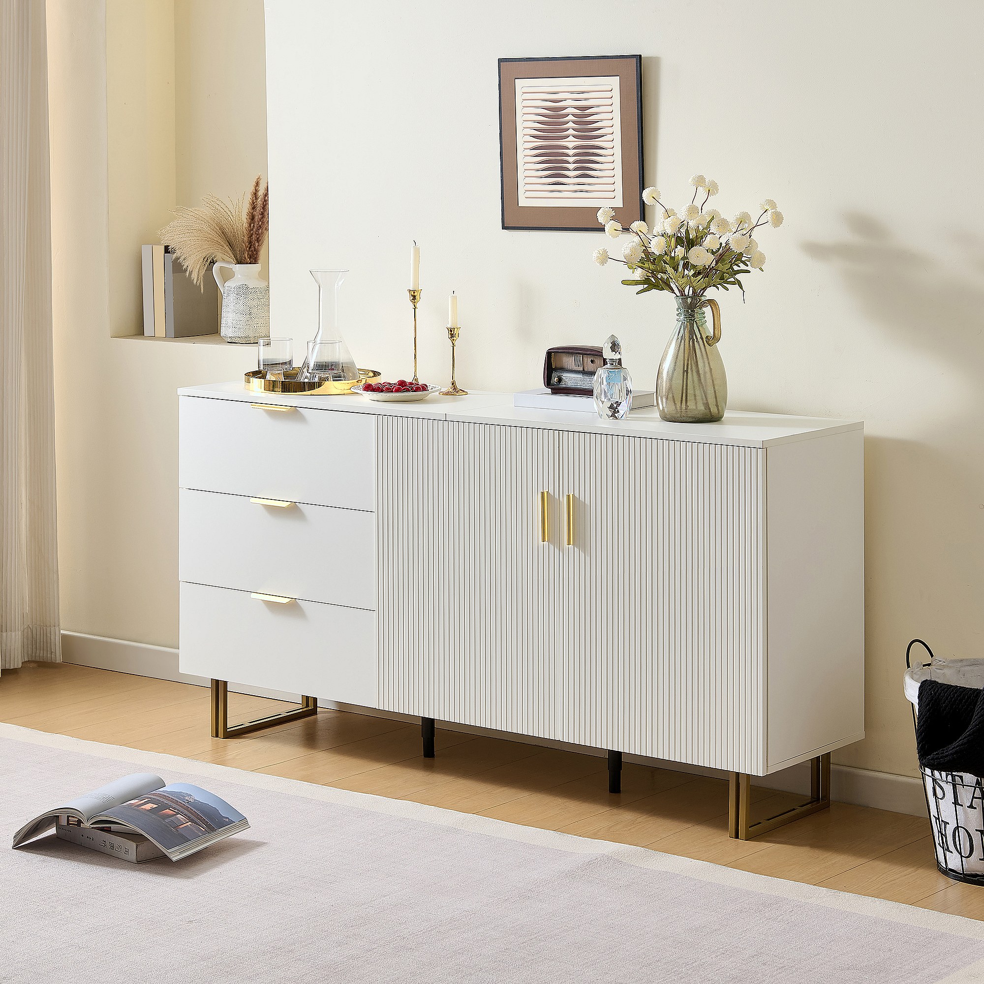 Buffet avec 2 tiroirs et 4 portes - poignées dorées - pour cuisine/salle à manger/salon - MDF - blanc
