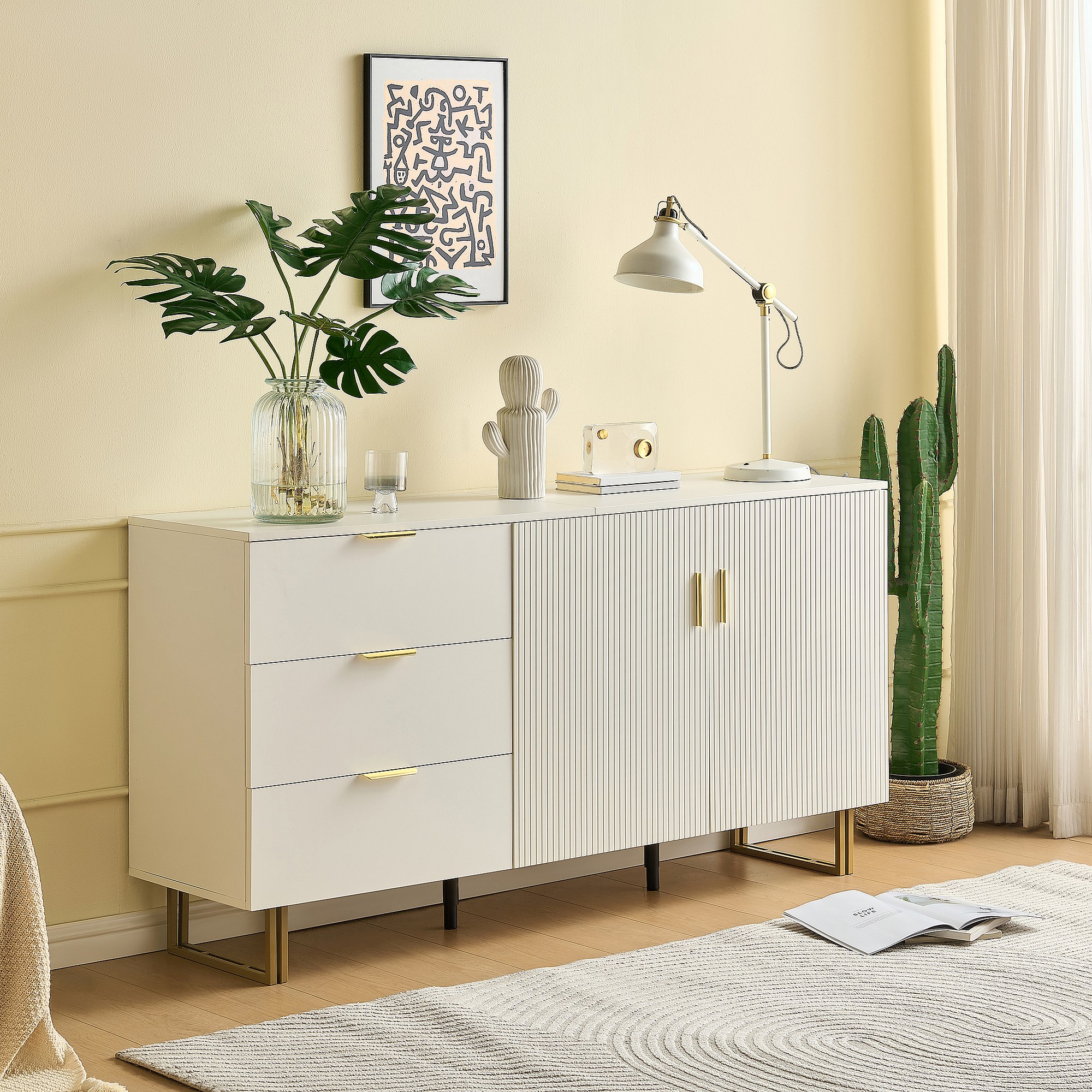 Buffet au design ondulé - 152 x 40 x 75 cm - poignées et pieds dorés - avec 4 portes - MDF - blanc