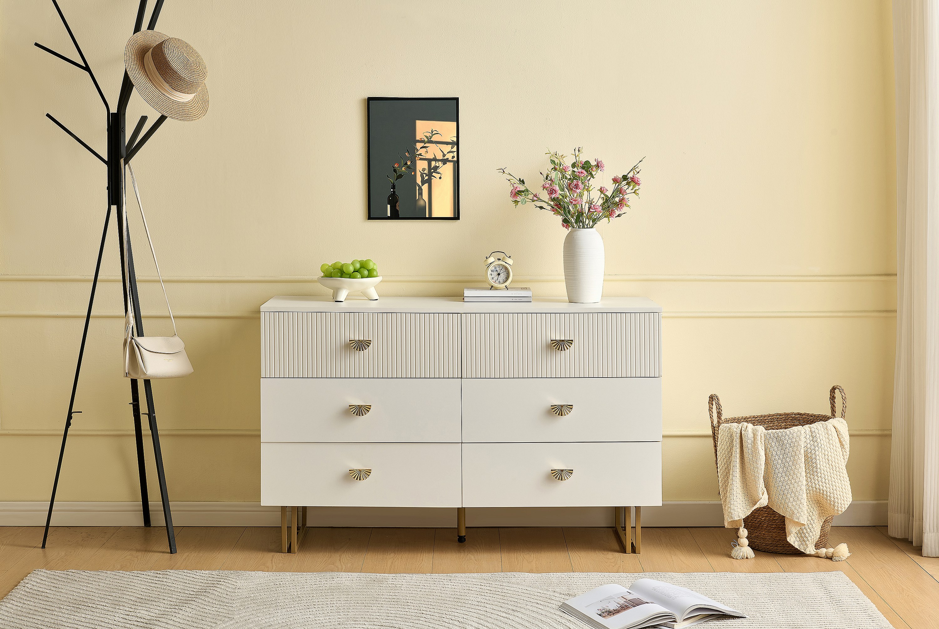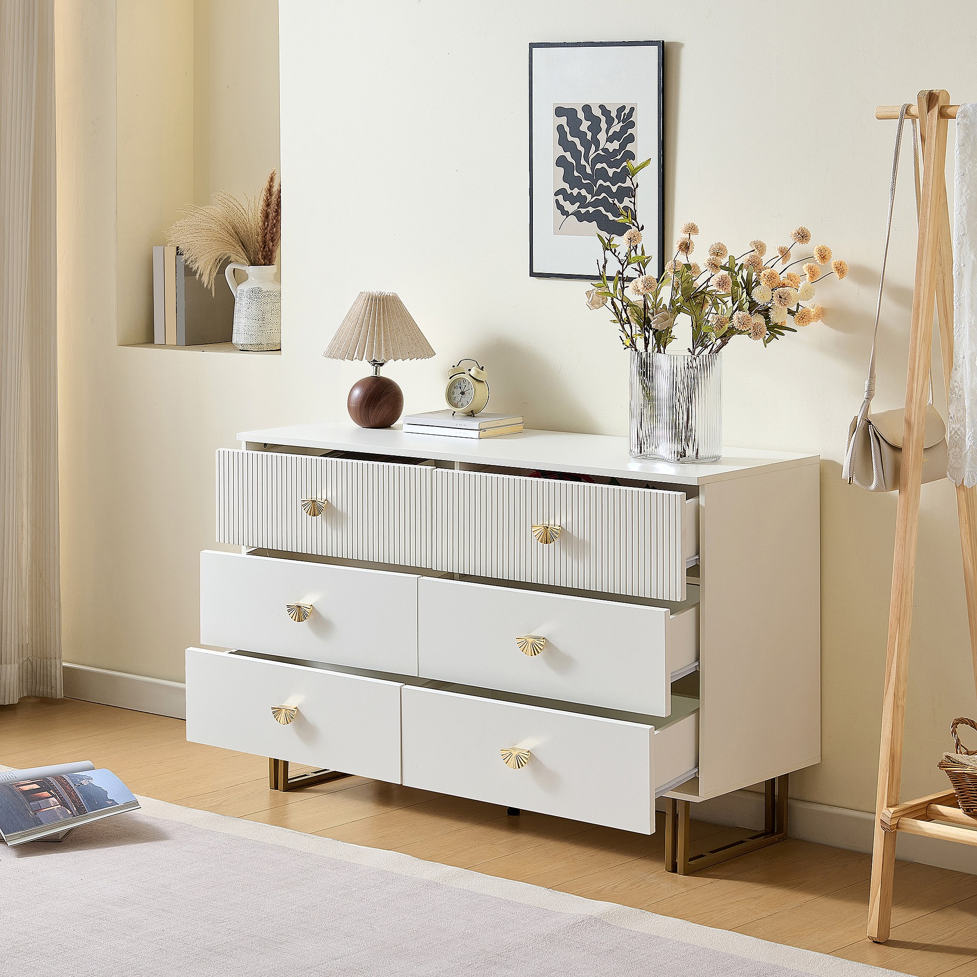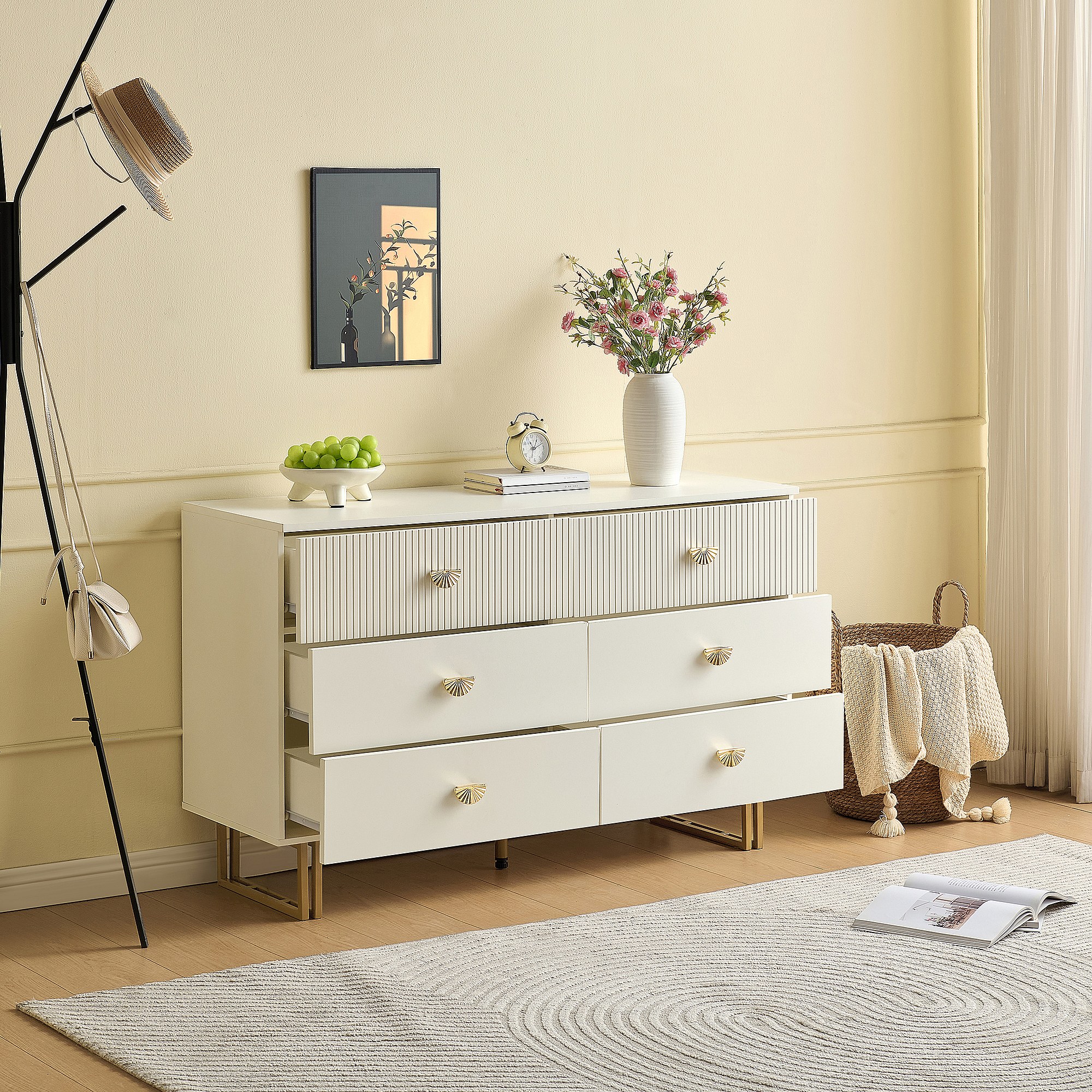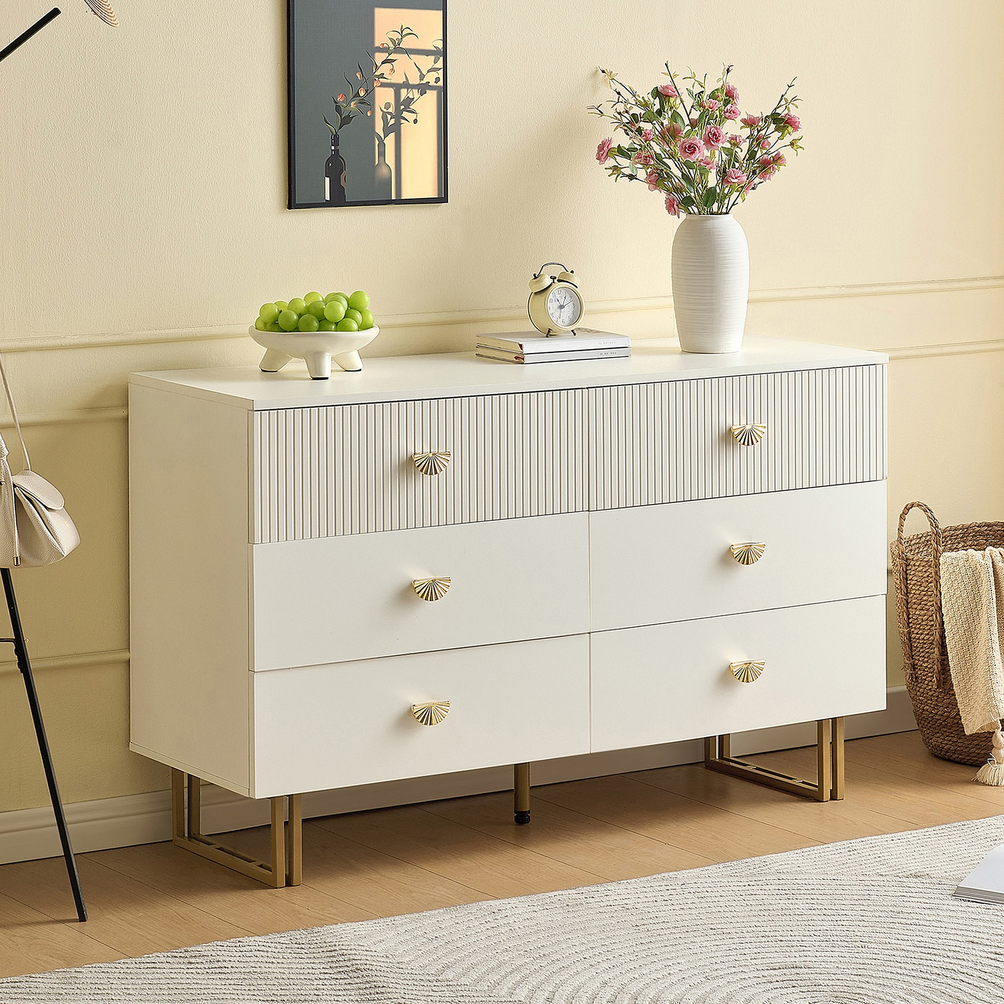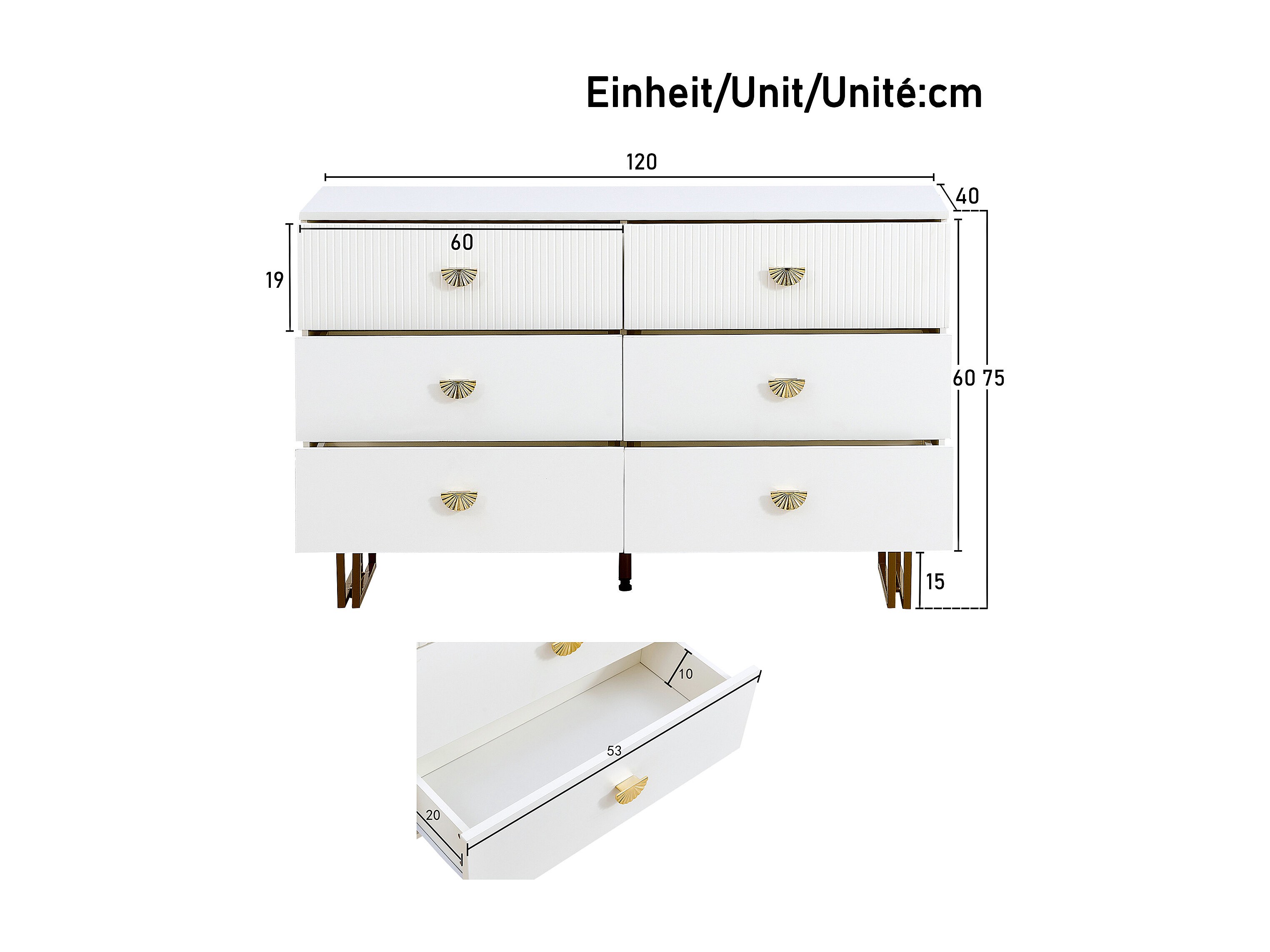 Buffet moderne avec 6 tiroirs aux accents blancs et dorés - 120 x 40 x 75 cm - pour chambres - MDF - blanc
