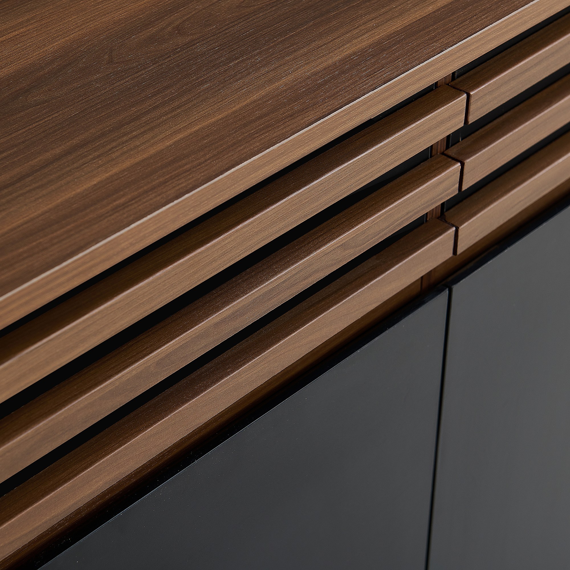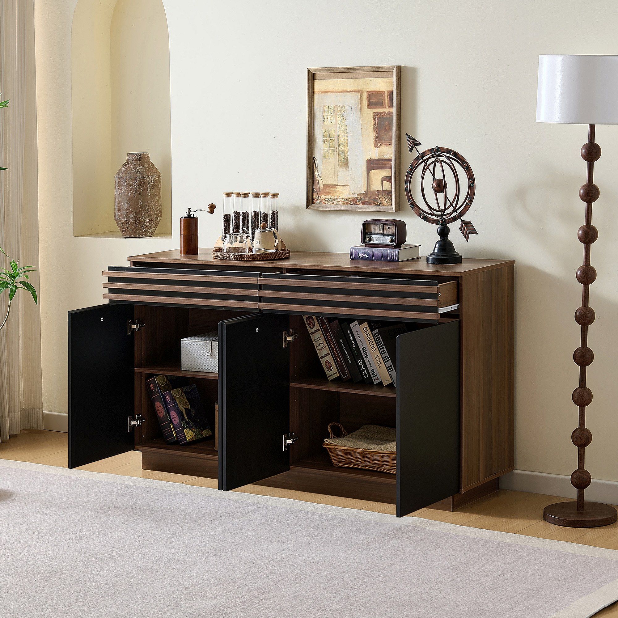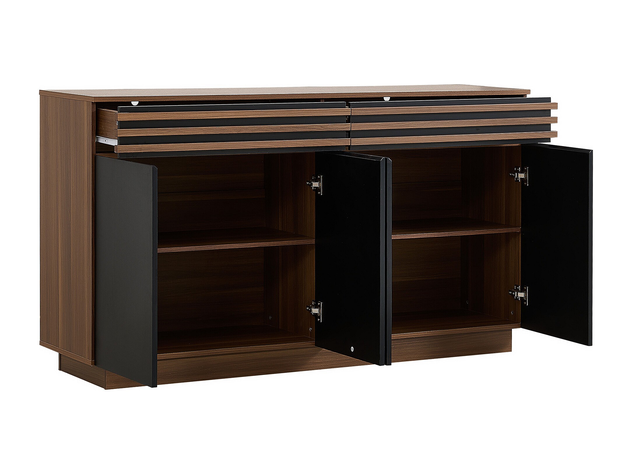 Buffet noir et marron avec 2 tiroirs et 4 portes, étagères réglables 150x40x85cm
