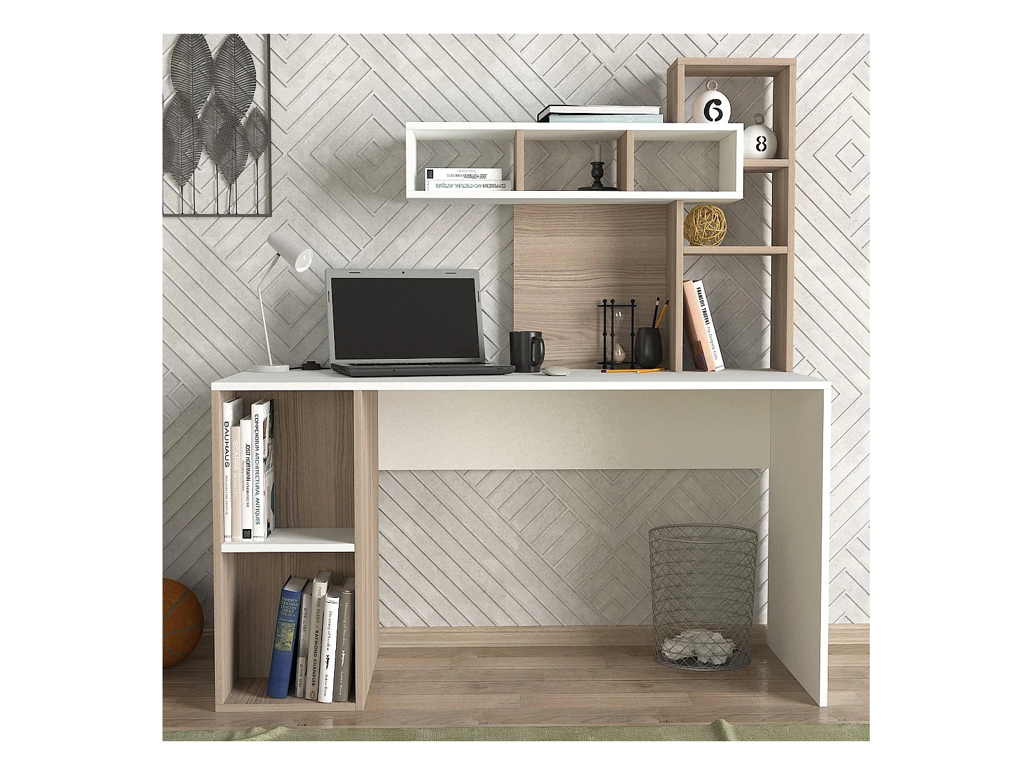 Ensemble bureau bibliothèque et étagère Officila Bois Naturel et Blanc