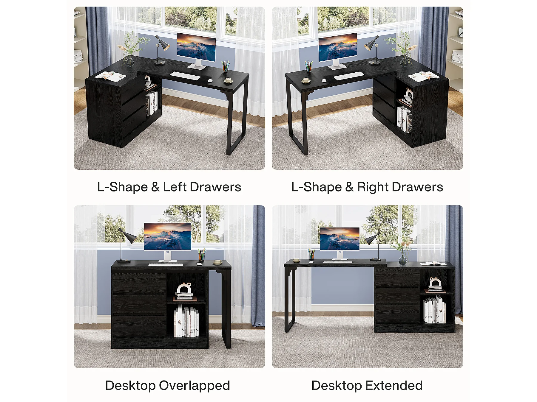 Bureau d'ordinateur en forme de L avec tiroirs et étagères, bureau d'angle réversible avec armoire de rangement
