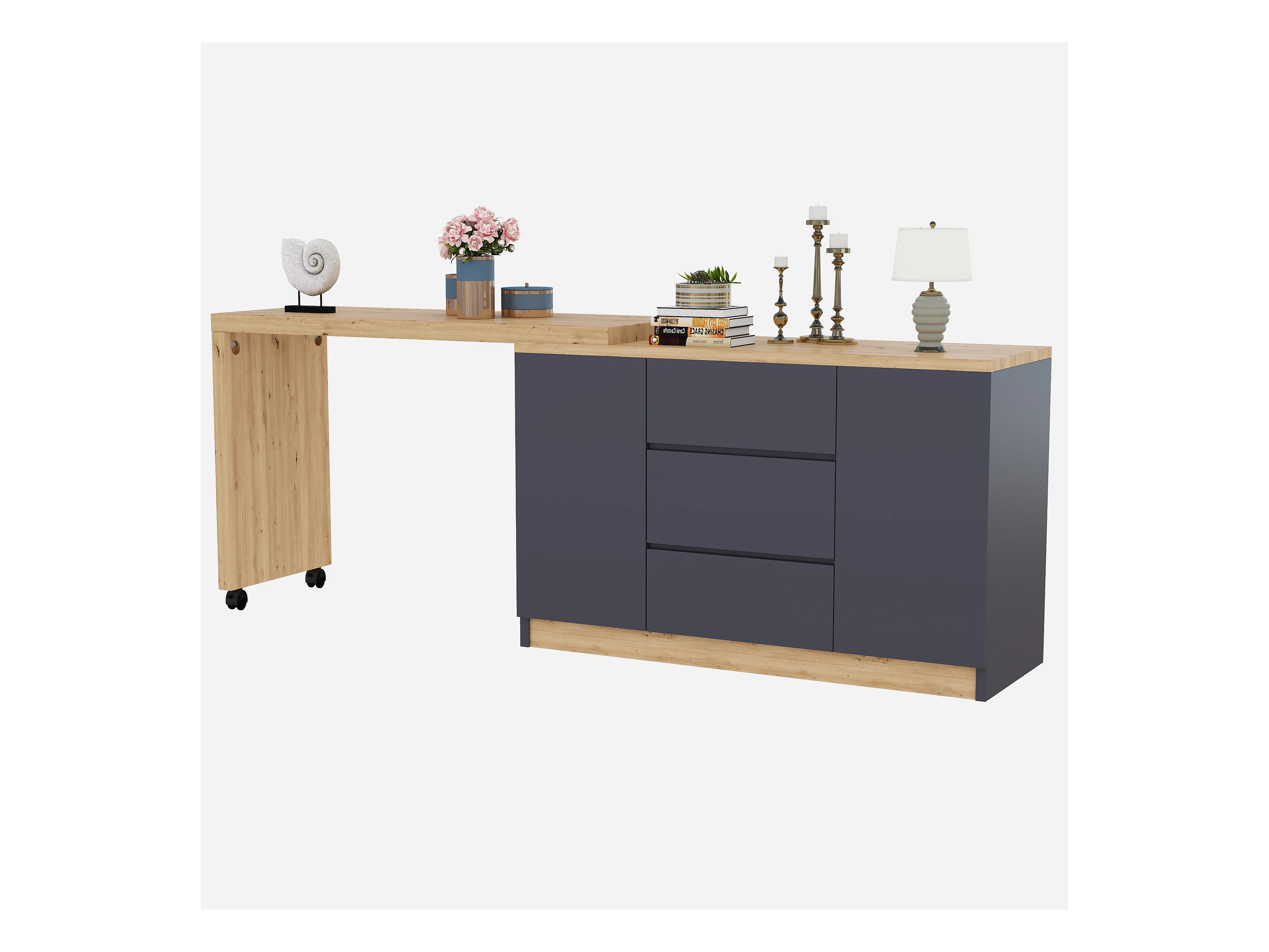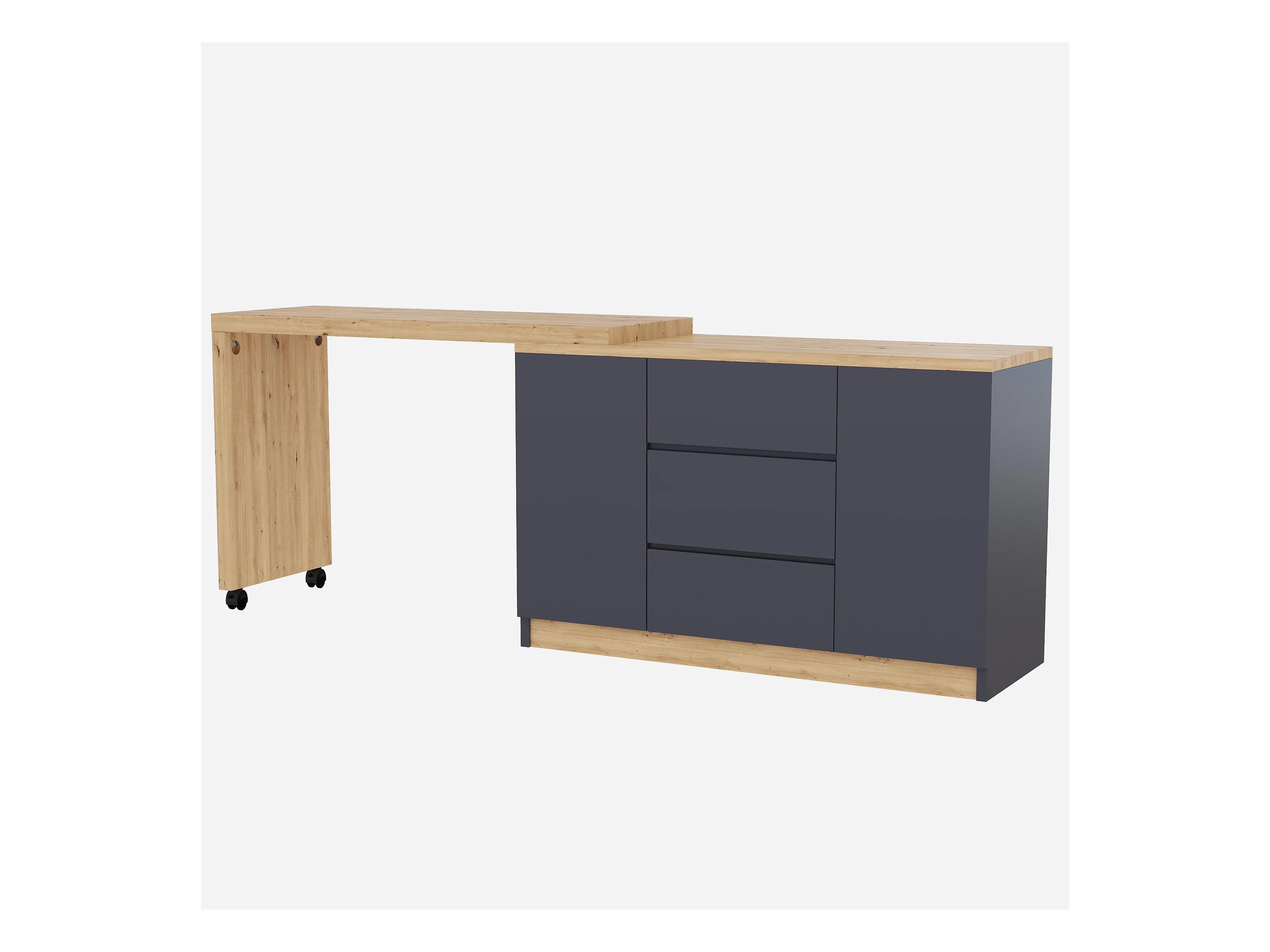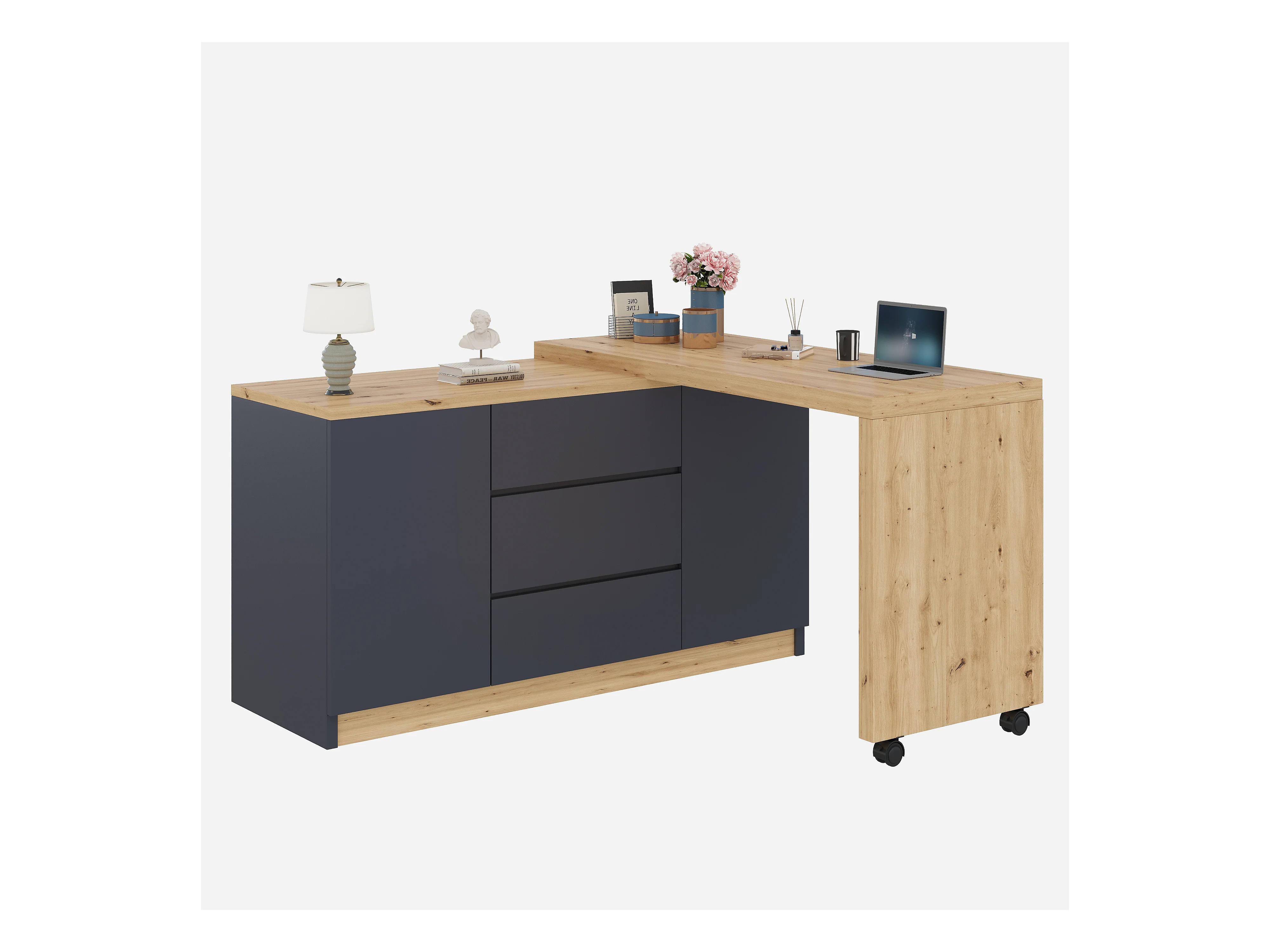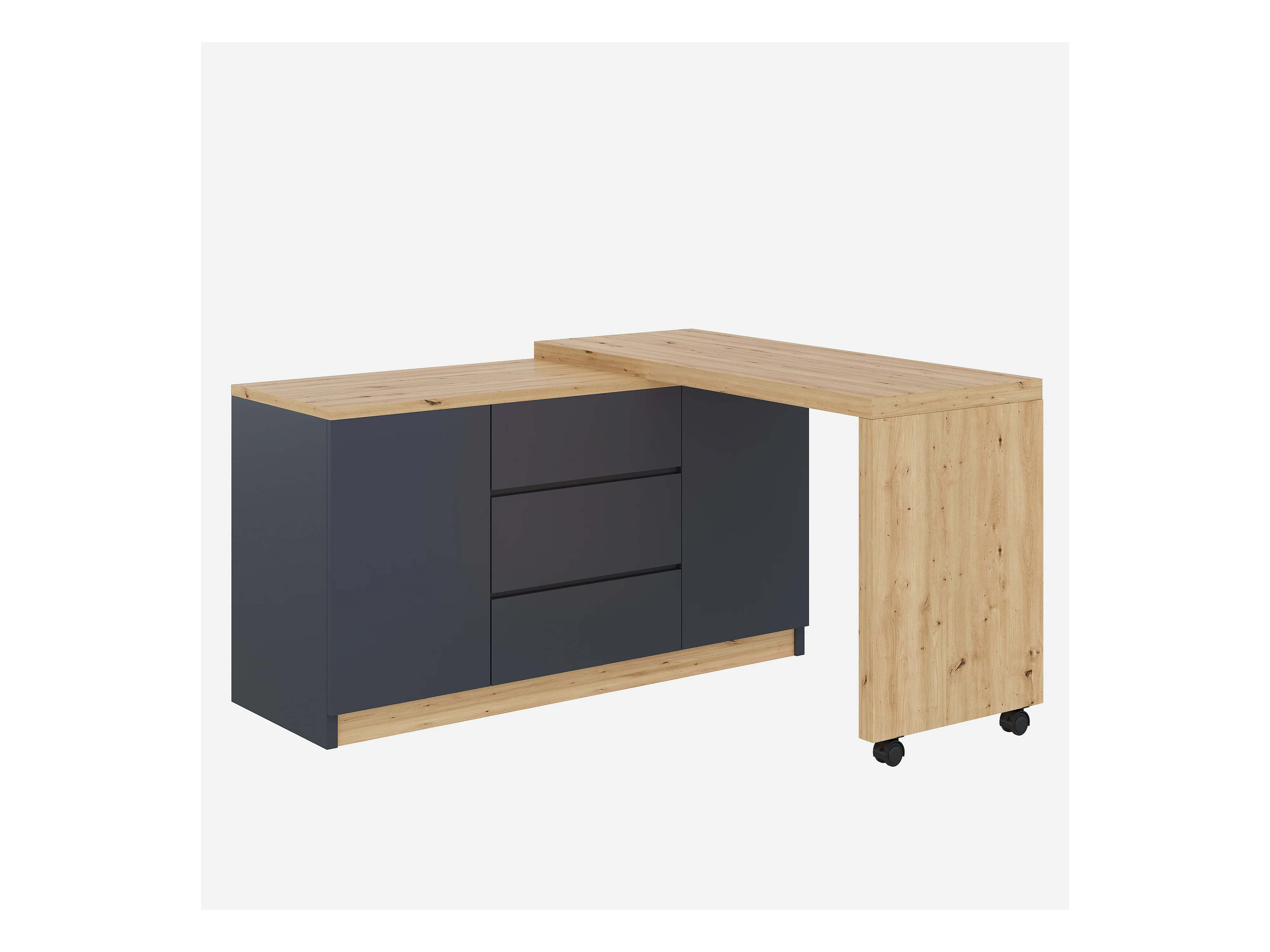 Bureau d'angle 120x50x76.5 cm - Plateau pivotant - 3 tiroirs et 2 portes - avec roulettes verrouillables - Gris + naturel