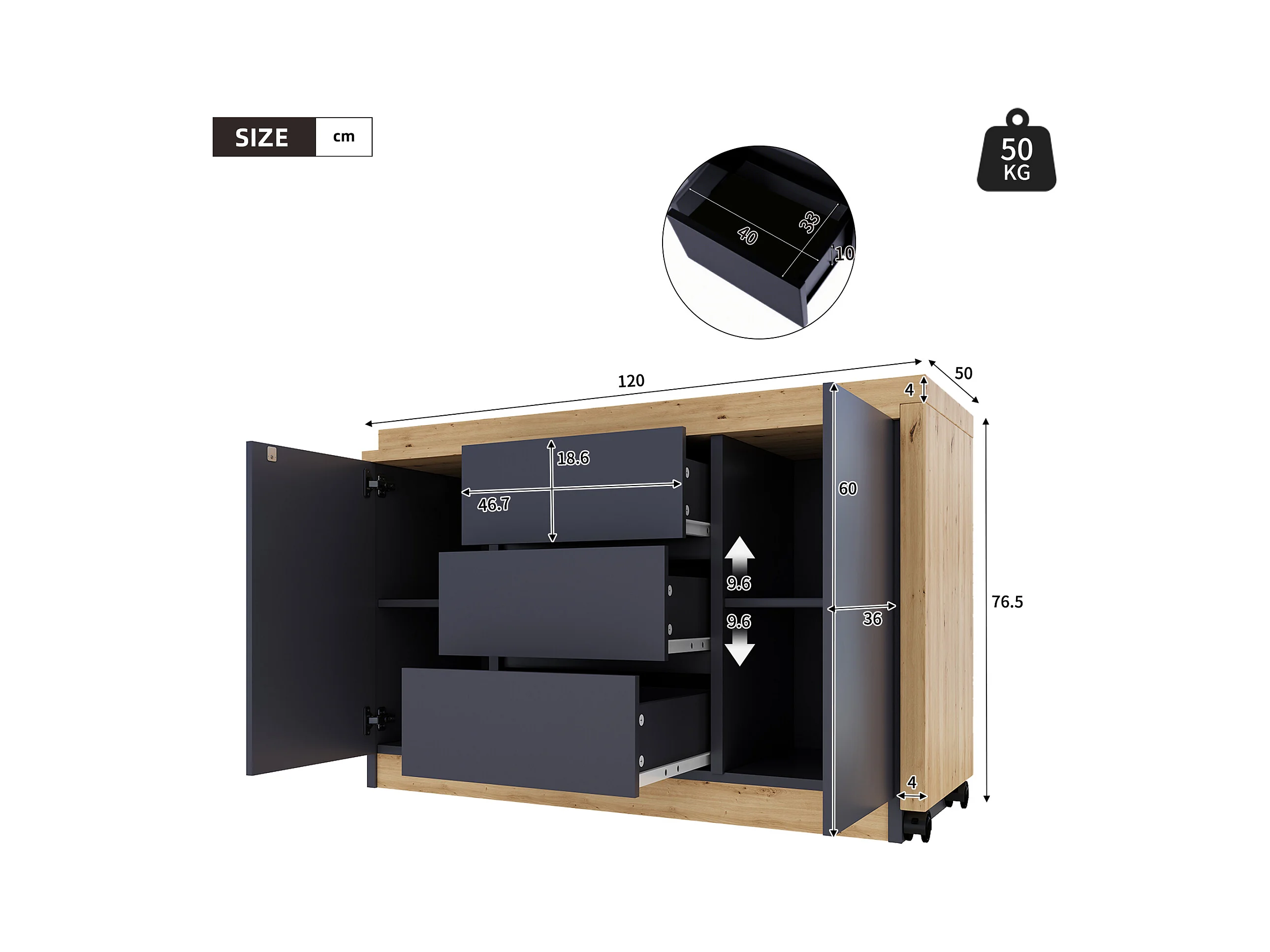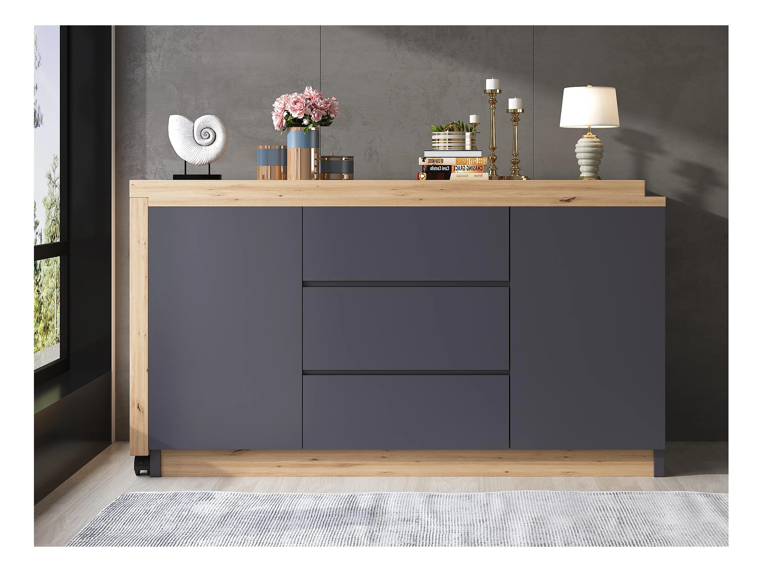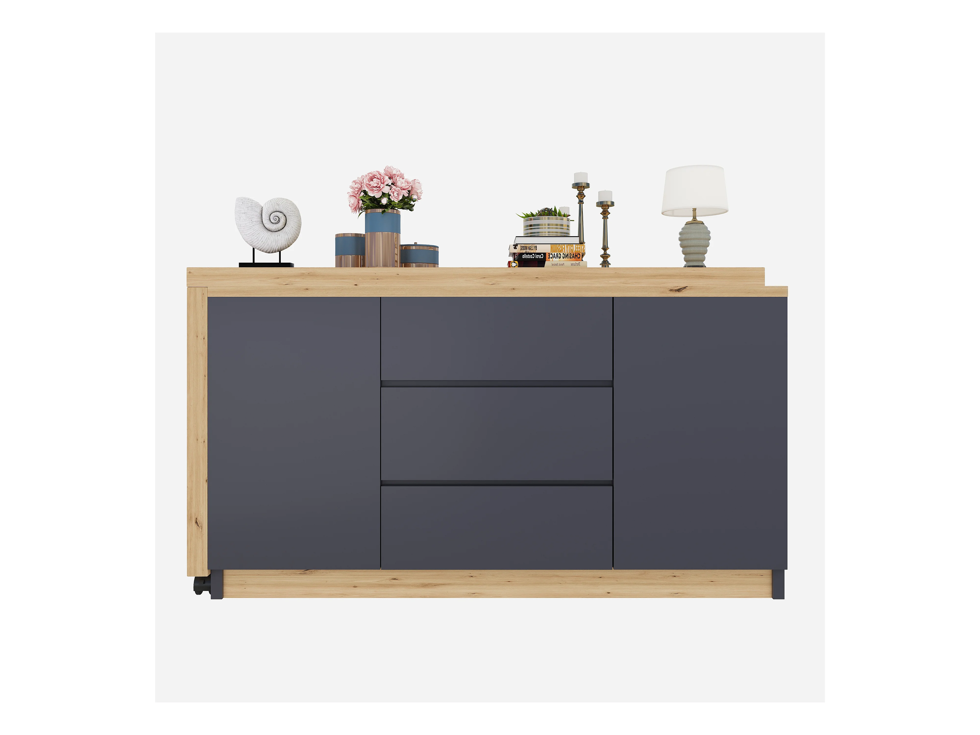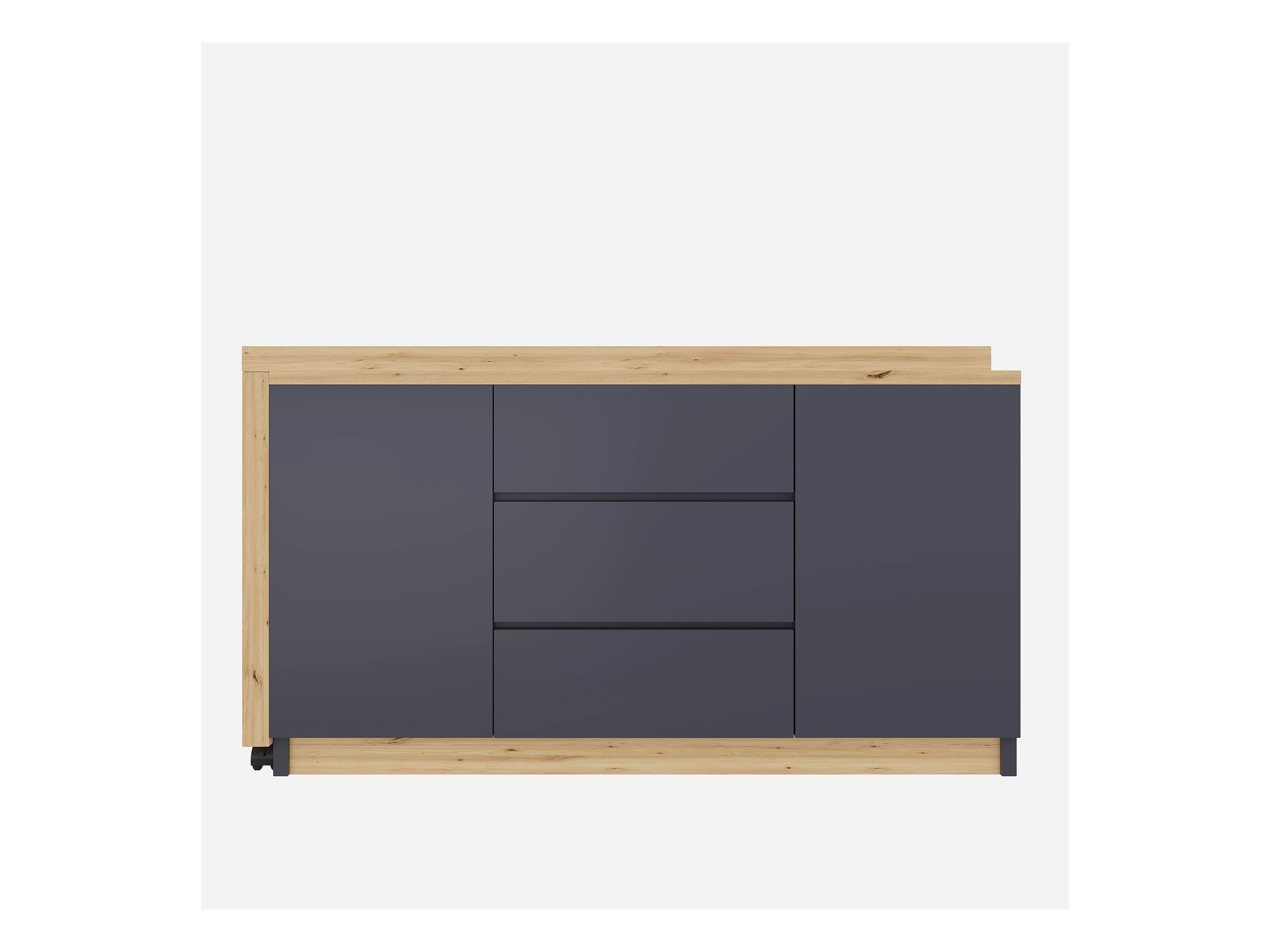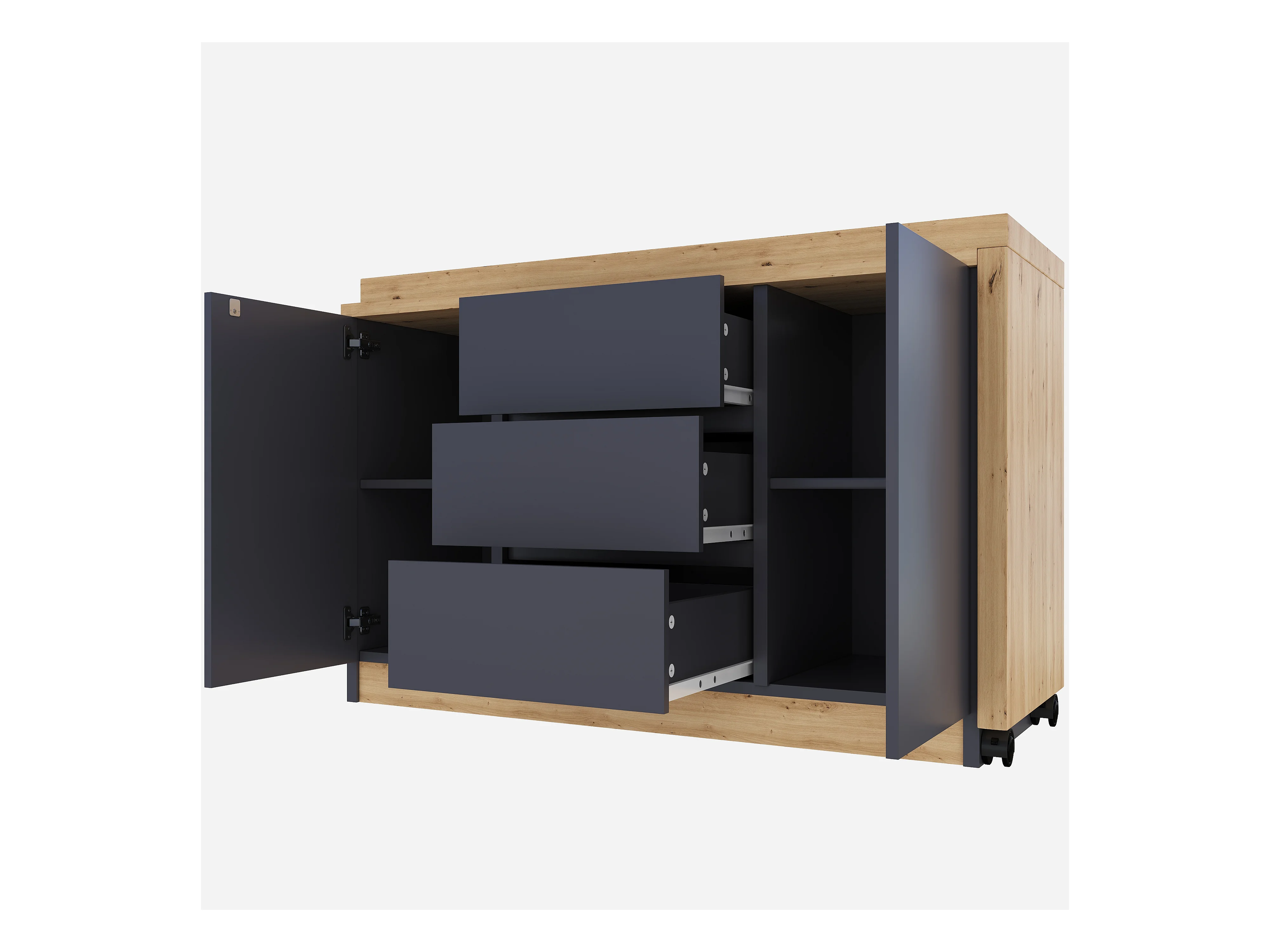 Bureau d'angle 120x50x76.5 cm - Plateau pivotant - 3 tiroirs et 2 portes - avec roulettes verrouillables - Gris + naturel