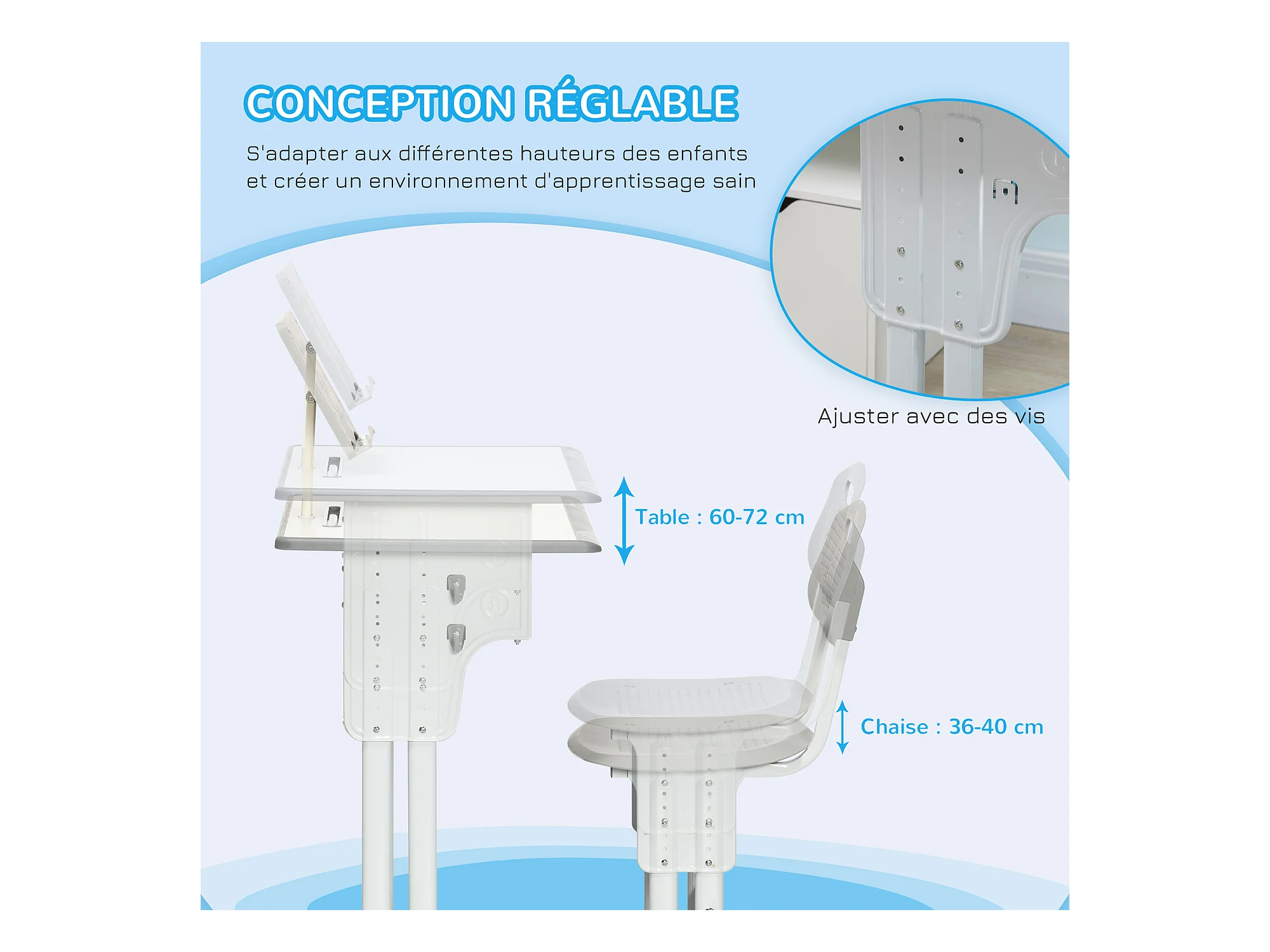 Bureau enfant avec chaise - ensemble bureau et chaise réglable - support de lecture, case - gris blanc