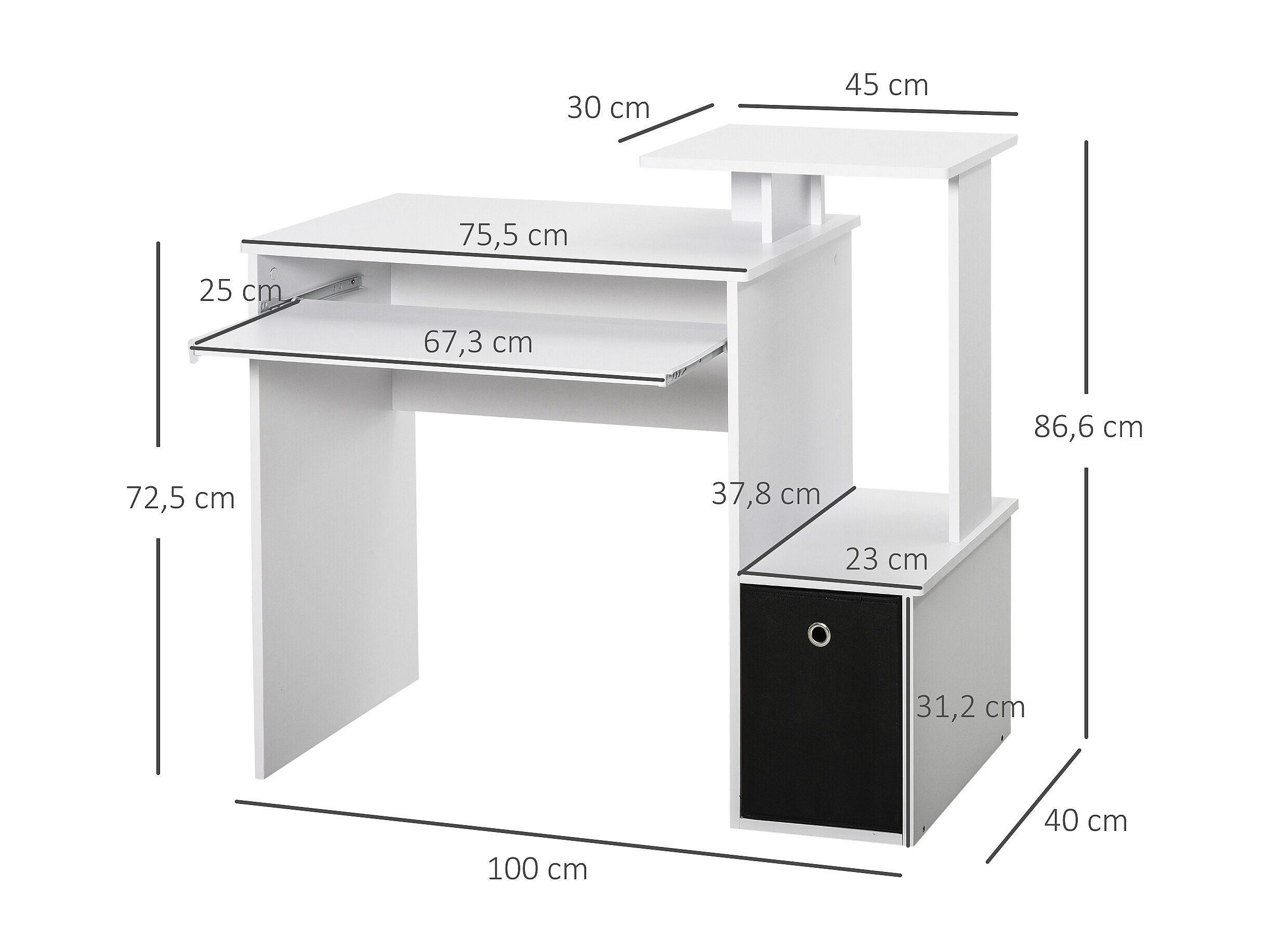 Bureau informatique multimédia étagères tablette clavier panier noir panneaux particules blanc