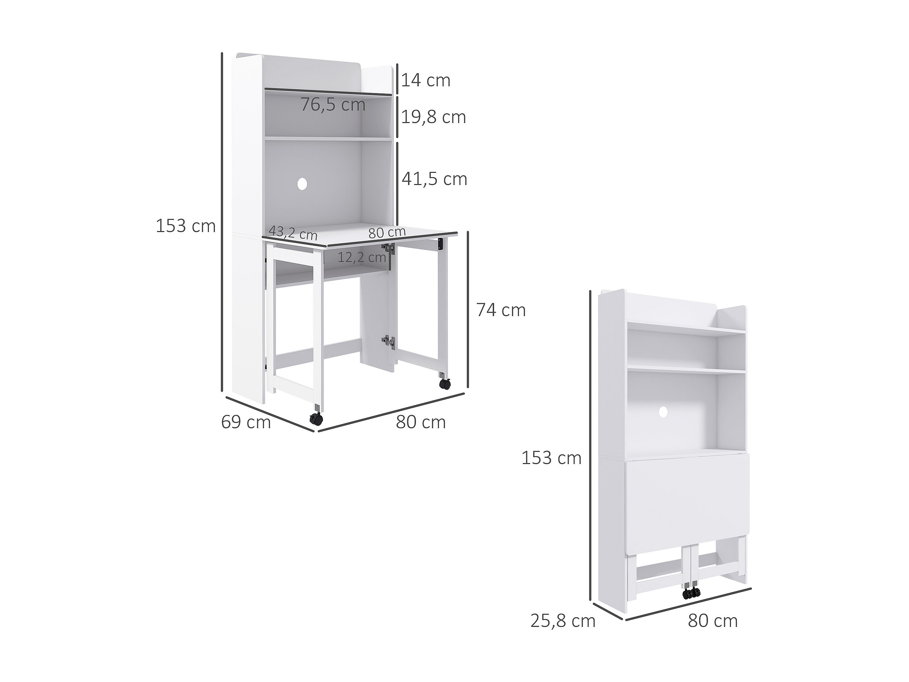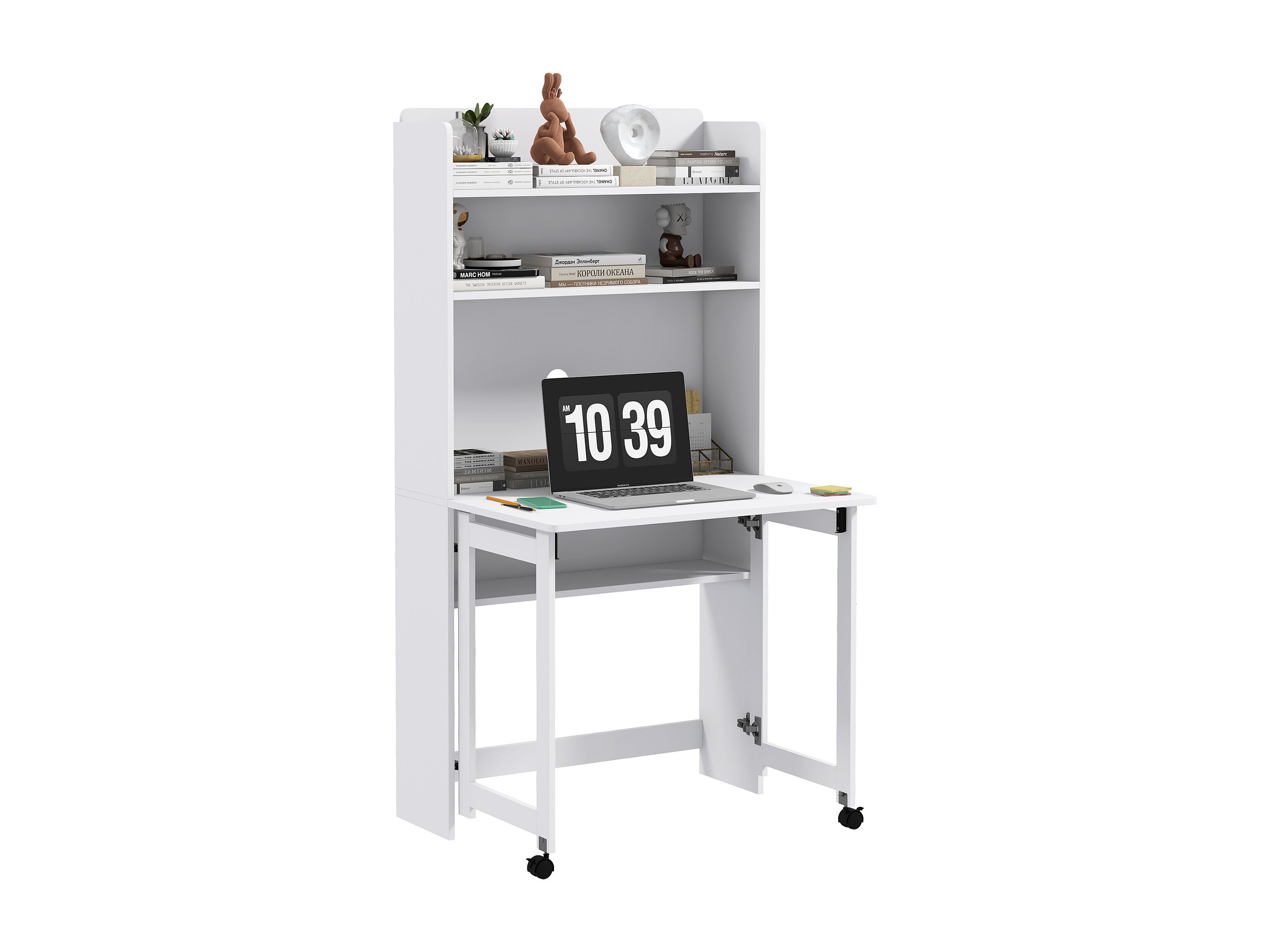 Bureau mural pliable table murale rabattable suspendue sur pied avec bibliothèque 3 étagères MDF blanc