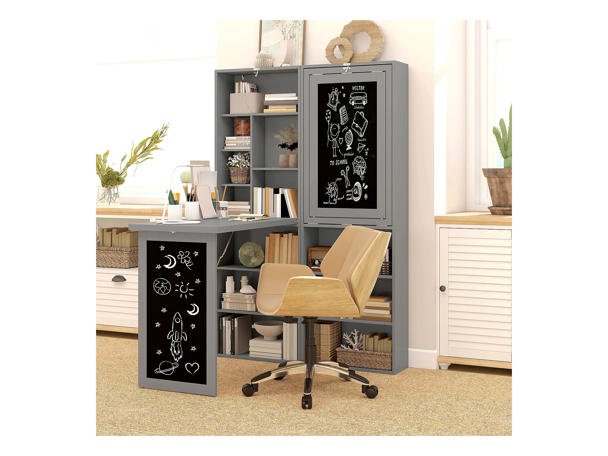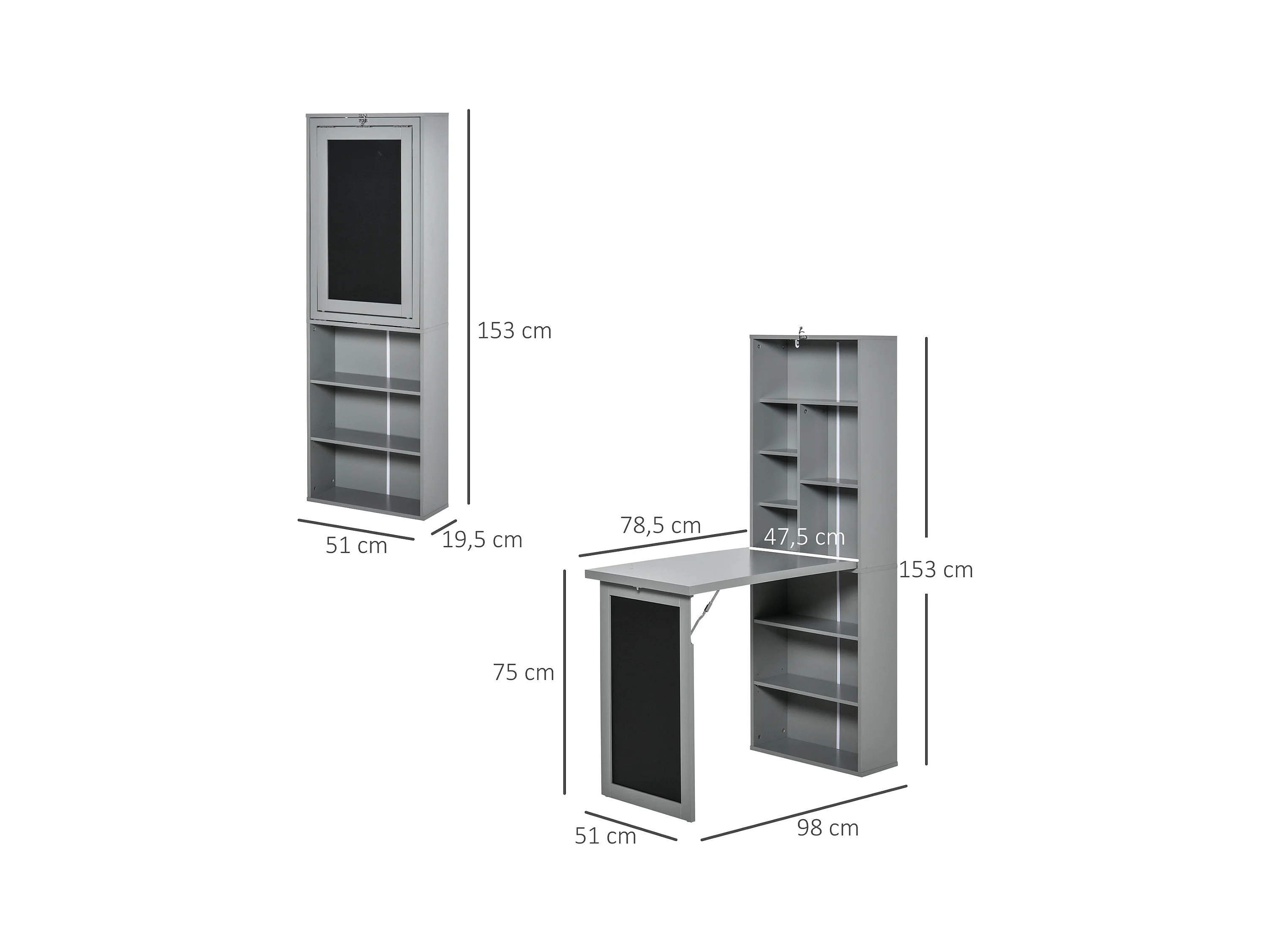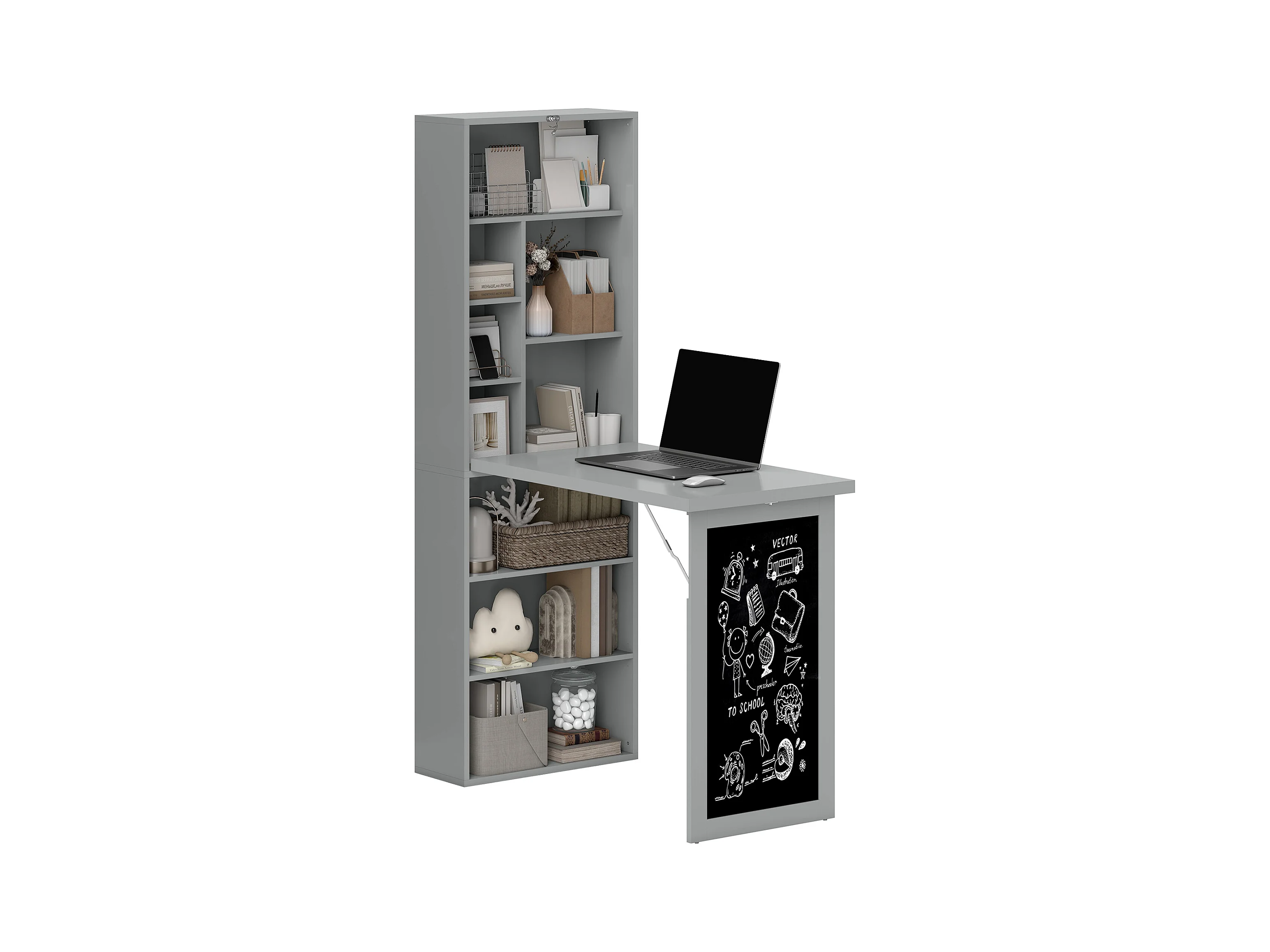 Bureau mural pliable table murale rabattable suspendue sur pied avec bibliothèque tableau à craie intégré panneaux particules gris
