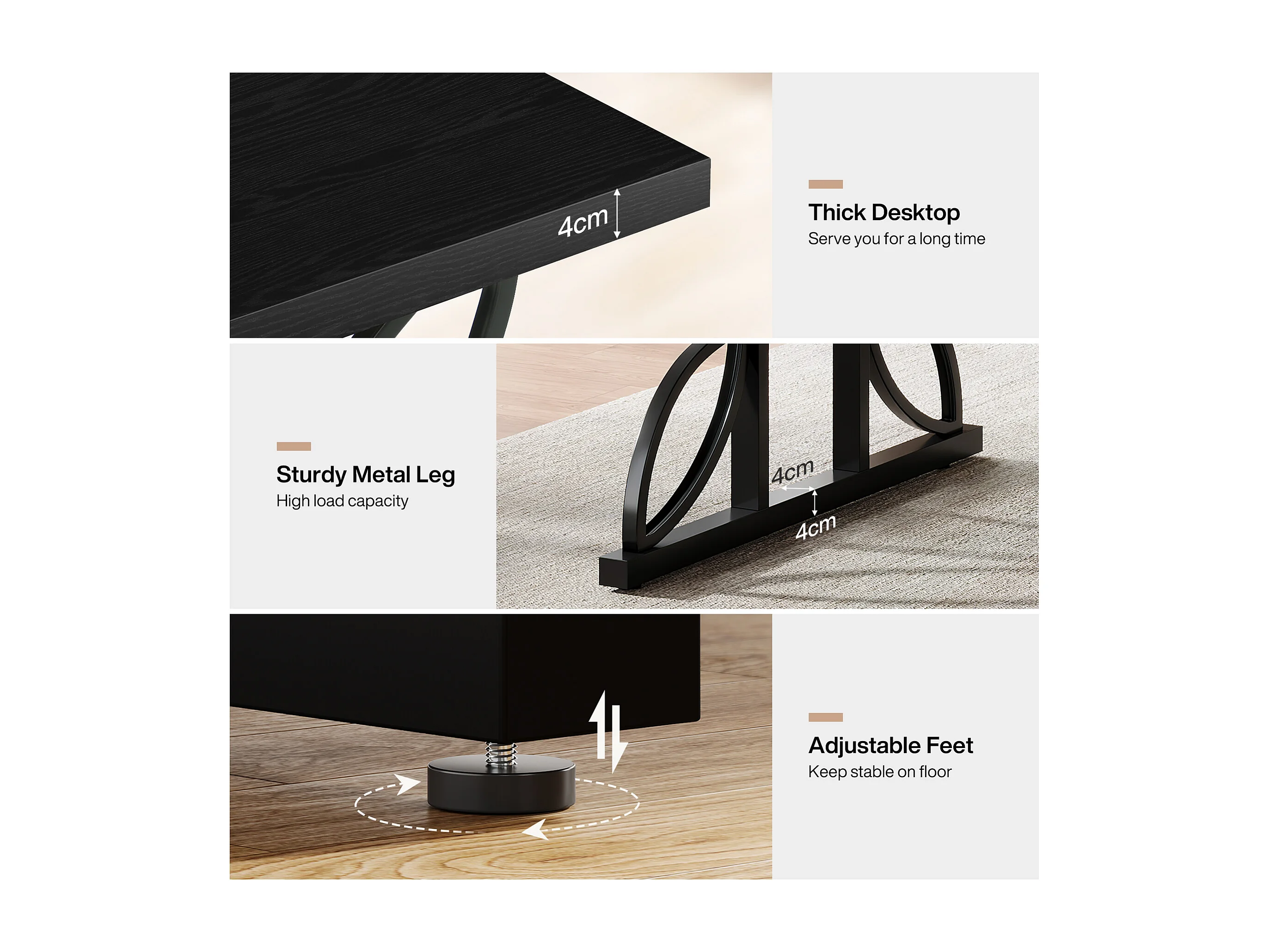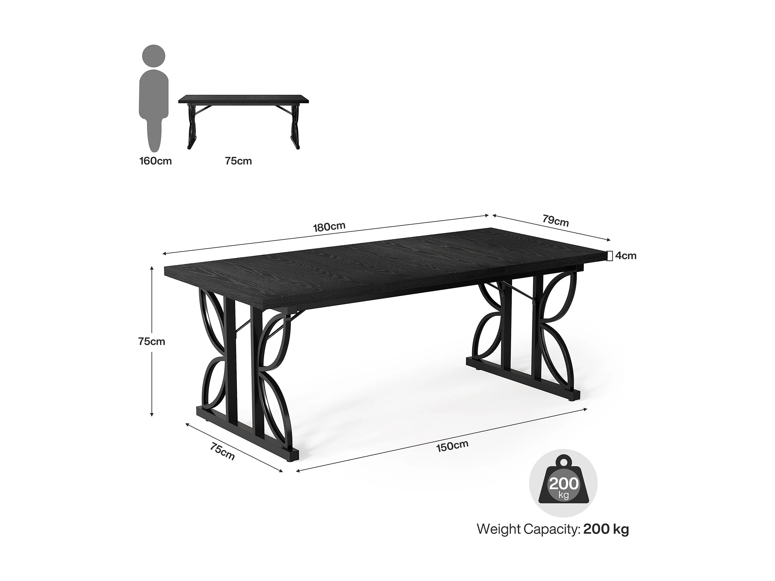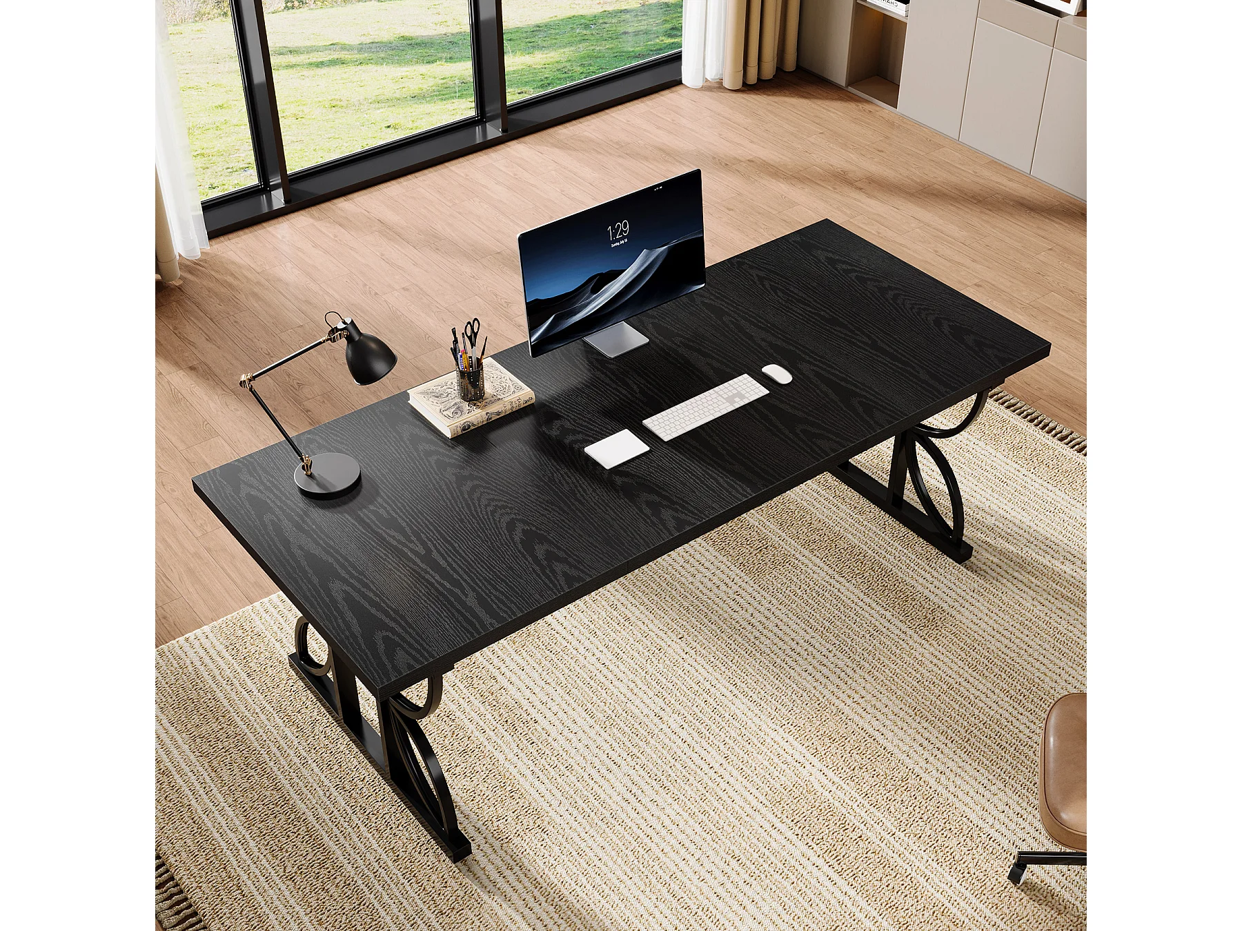 Bureau noir de 180 cm avec structure en métal, grand bureau d'ordinateur pour poste de travail à domicile