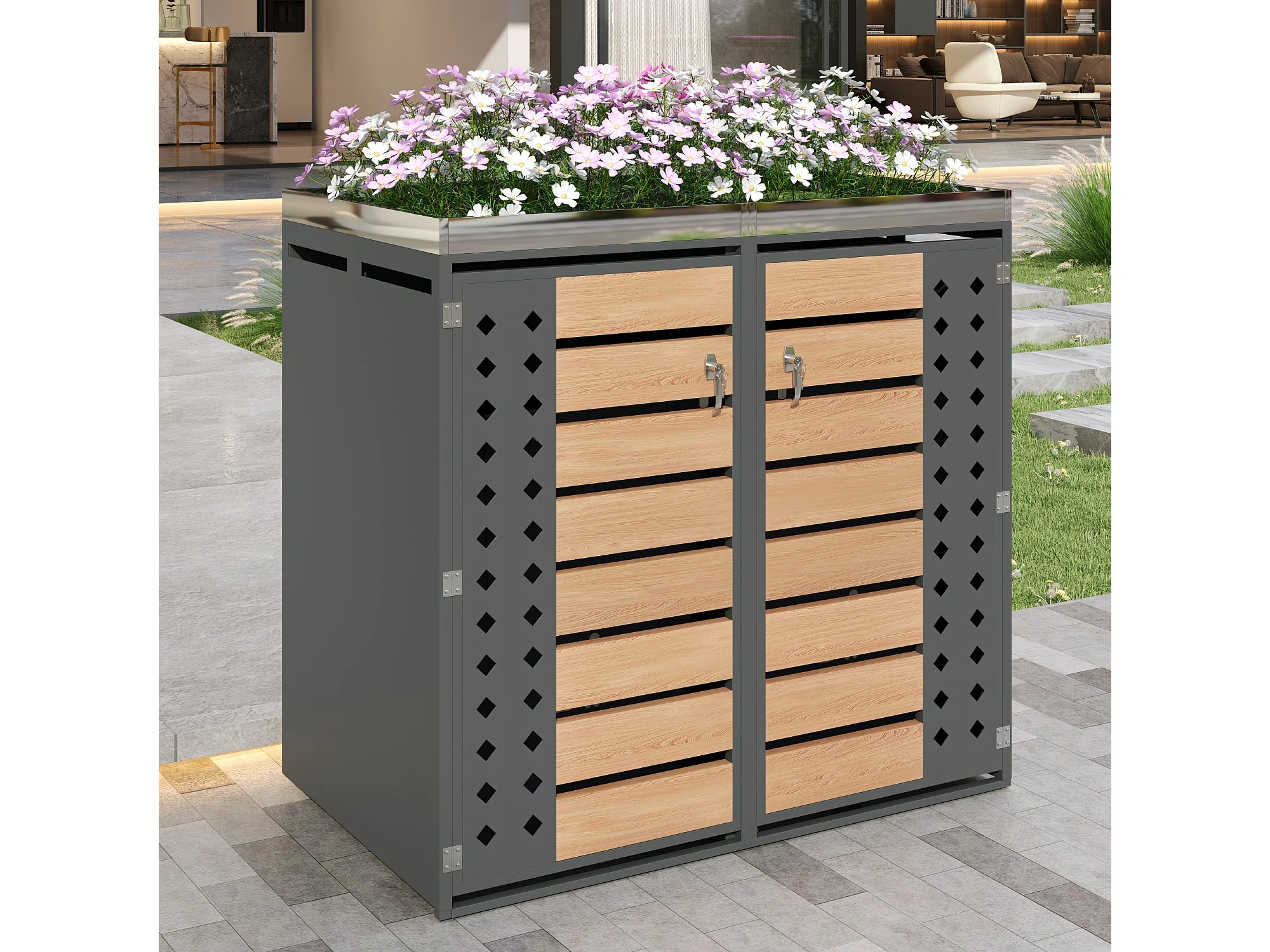 Cache-poubelle double 2x240L avec Jardinière supérieure - Design Perforé Latéral - Acier galvanisé aspect Bois Horizontal - Gris Anthracite