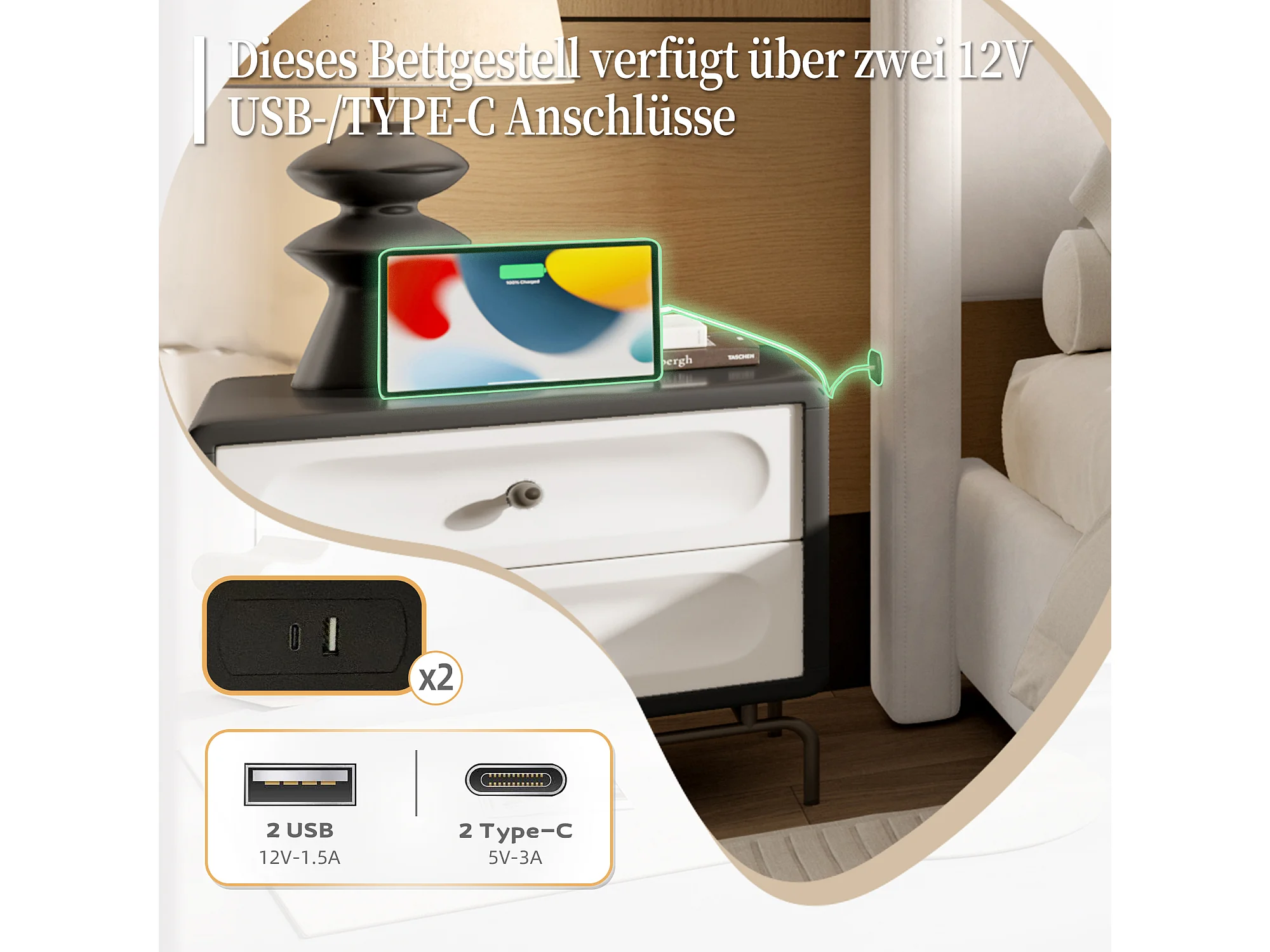 Cadre de lit capitonné moderne - 140 x 190 cm - avec tête et pied de lit hauts + USB - velours - beige