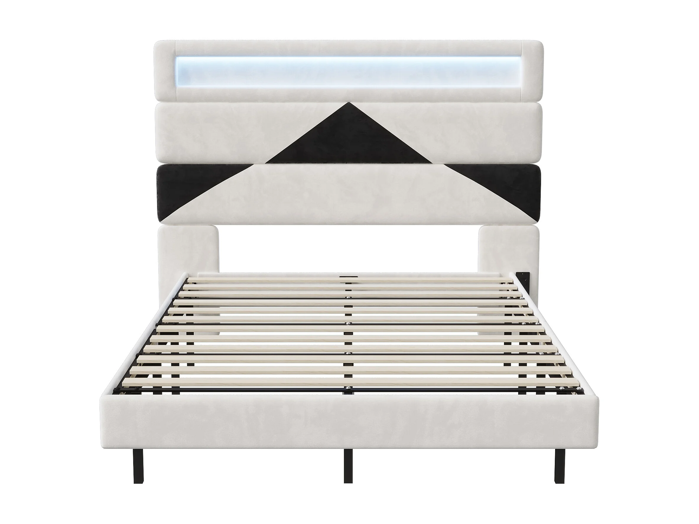 Cadre de lit double 140*190cm,double port de charge USB + barre lumineuse LED, blanc cassé, velours