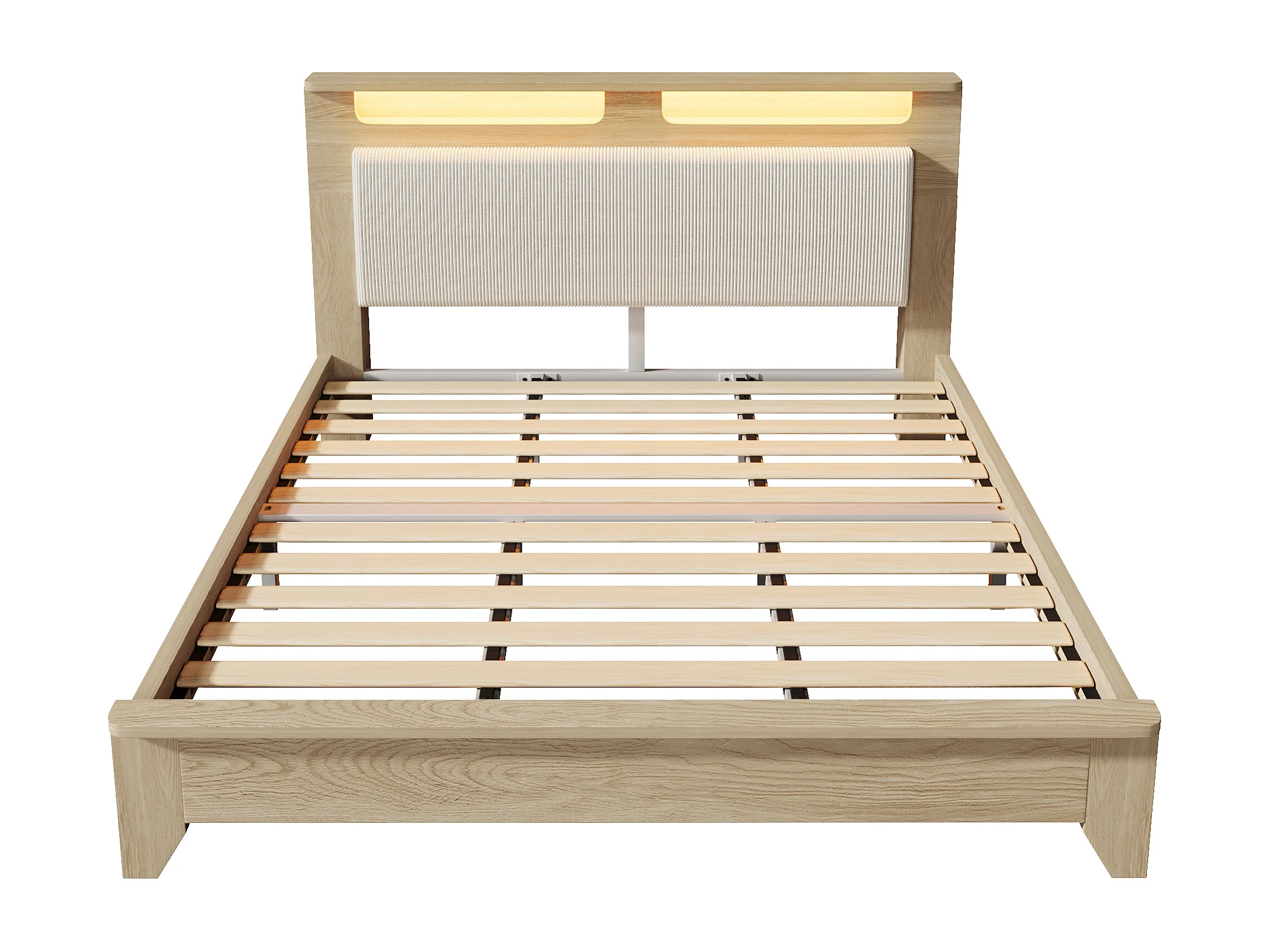 Cadre de lit double en bois 180x200cm avec éclairage LED, dossier en velours côtelé, sans matelas