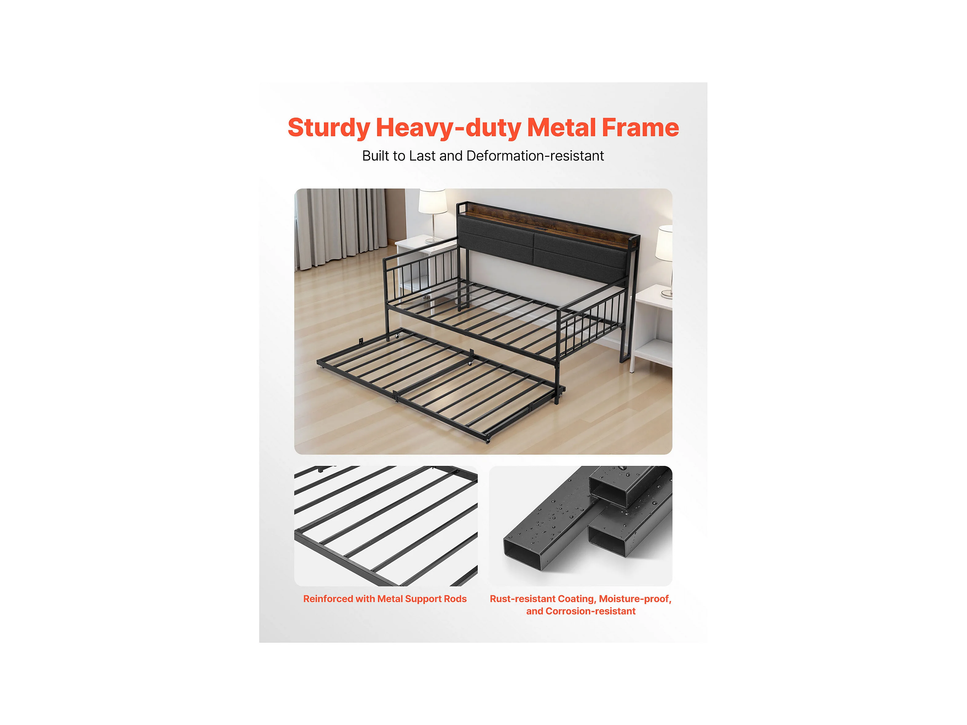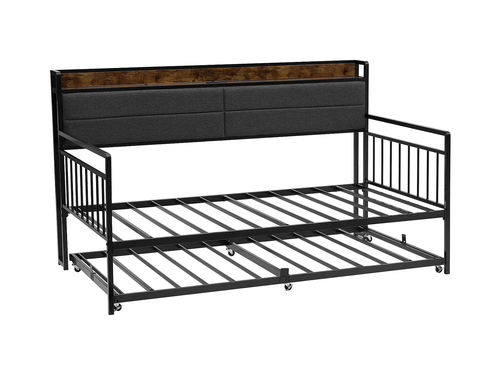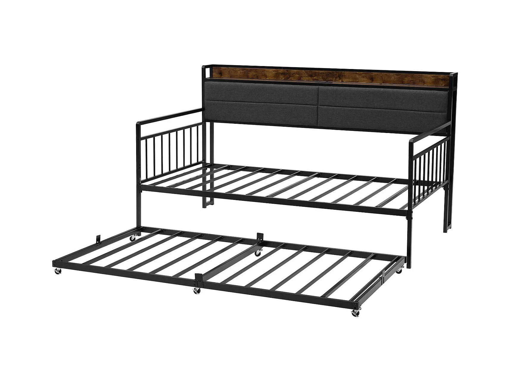 Cadre de Lit SucceBuy de Jour Jumeau en Métal Robuste, Lit Gigogne Jumeau sans Matelas, avec Roues, Station de Charge et Support à Lattes Métalliques