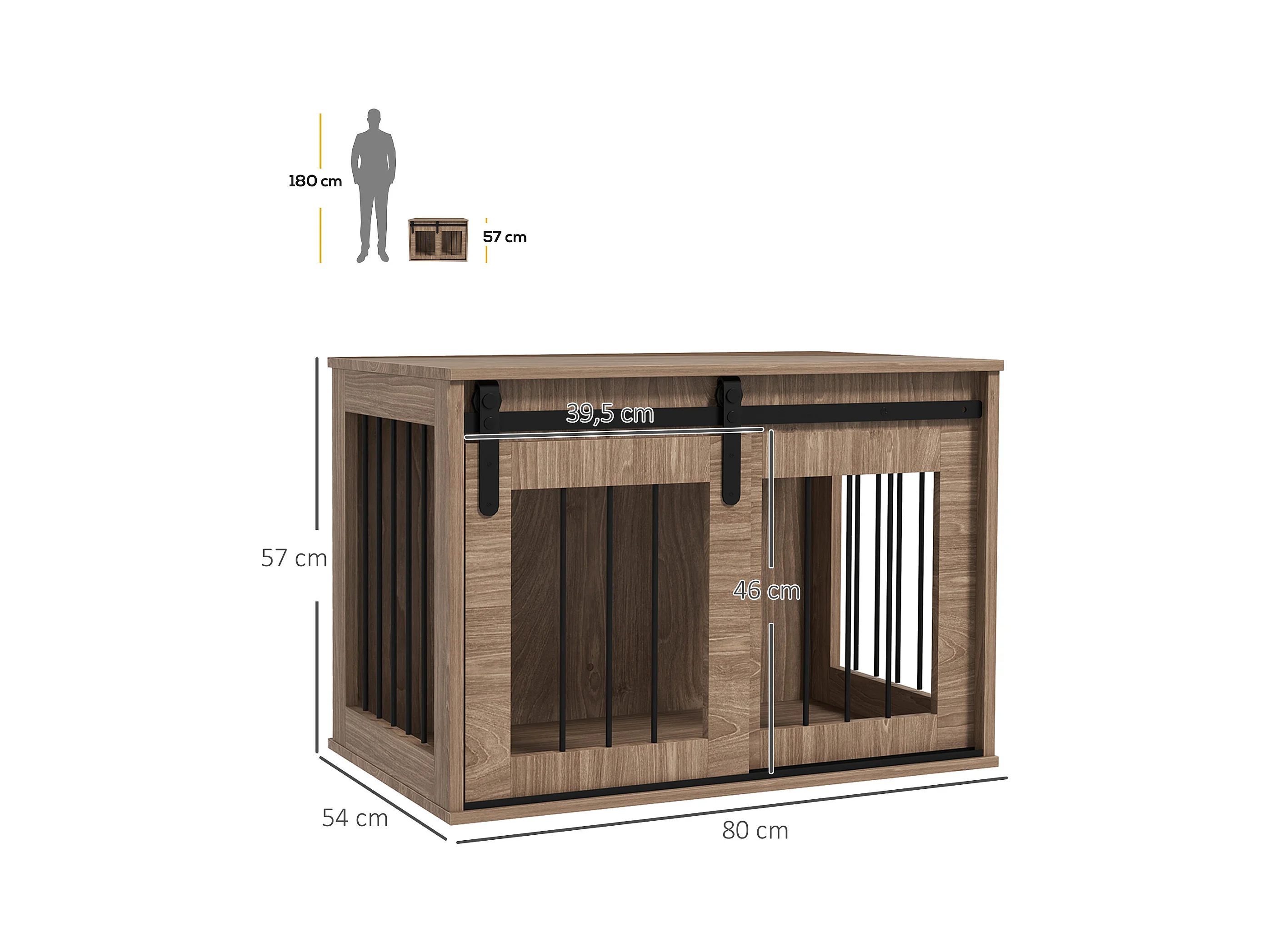 Cage pour chien sur pied - 2 portes verrouillables, coussin déhoussable inclus - acier filaire noir panneaux aspect bois brun