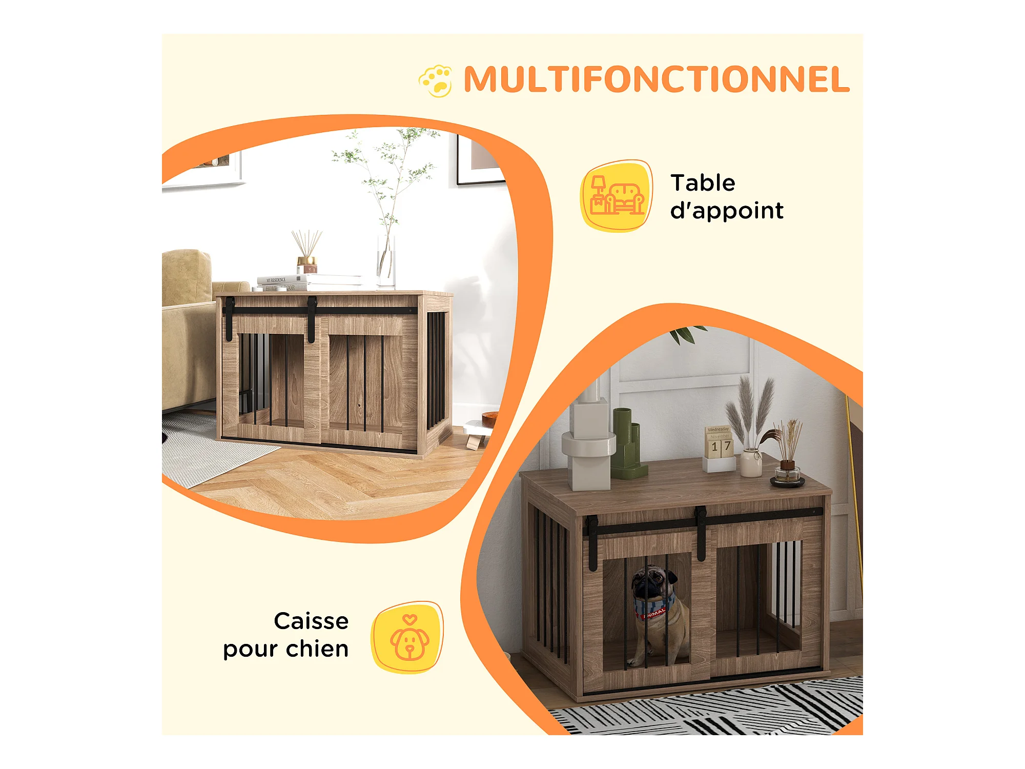 Cage pour chien animaux table d'appoint 2 en 1 - 2 portes verrouillables - dim. 76L x 54,5l x 56H cm - MDF acier blanc