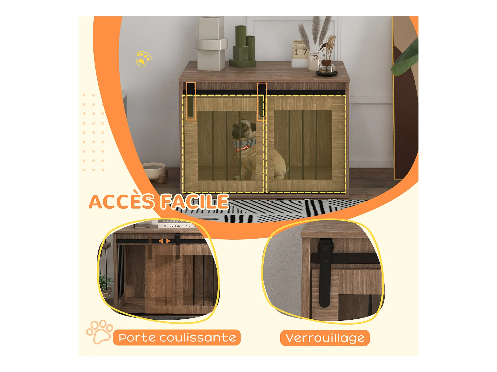 Cage pour chien animaux style industriel - porte coulissante verrouillable - acier noir panneaux aspect bois