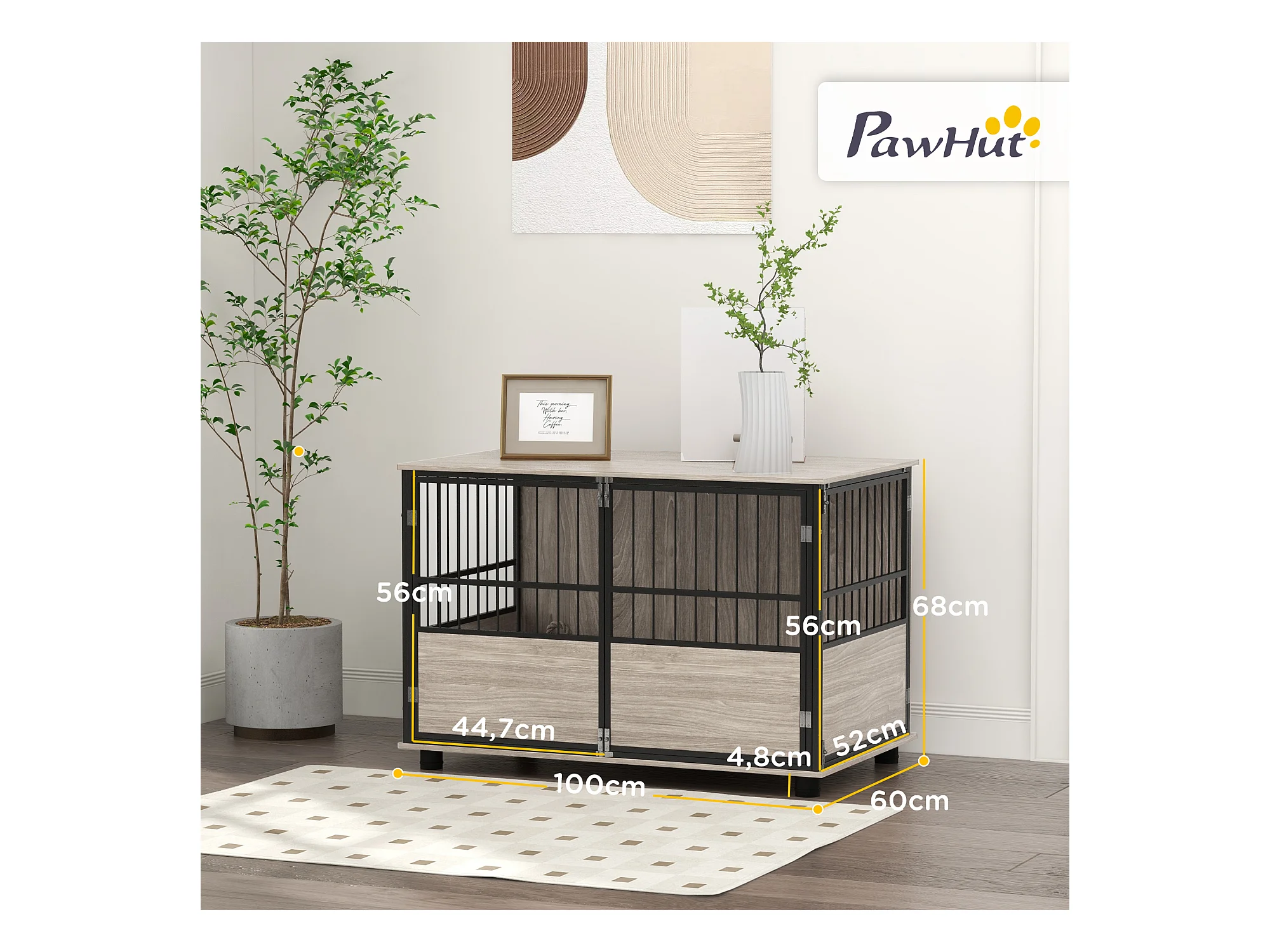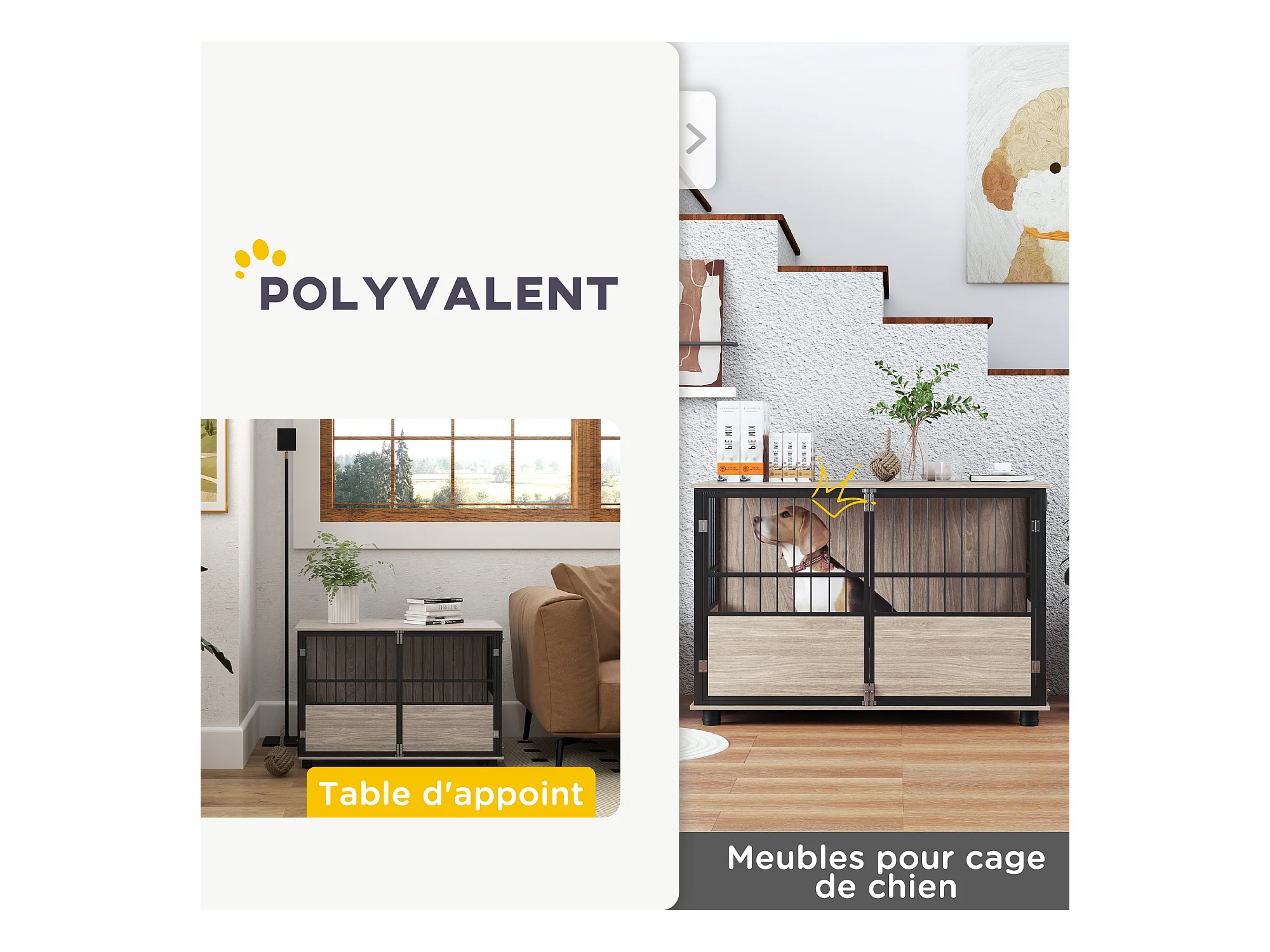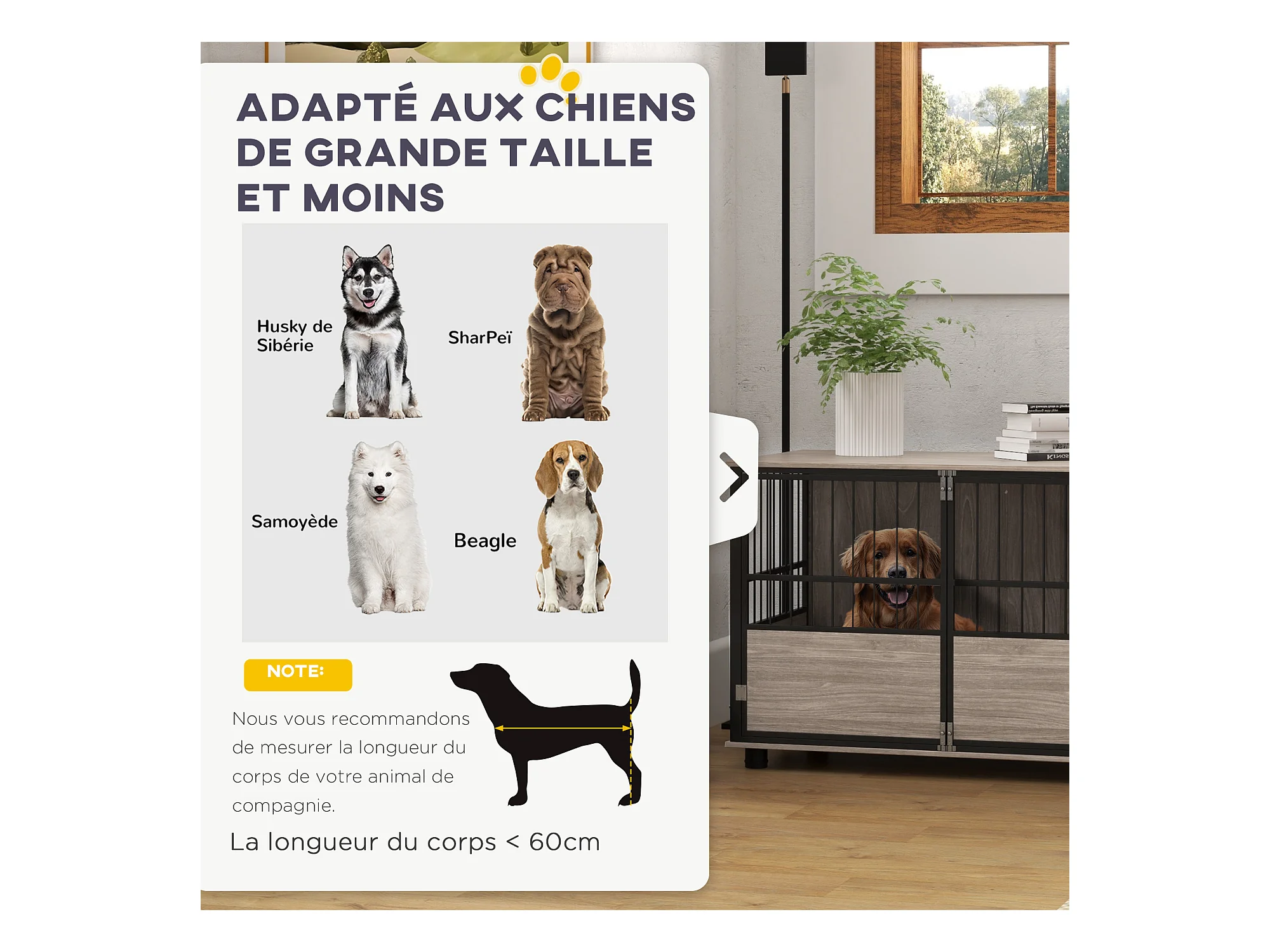 Cage pour chien animaux style indisutriel - porte coulissante verrouillable - acier noir panneaux aspect bois