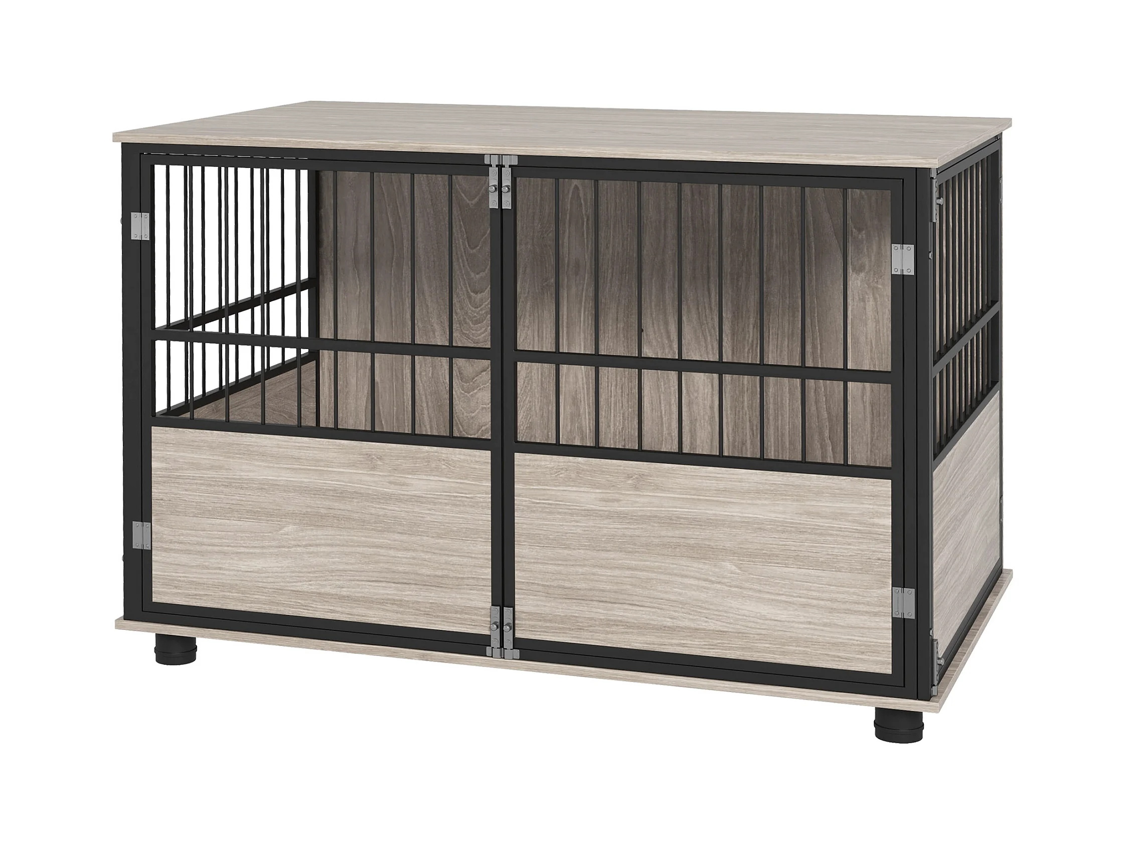 Cage pour chien animaux style industriel - porte coulissante verrouillable - acier noir panneaux aspect bois