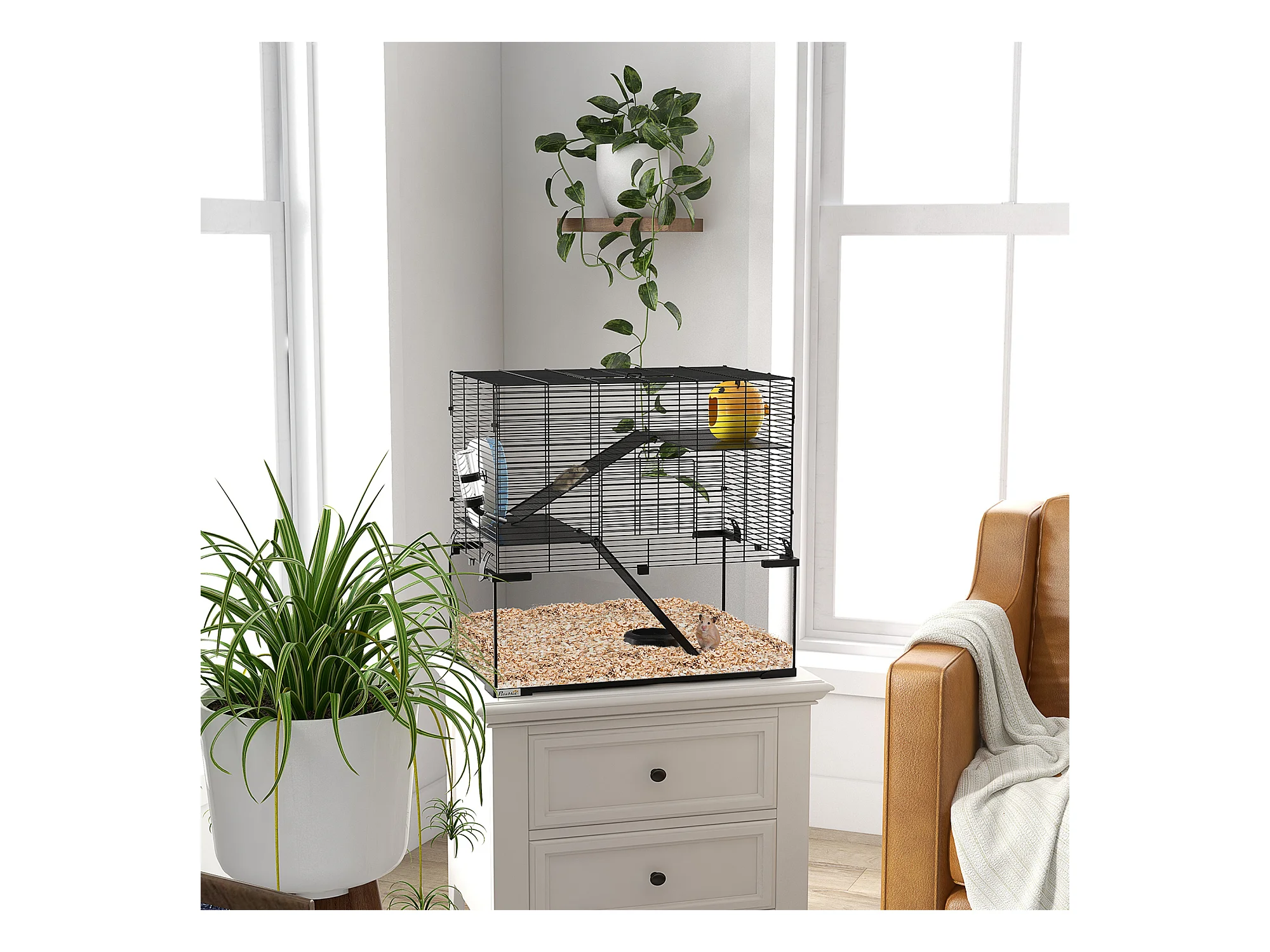 PawHut Cage pour Petits Animaux Roulante 3 Rampes 3 Plates-formes Plat et Bouteille d'Eau Bac Inférieur Amovible Acier PP Noire