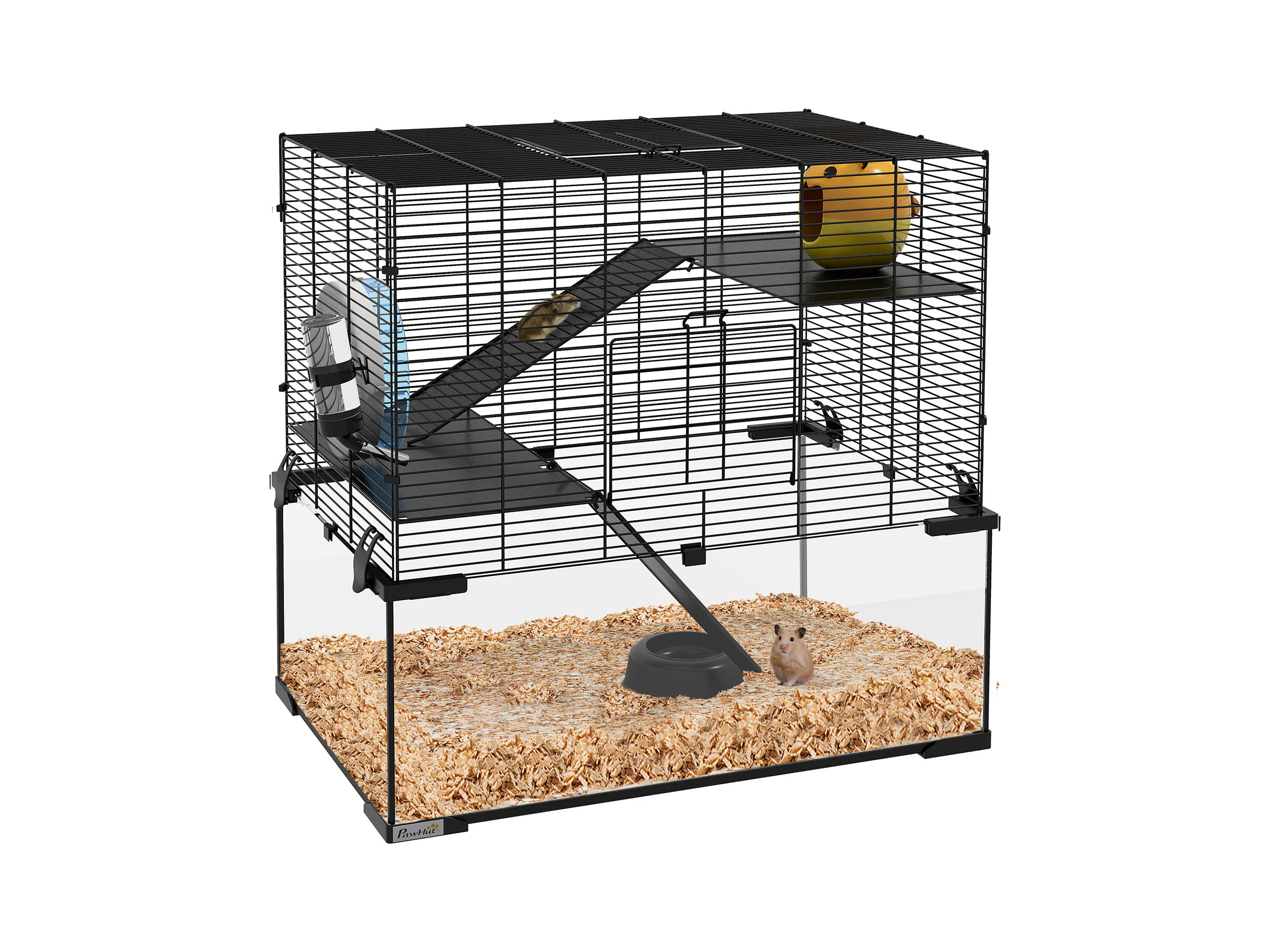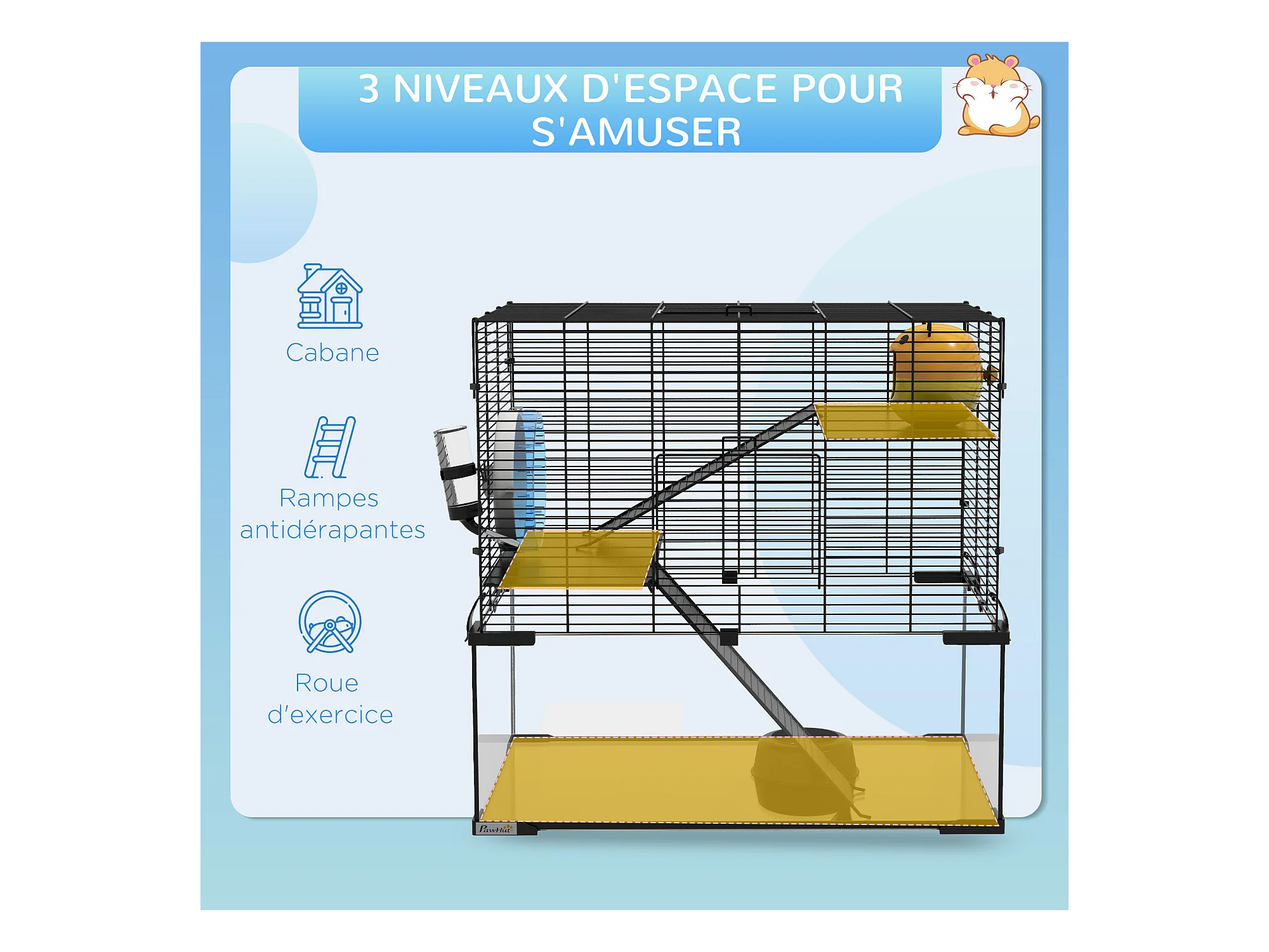 Cage rongeur hamster, 3 niveaux avec roue, rampes, maisonnette, abreuvoir, mangeoire, 60L x 40l x 57H cm, noir