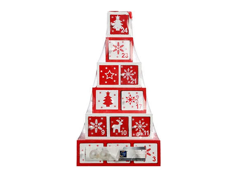 Calendrier de l'Avent LED en bois - 24 tiroirs à remplir - villages, montagnes, forêts, rennes, étoiles - rouge