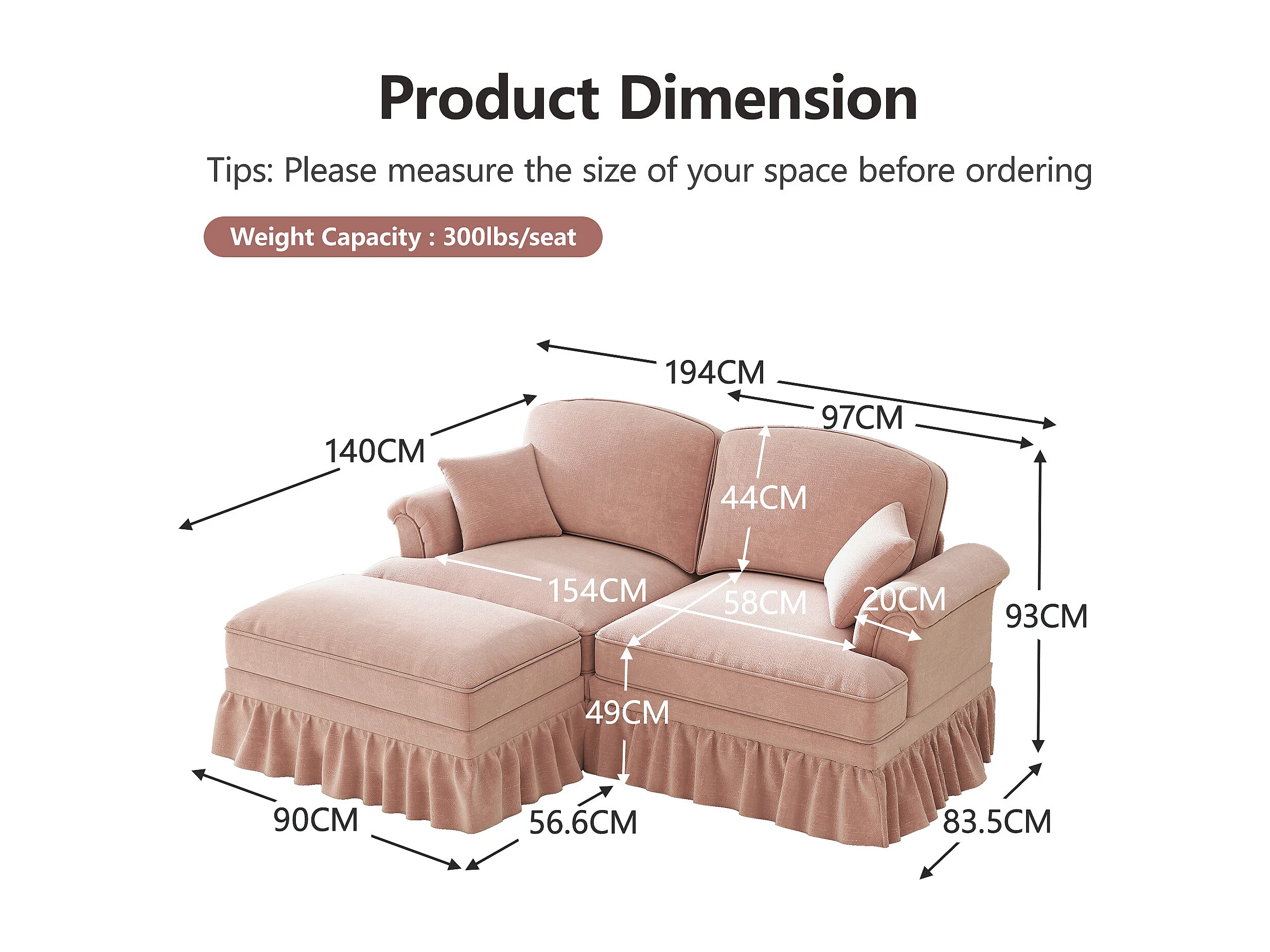 Canapé 2 places chesterfield en chenille rose - avec pouf et 2 oreillers - cantonnière amovible - 194x140x93cm