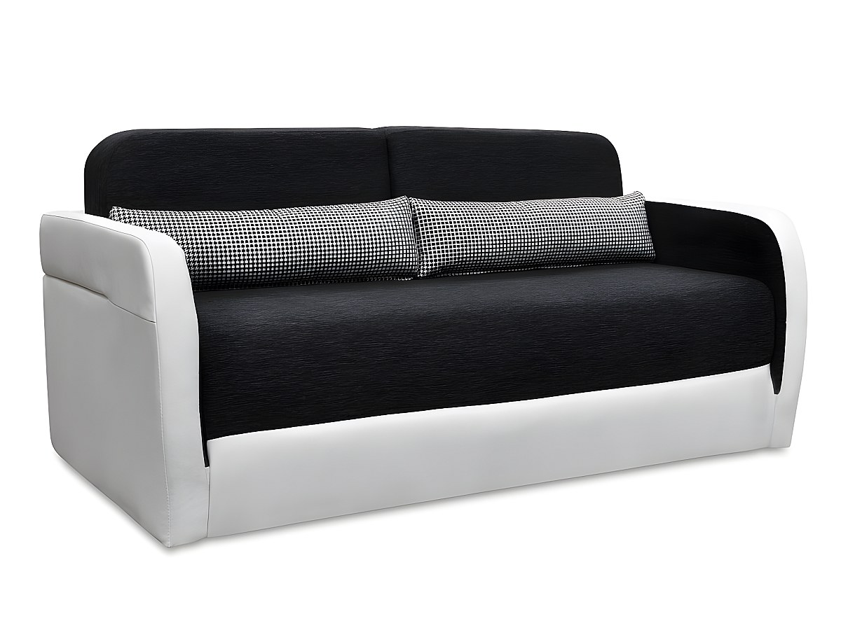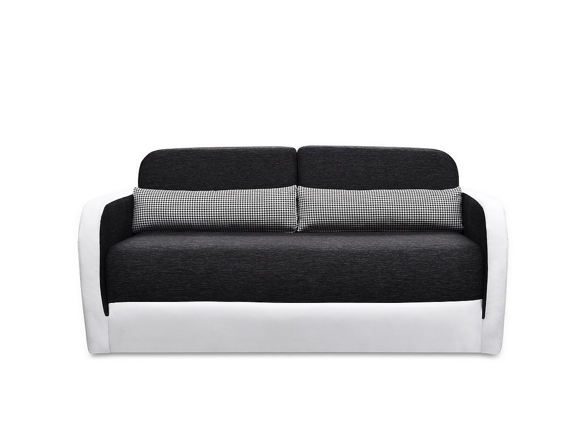 Canapé 2 places convertible VILO en tissu 100 % polyester et simili.  Coloris : Blanc et anthracite, blanc et gris ou taupe et chocolat. Assise garnie de mousse polyuréthane d'une densité de 22 kg/m3, de dacron et de ouate d'une densité de 150 kg/m2. Dossier déhoussable garni de mousse polyuréthane d'une densité de 18 kg/m3, de dacron et de ouate d'une densité de 150 kg/m2. Structure : Bois aggloméré. Pieds : plastique.2 coussins déco déhoussables offerts.