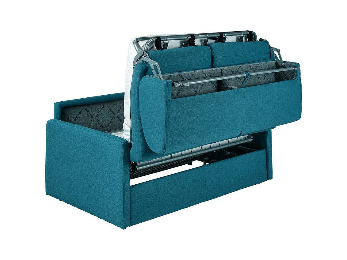 Canapé 2 places convertible express en tissu bleu turquoise - Couchage 120 cm - Matelas 22 cm avec mémoire de forme CALIFE