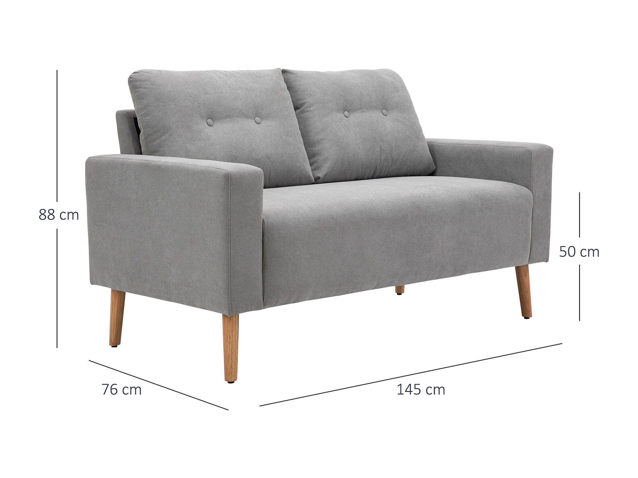 Canapé 2 places design scandinave dim. 145L x 76l x 88H cm pieds bois massif tissu gris clair