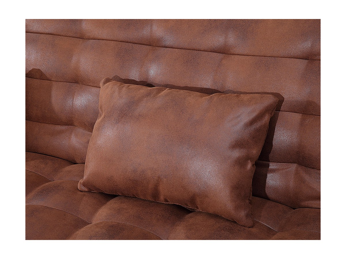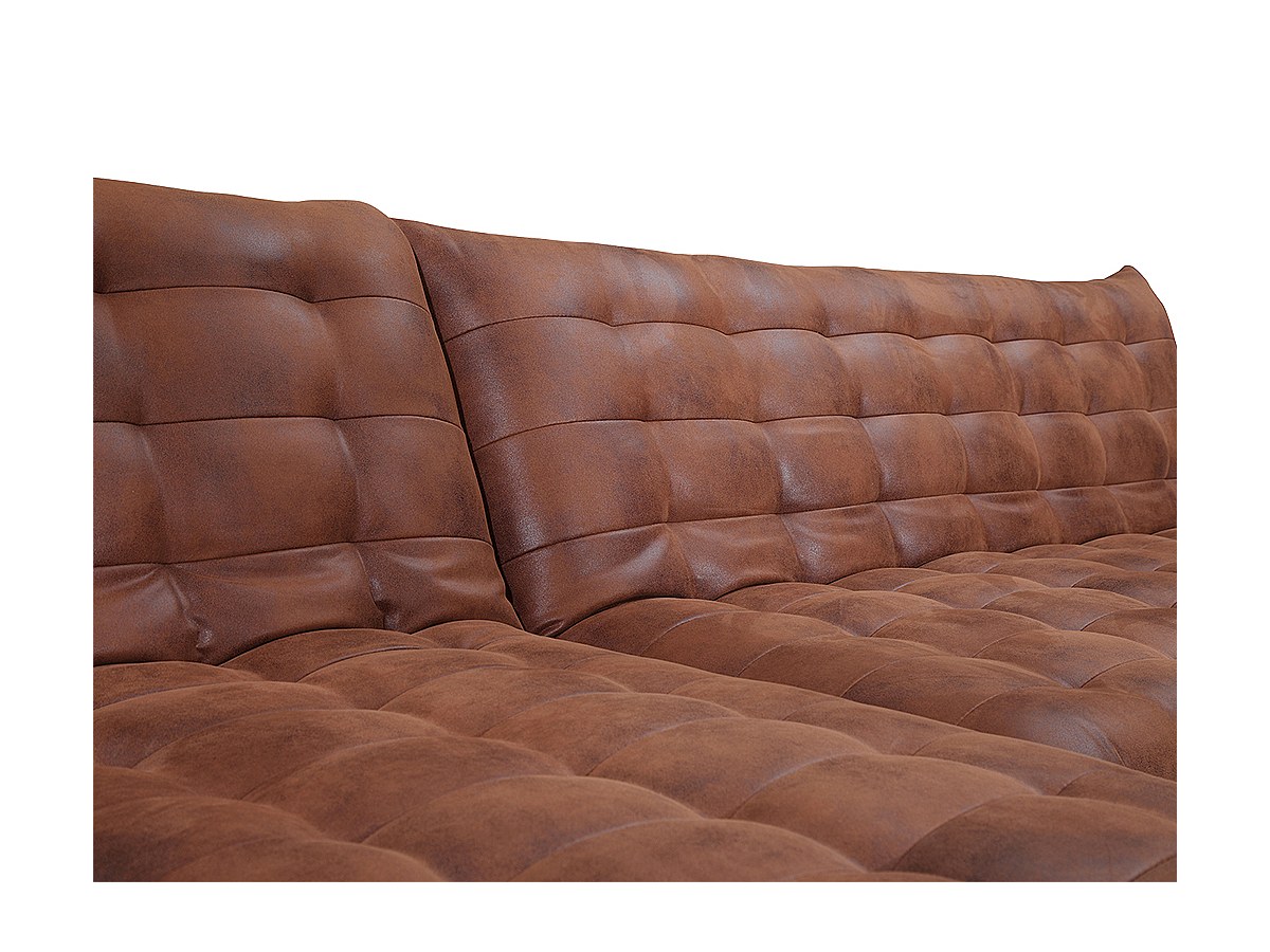 Tissu coloris caramel vintage, bleu ou violine. Assise et dossier garnis de mousse polyuréthane. Densité d'assise : 50 kg/m³ ,18 kg/m³ et 10 kg/m³. Densité du dossier : 50 kg/m³ et 10 kg/m³. Suspension de l'assise et du dossier sur ressorts hélicoïdaux et sangles élastiques entrecroisées. Structure bois. Pieds métal. 3 coussins assortis offerts.
